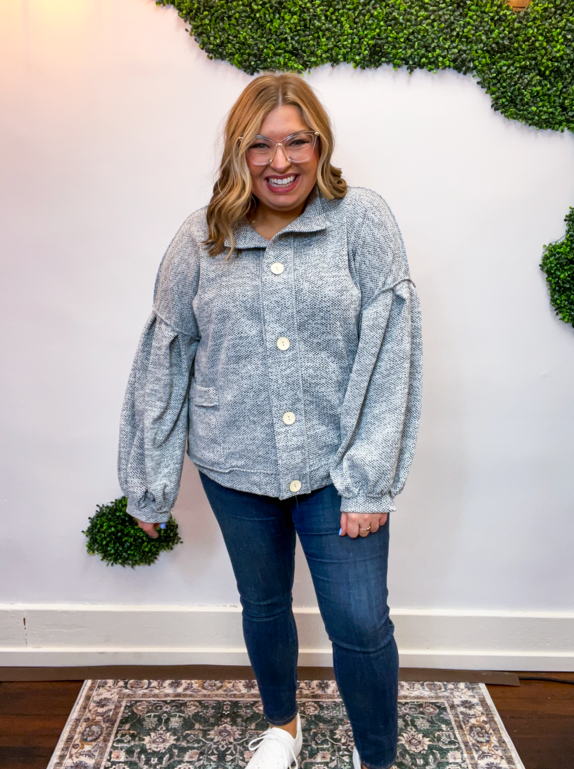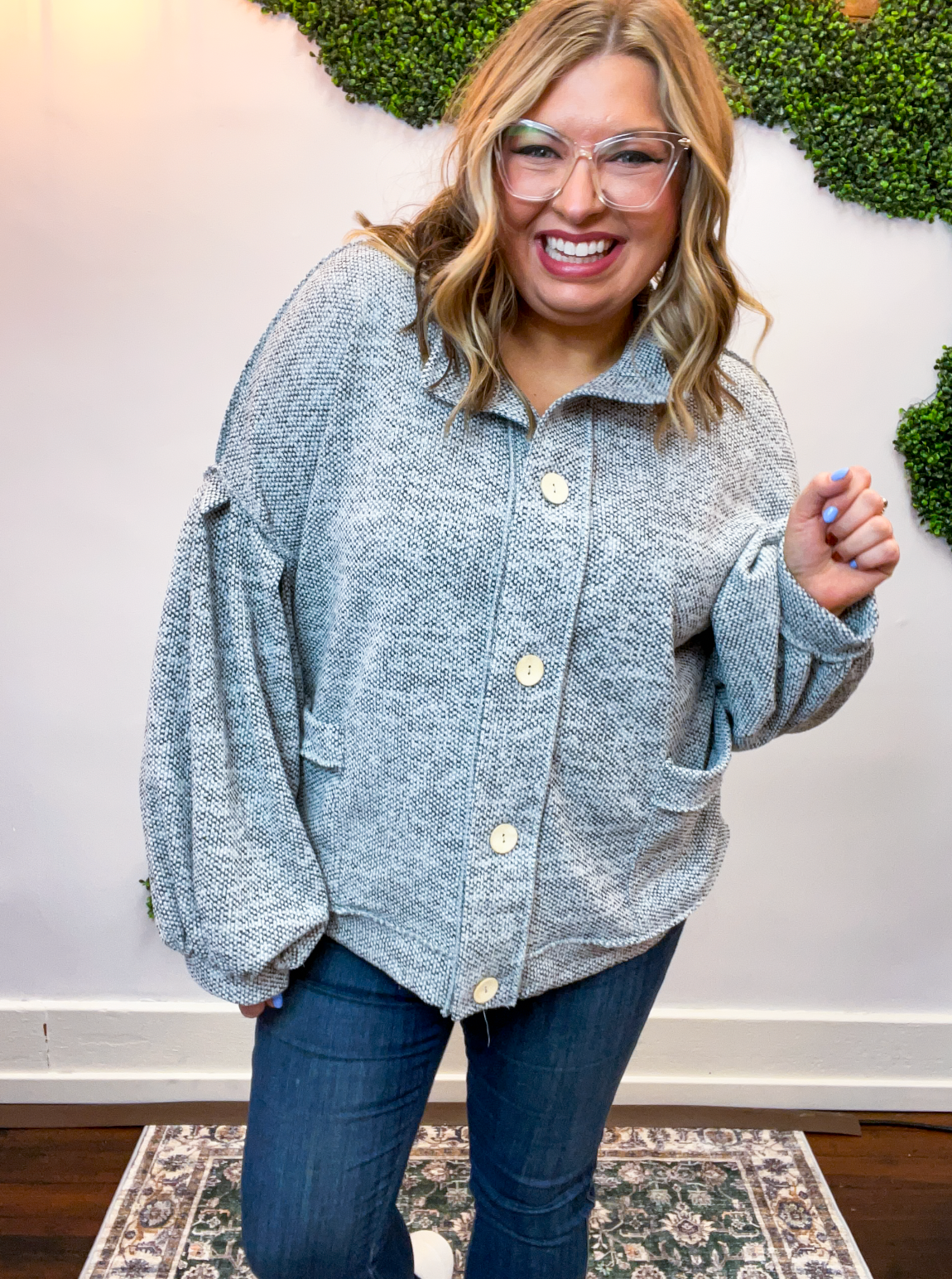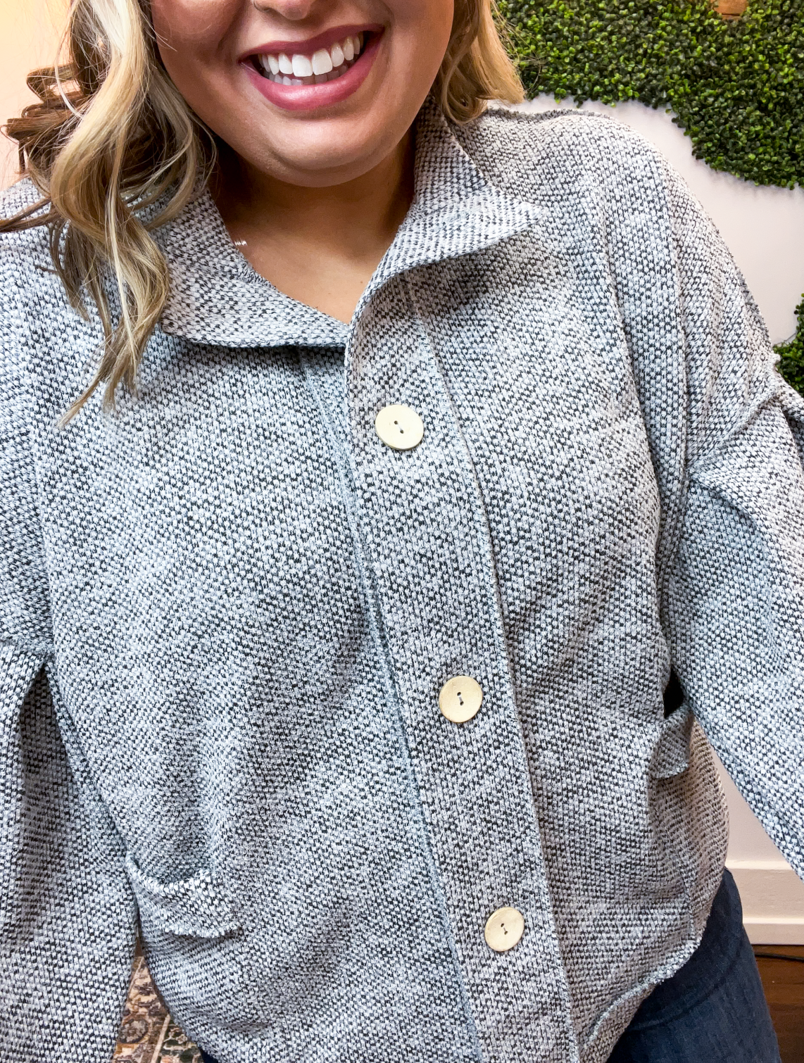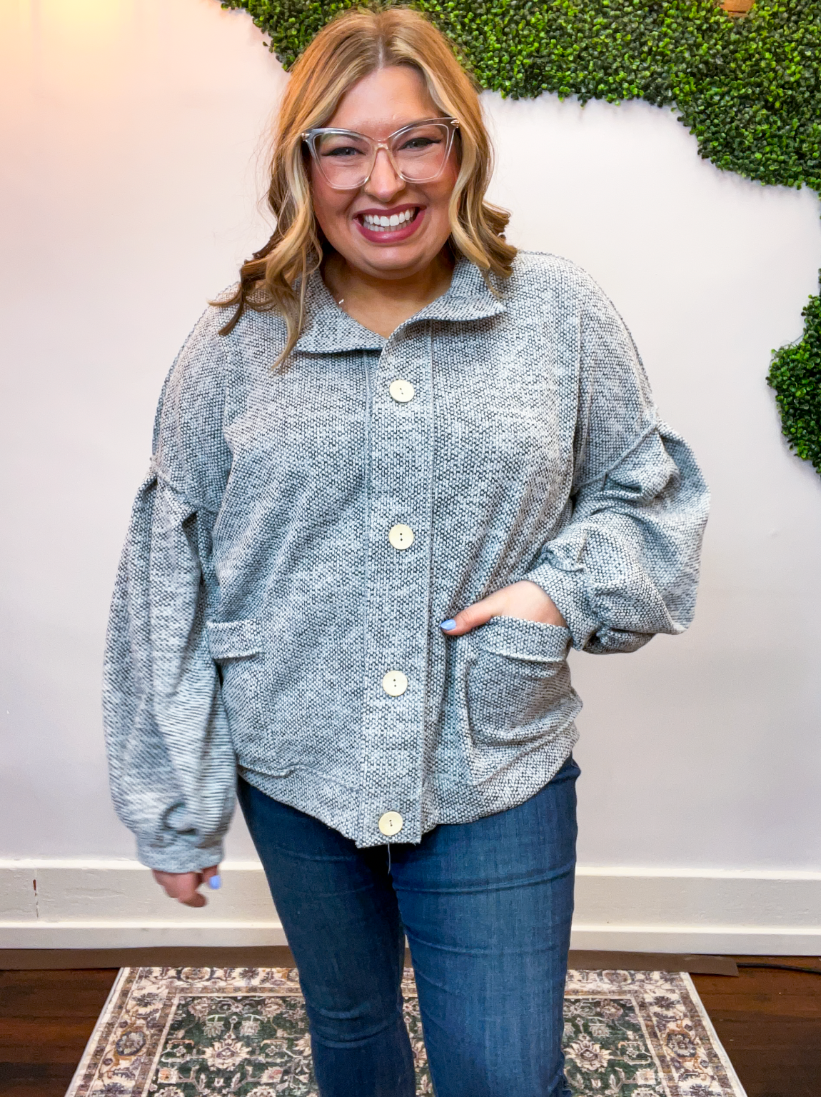 The Bundled Up Button Cardigan is the ultimate “throw it on and feel cute instantly” kind of layer. With its soft, textured knit and perfectly relaxed fit, it’s made for cozy days that still call for a little style. The roomy balloon sleeves and easy button-front design give it that laid-back charm, while the front pockets (because yes, pockets make everything better 🙌) make it as practical as it is cute.