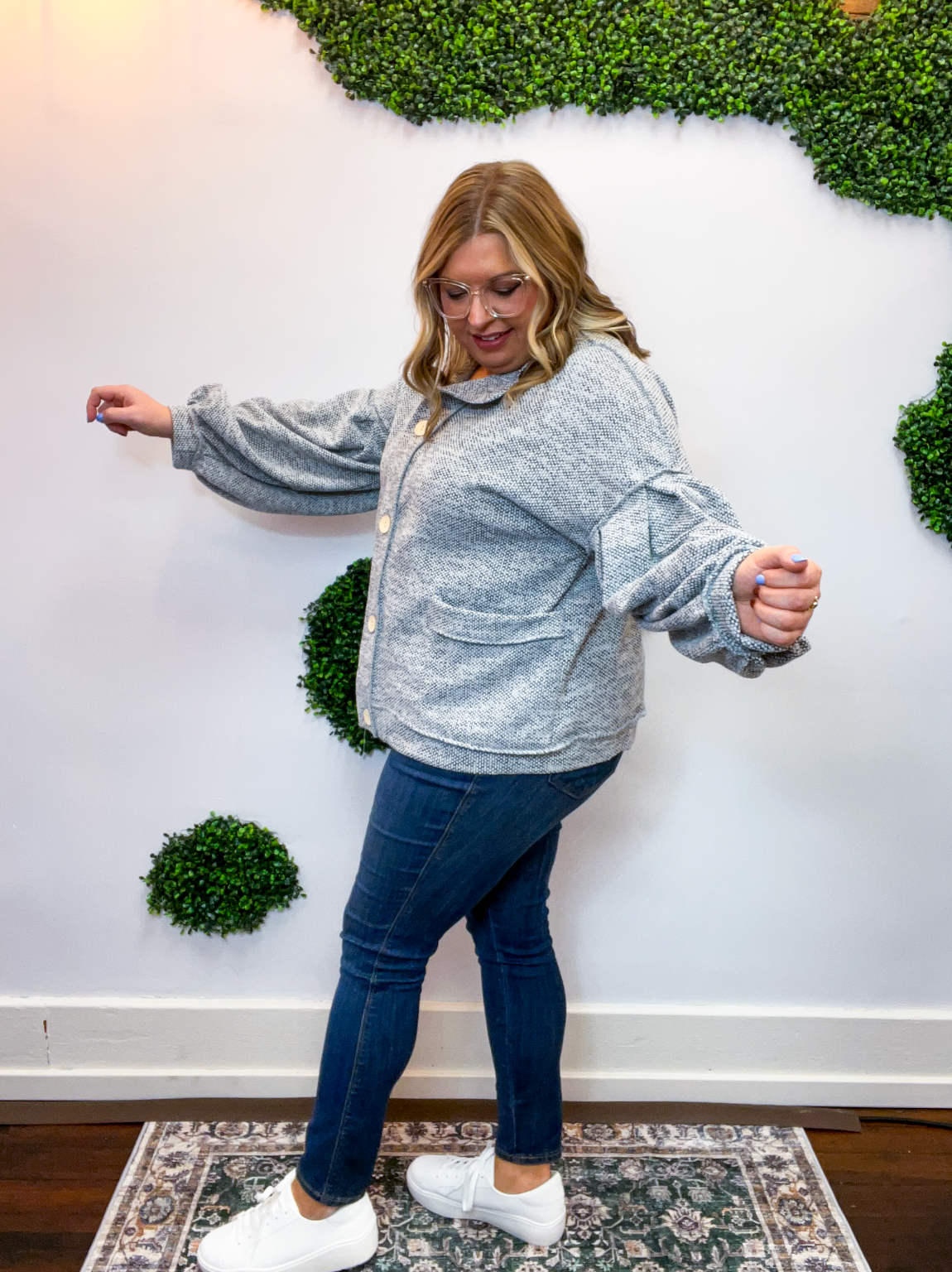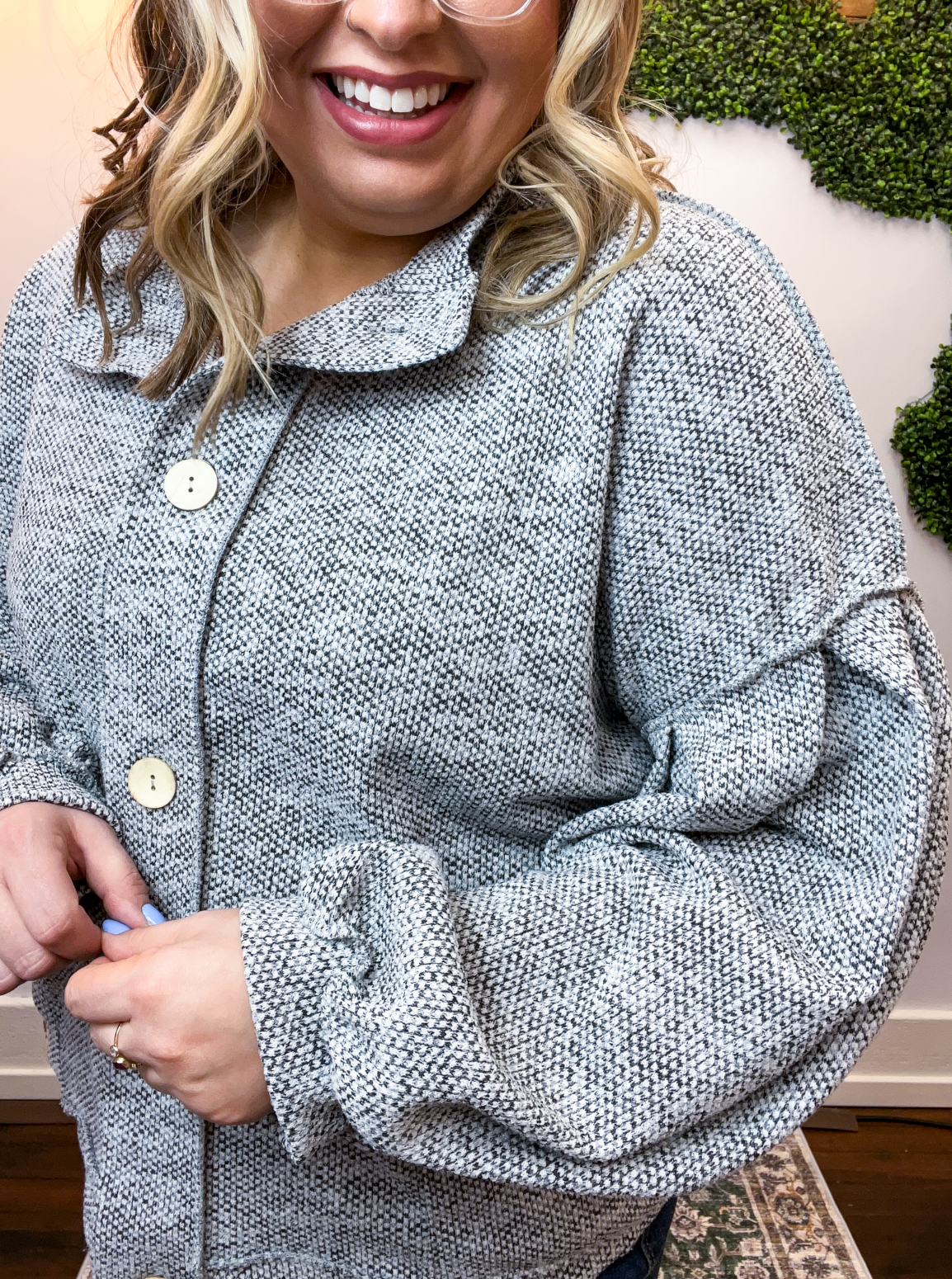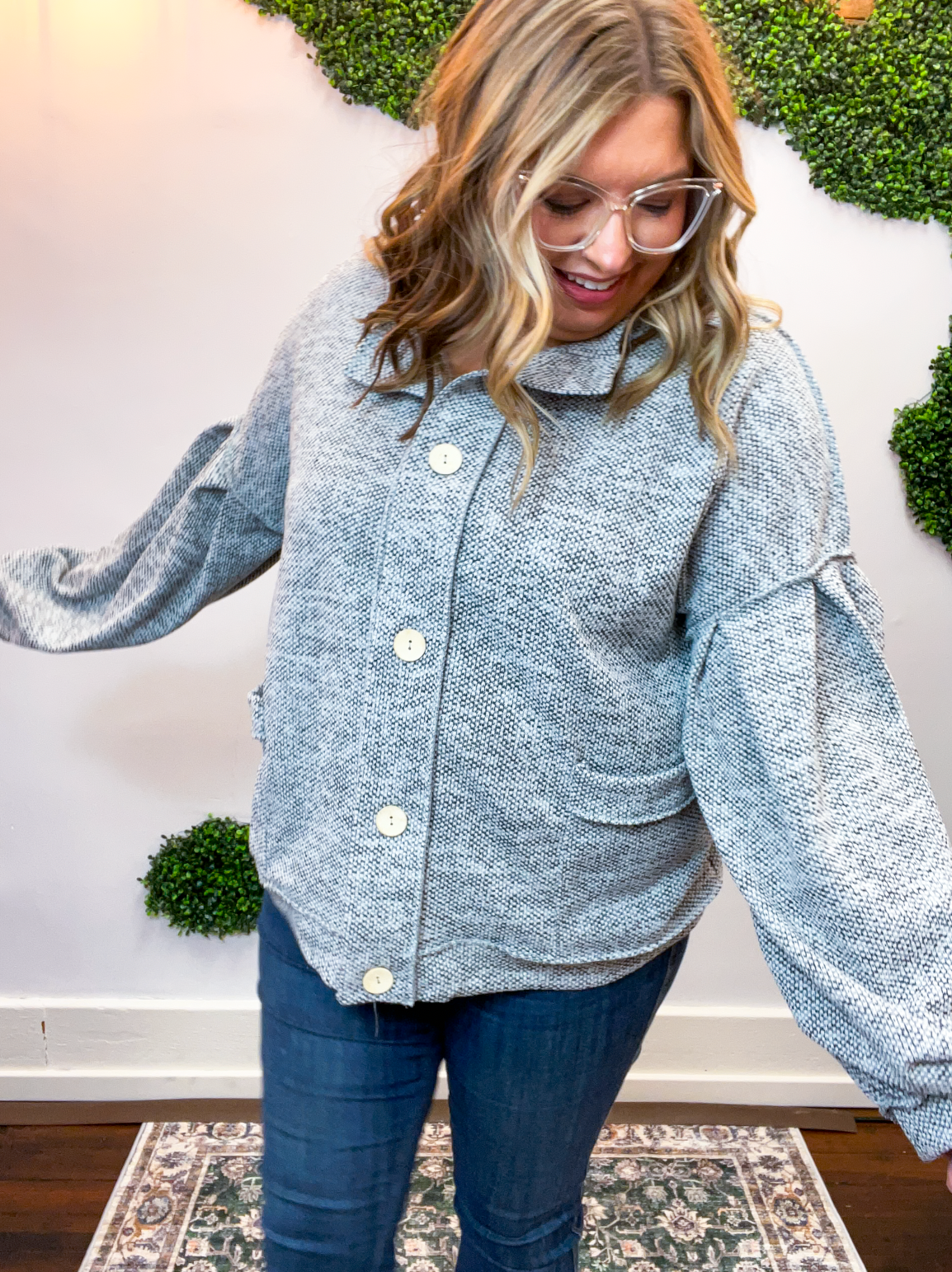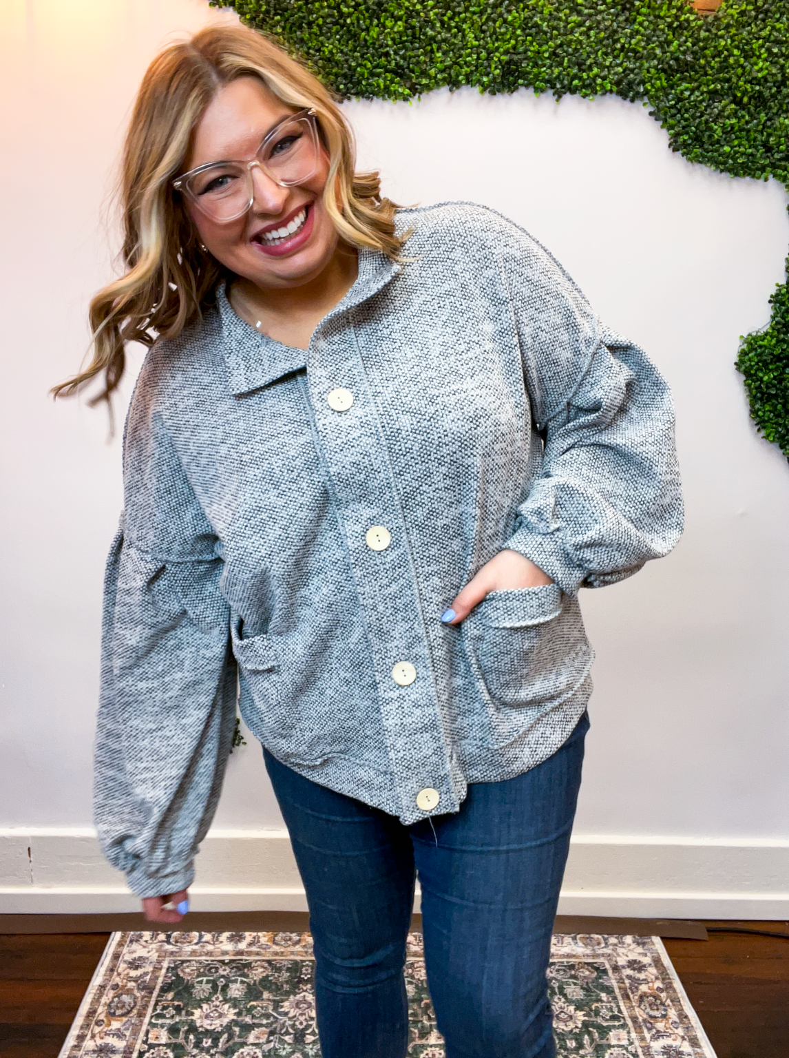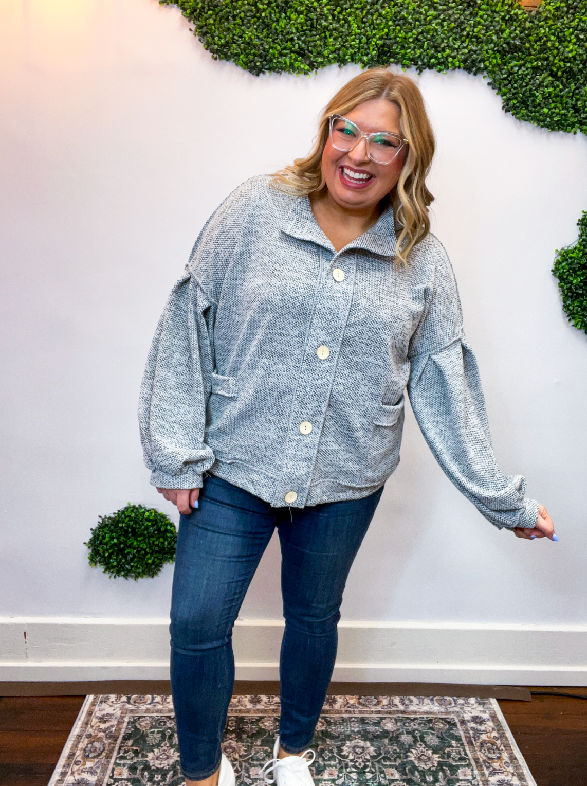 The Bundled Up Button Cardigan is the ultimate “throw it on and feel cute instantly” kind of layer. With its soft, textured knit and perfectly relaxed fit, it’s made for cozy days that still call for a little style. The roomy balloon sleeves and easy button-front design give it that laid-back charm, while the front pockets (because yes, pockets make everything better 🙌) make it as practical as it is cute.