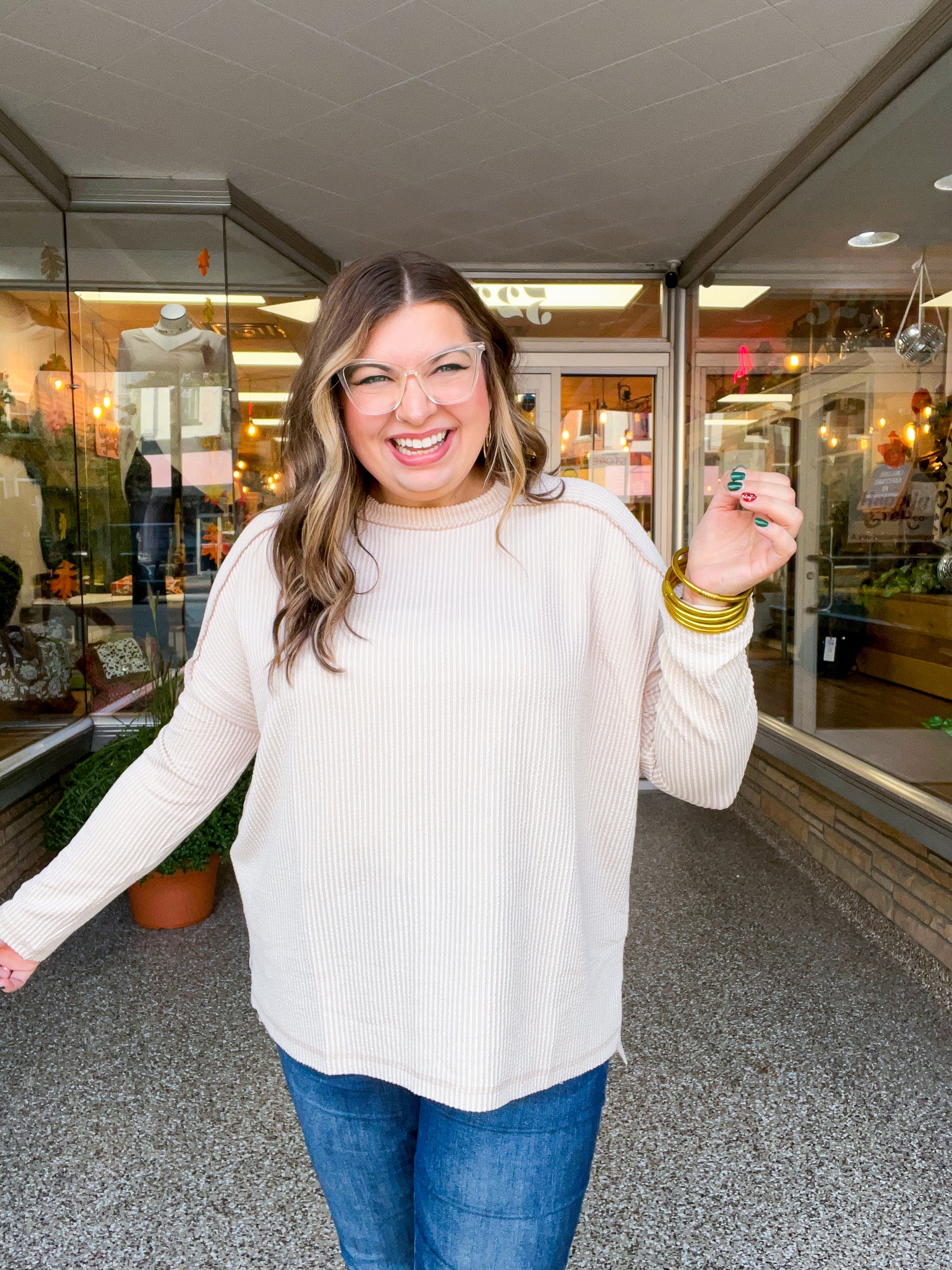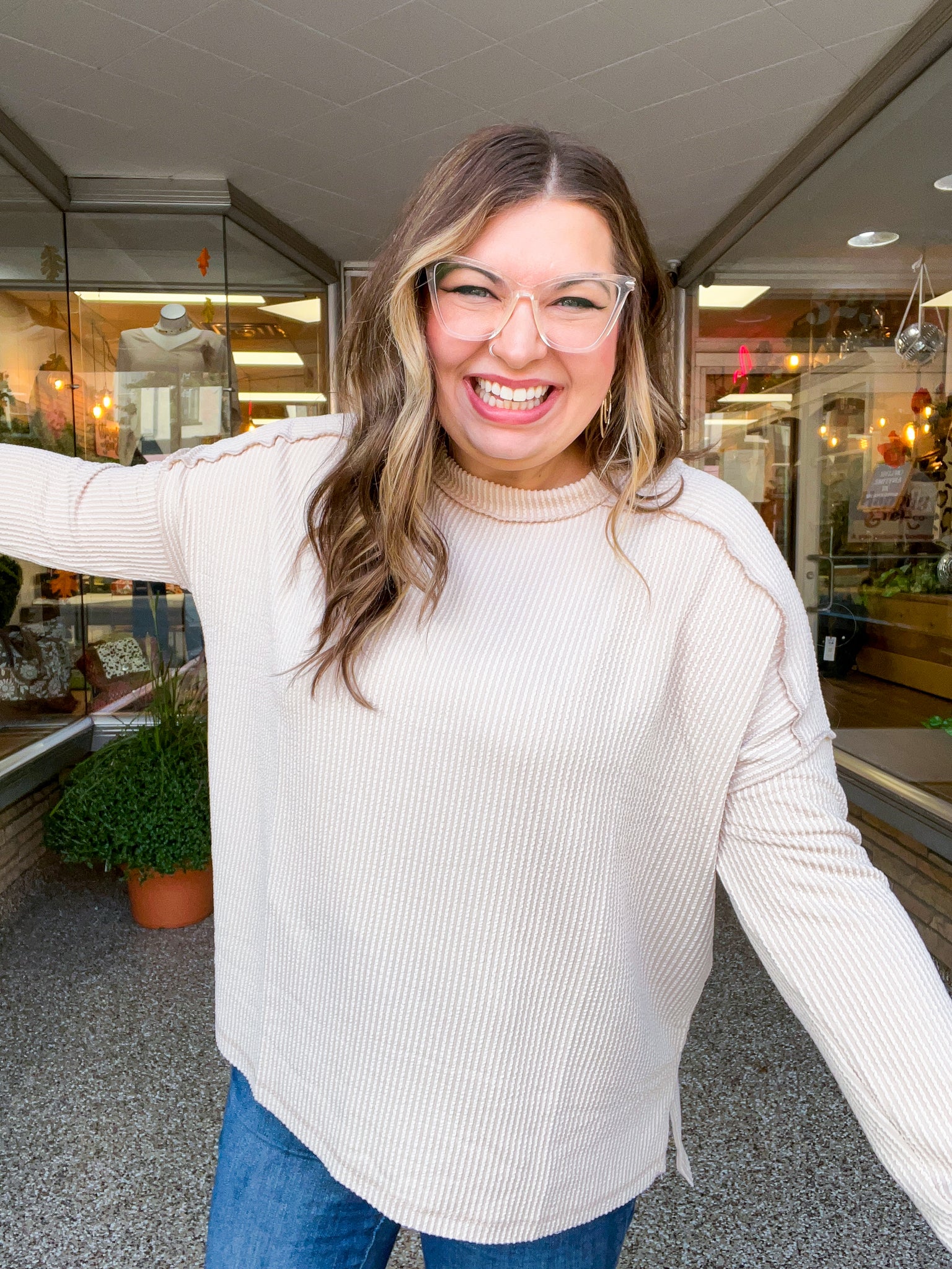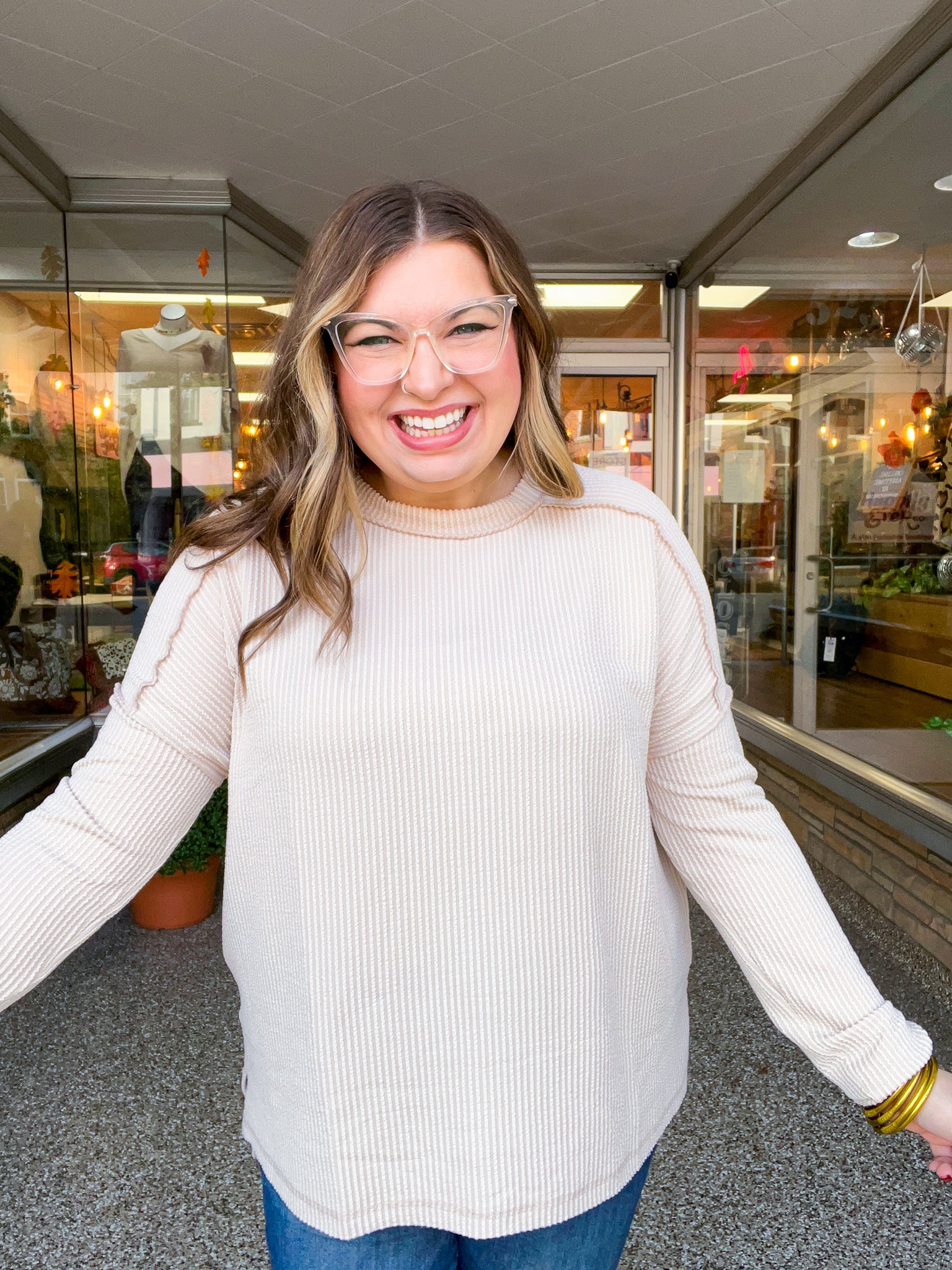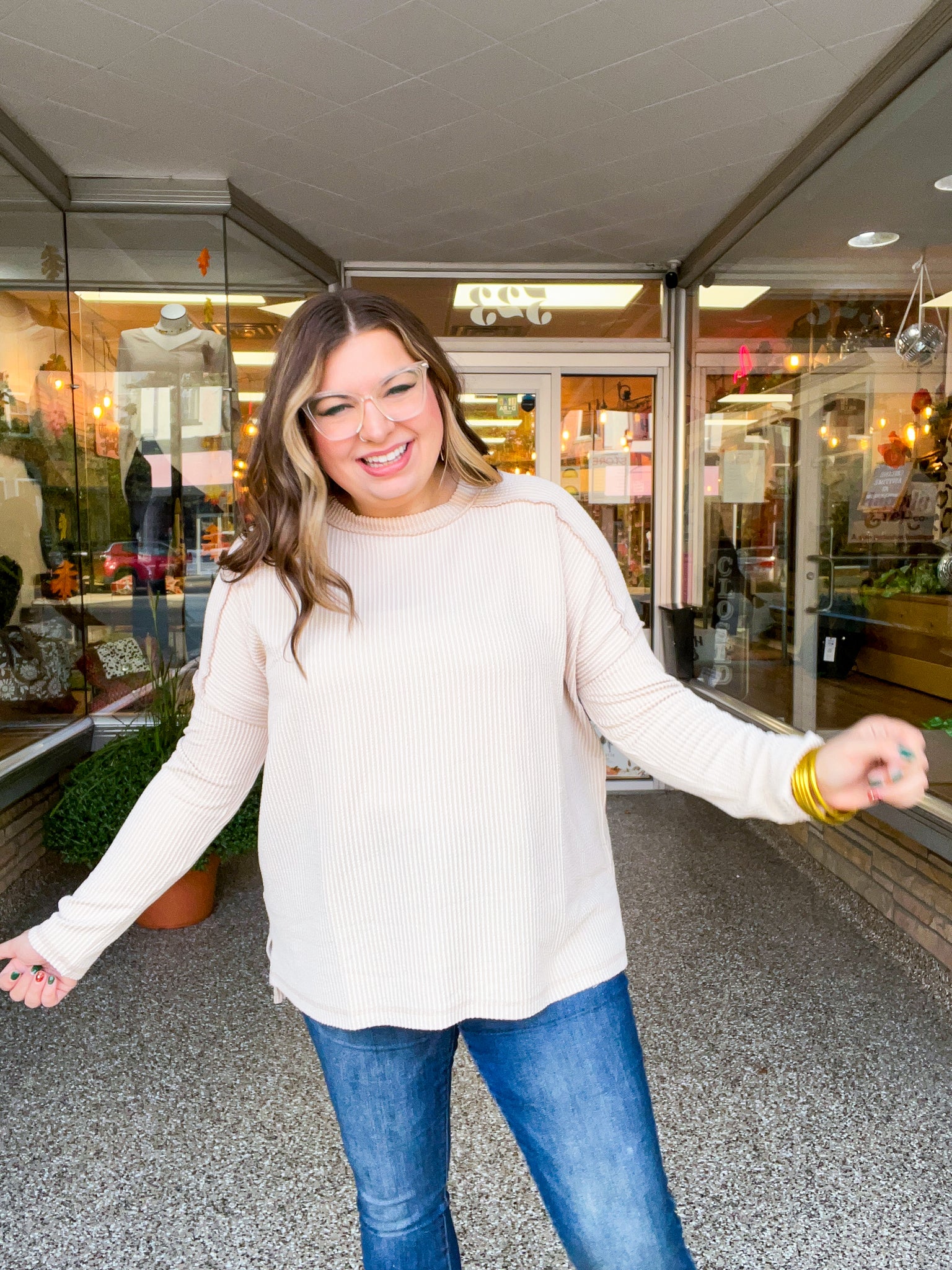 The Textured Take Raised Rib Long Sleeve Top in Sand Beige