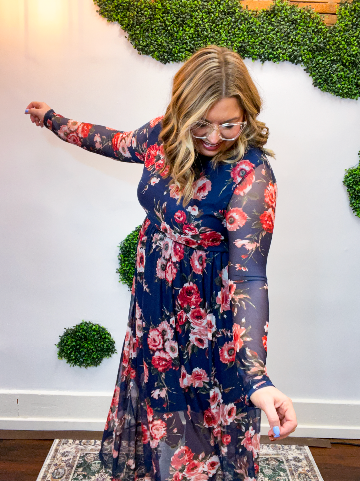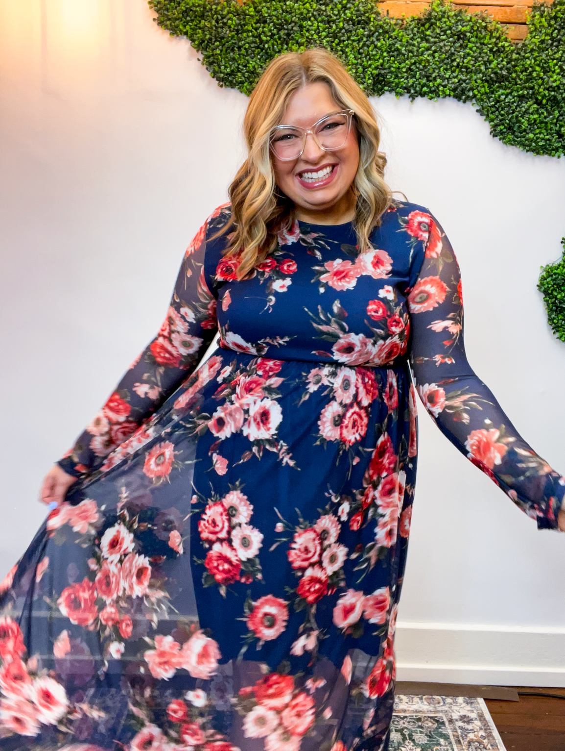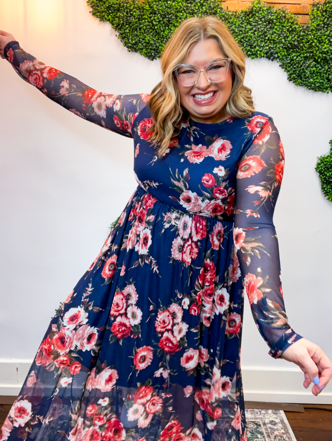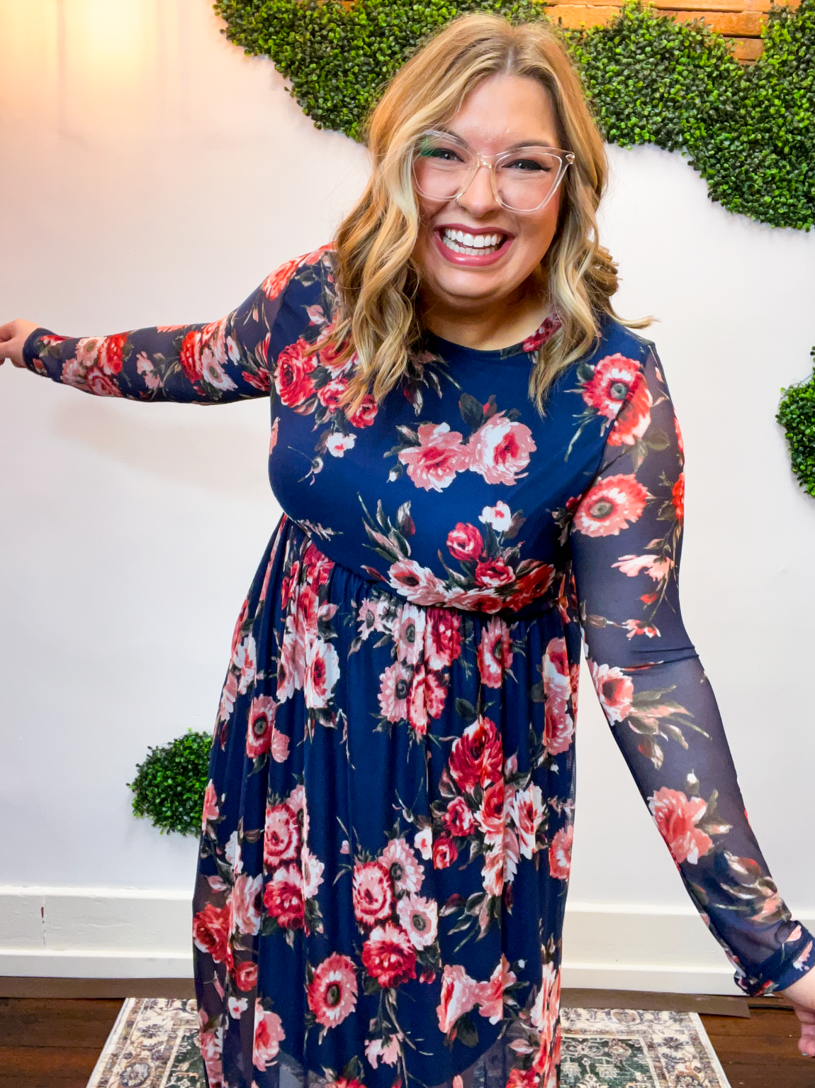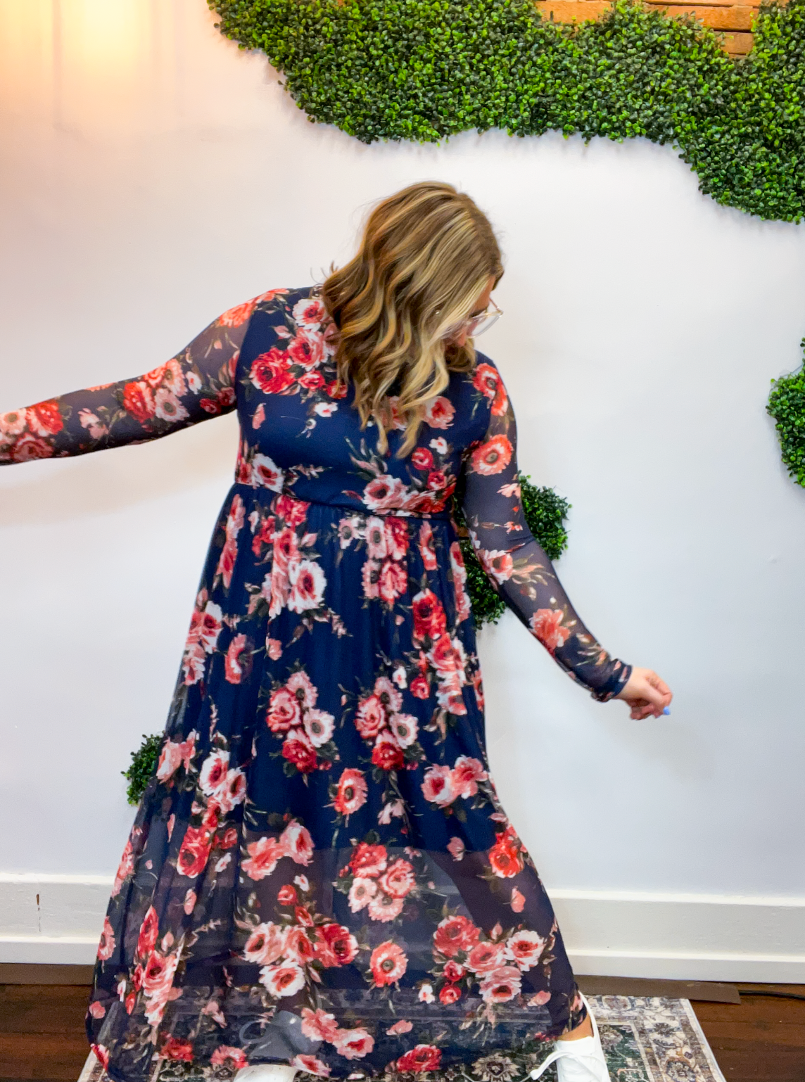 The Midnight Rose Garden Mesh Dress is pure romance in dress form — soft, flowy, and made for those twirl-worthy moments. With its navy mesh overlay and blooming rose print, this midi brings effortless elegance with every step. The semi-sheer sleeves add a delicate, feminine touch, while the fully lined body keeps you feeling comfortable, confident, and completely at ease.