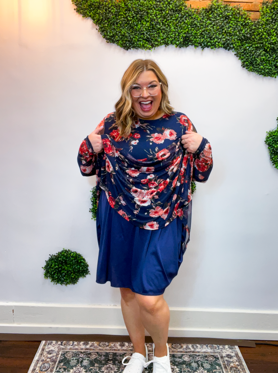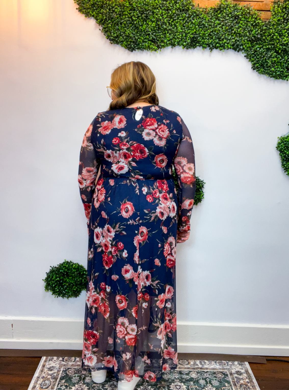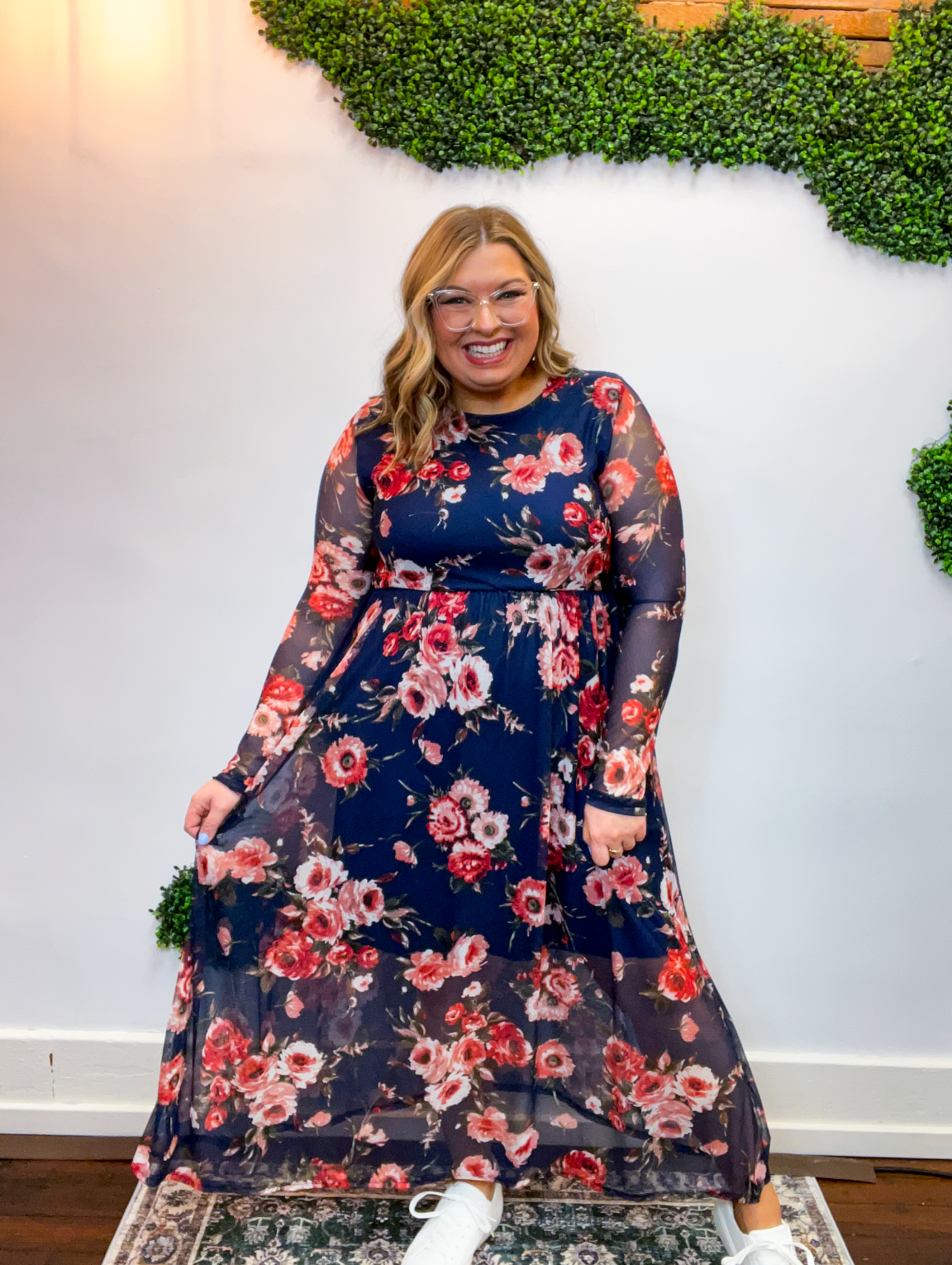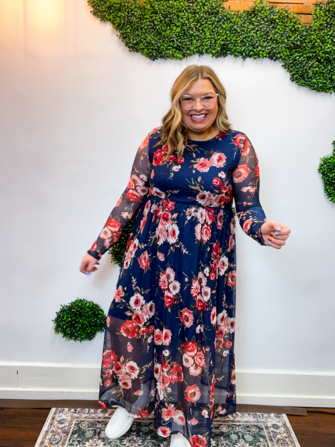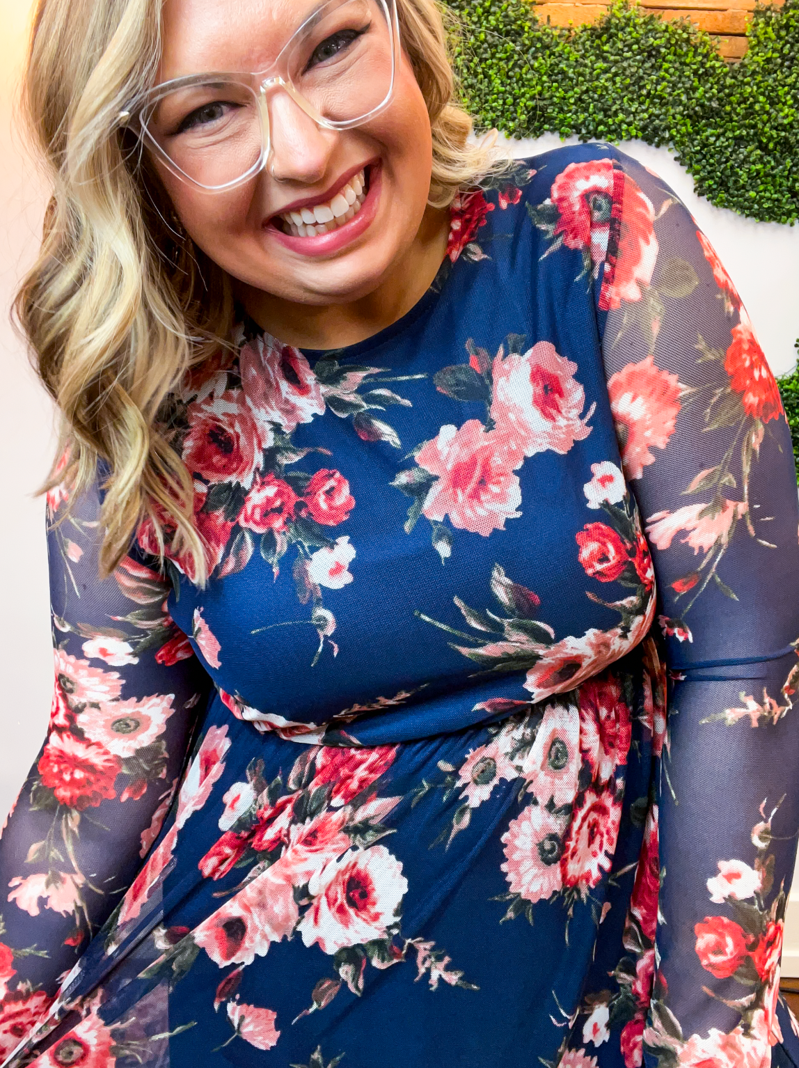 The Midnight Rose Garden Mesh Dress is pure romance in dress form — soft, flowy, and made for those twirl-worthy moments. With its navy mesh overlay and blooming rose print, this midi brings effortless elegance with every step. The semi-sheer sleeves add a delicate, feminine touch, while the fully lined body keeps you feeling comfortable, confident, and completely at ease.