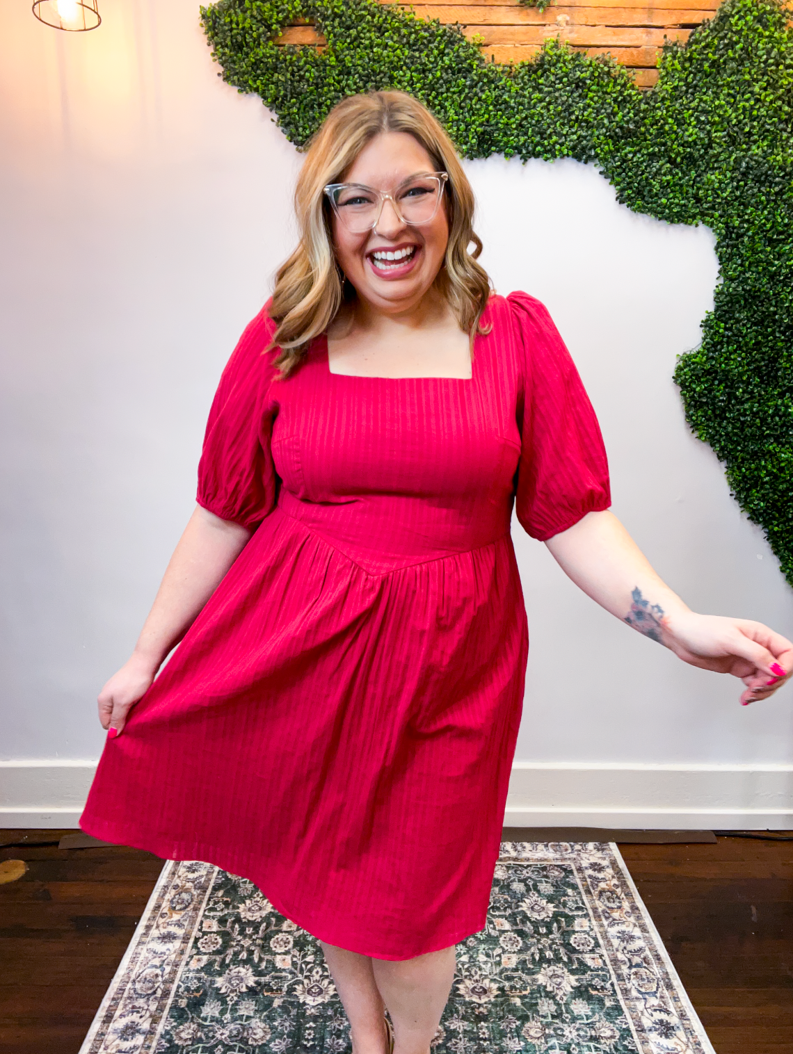 The Ever After Red Mini Dress is all about that flattering, feel-good fit. Designed with a shaped waist seam that gently cinches and defines, this dress creates a beautiful silhouette without ever feeling snug or restrictive. The adjustable back tie lets you customize the waist just the way you like, while the soft puff sleeves and classic square neckline keep it sweet, timeless, and endlessly wearable.