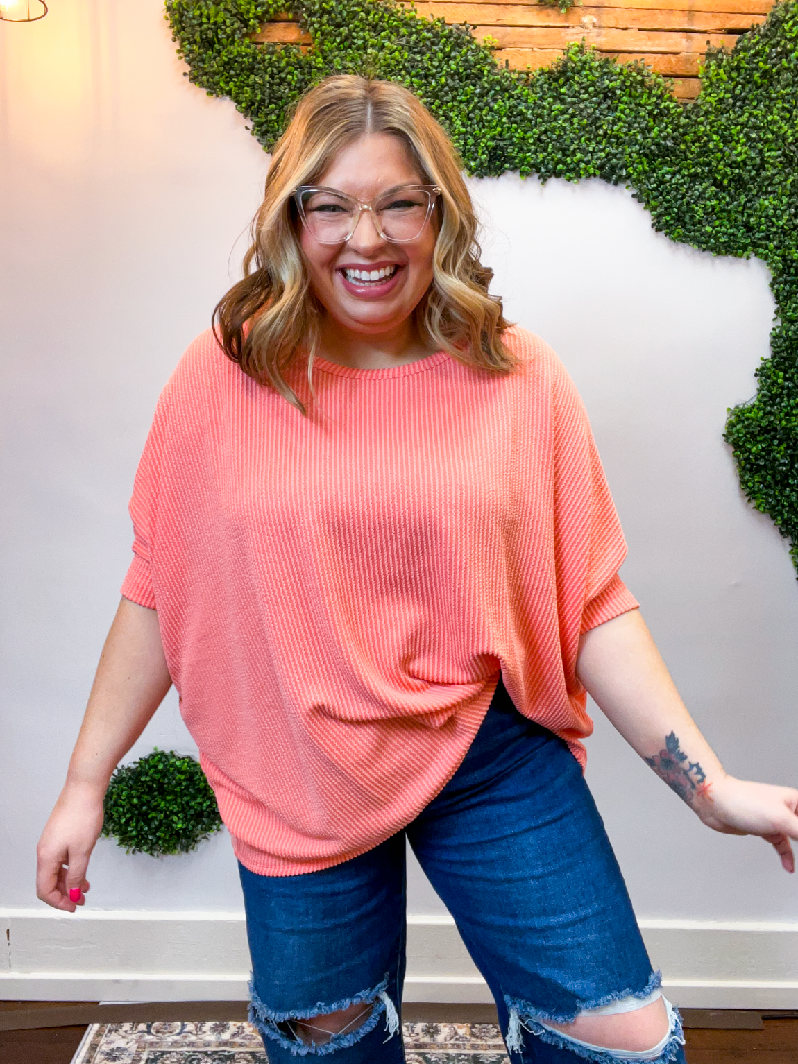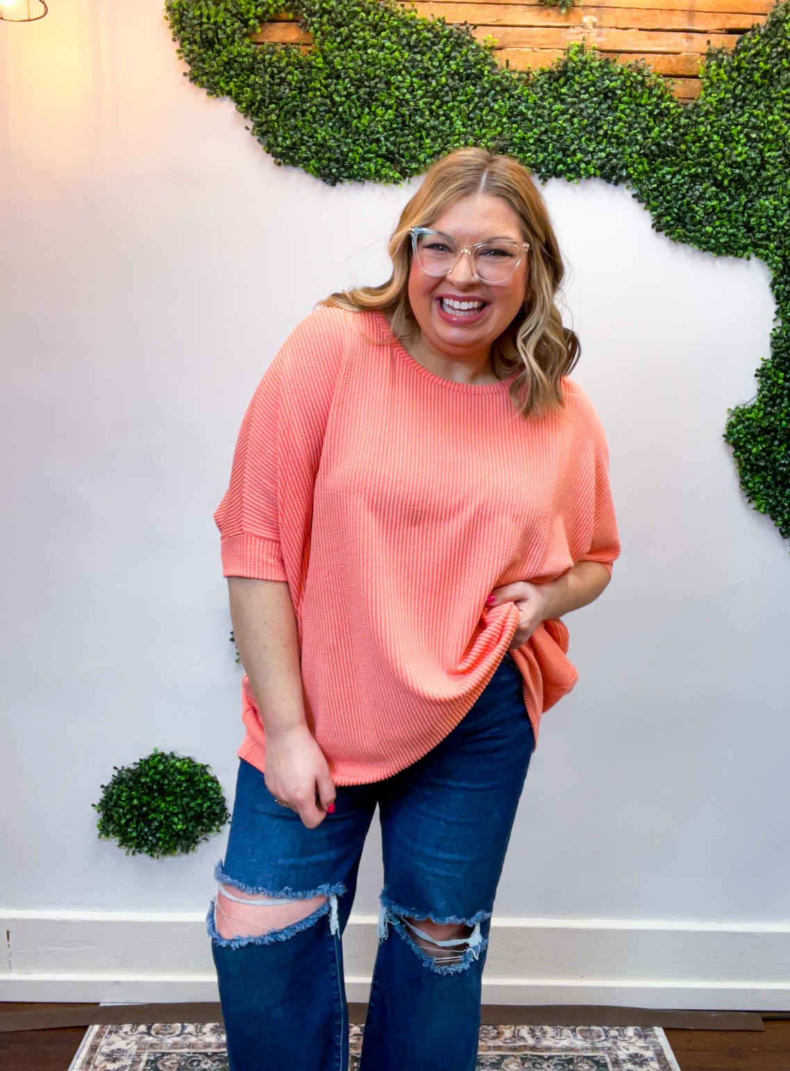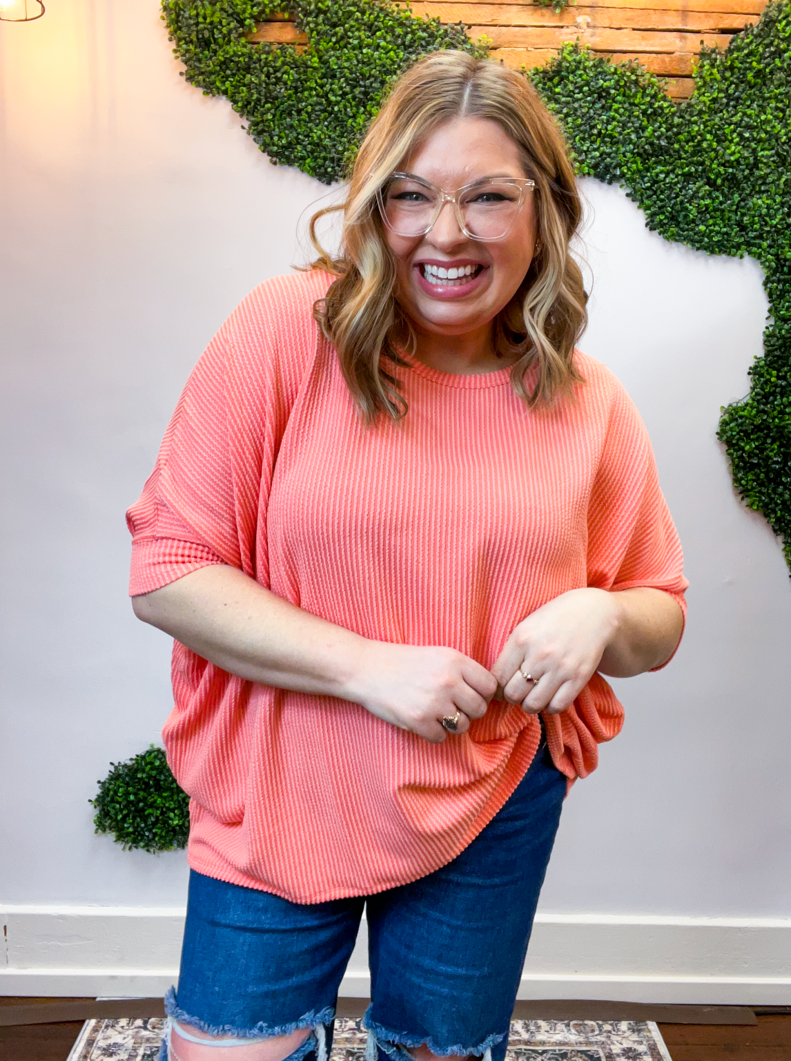 Lightweight, breathable, and just a touch elevated, this top feels comfy enough for lounging yet polished enough for heading out. The raised rib knit gives it a little extra dimension, making it one of those simple pieces that still feels special. Pair it with jeans, leggings, or even shorts when the Midwest decides to change seasons midweek — it’s cute, comfy, and ready for whatever your day brings.