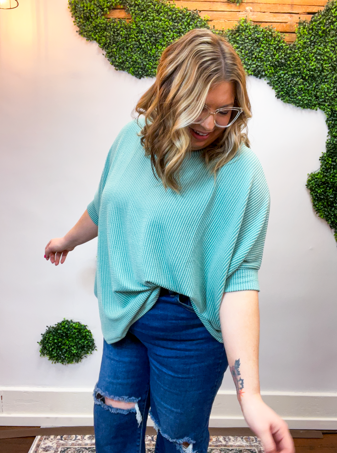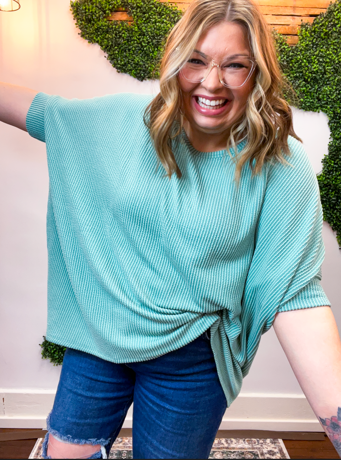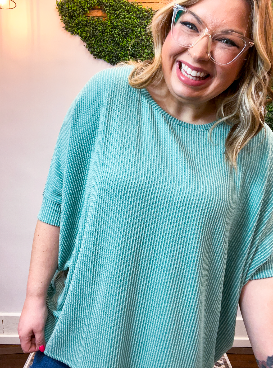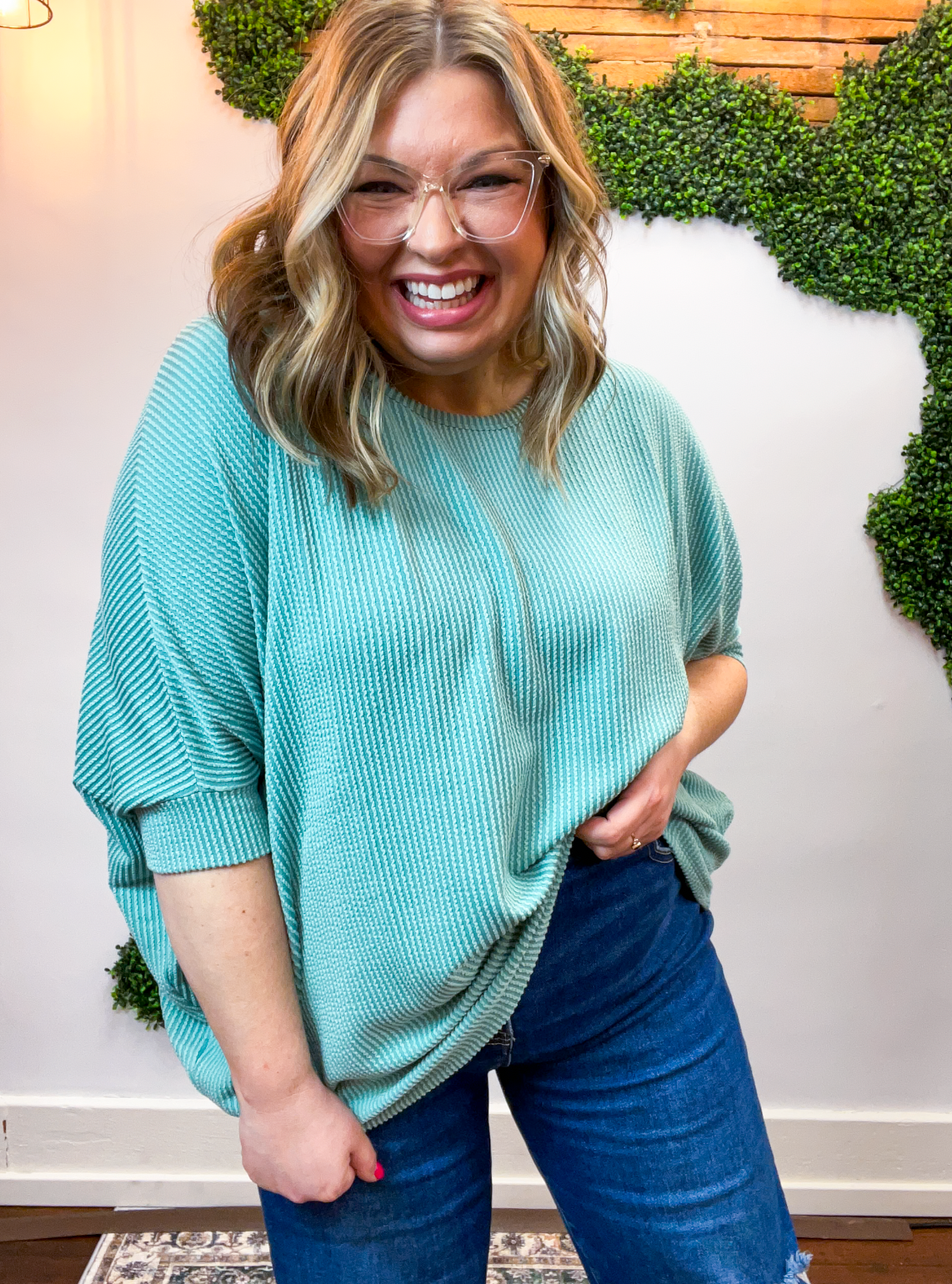 Lightweight, breathable, and just a touch elevated, this top feels comfy enough for lounging yet polished enough for heading out. The raised rib knit gives it a little extra dimension, making it one of those simple pieces that still feels special. Pair it with jeans, leggings, or even shorts when the Midwest decides to change seasons midweek — it’s cute, comfy, and ready for whatever your day brings.