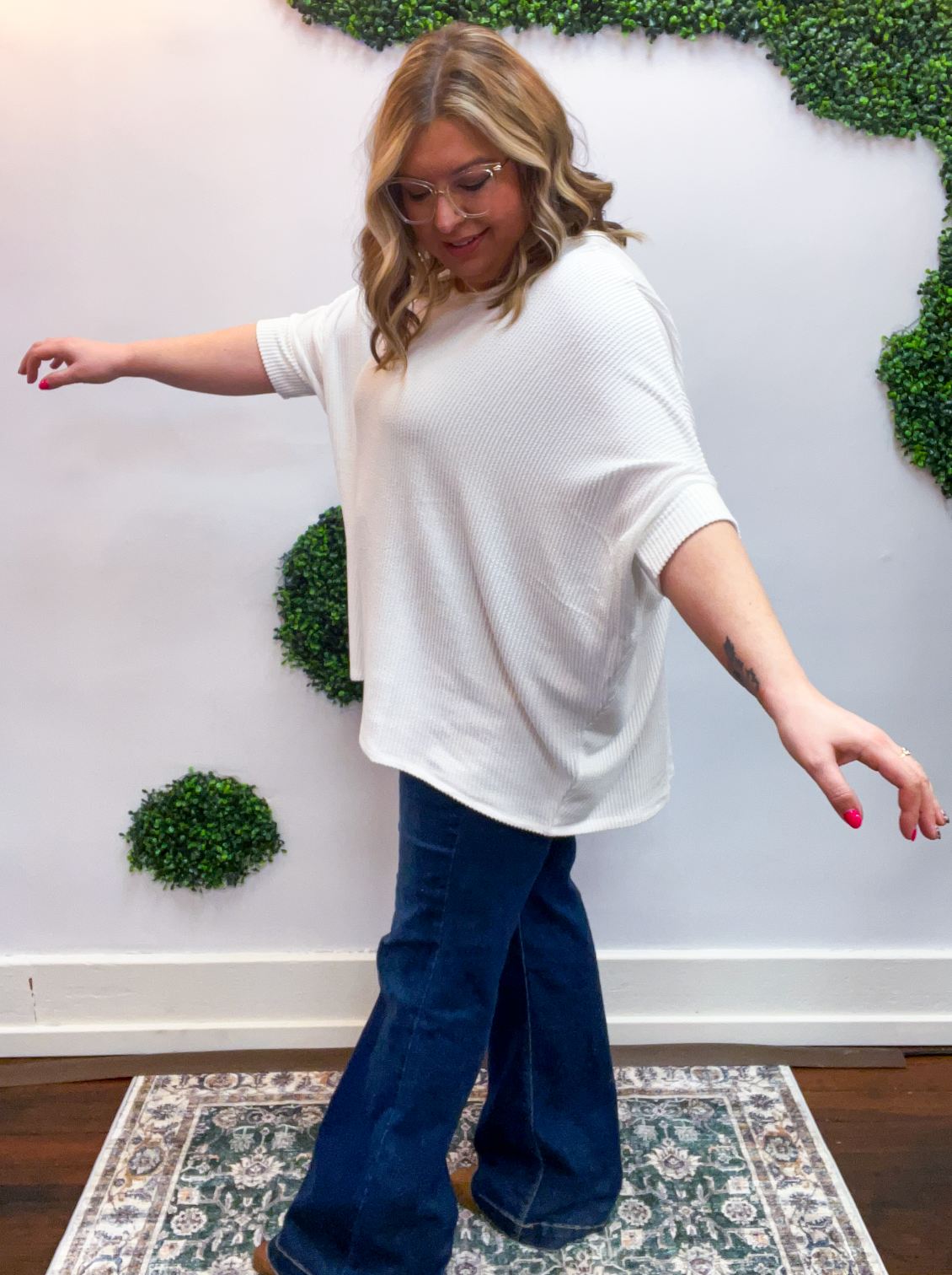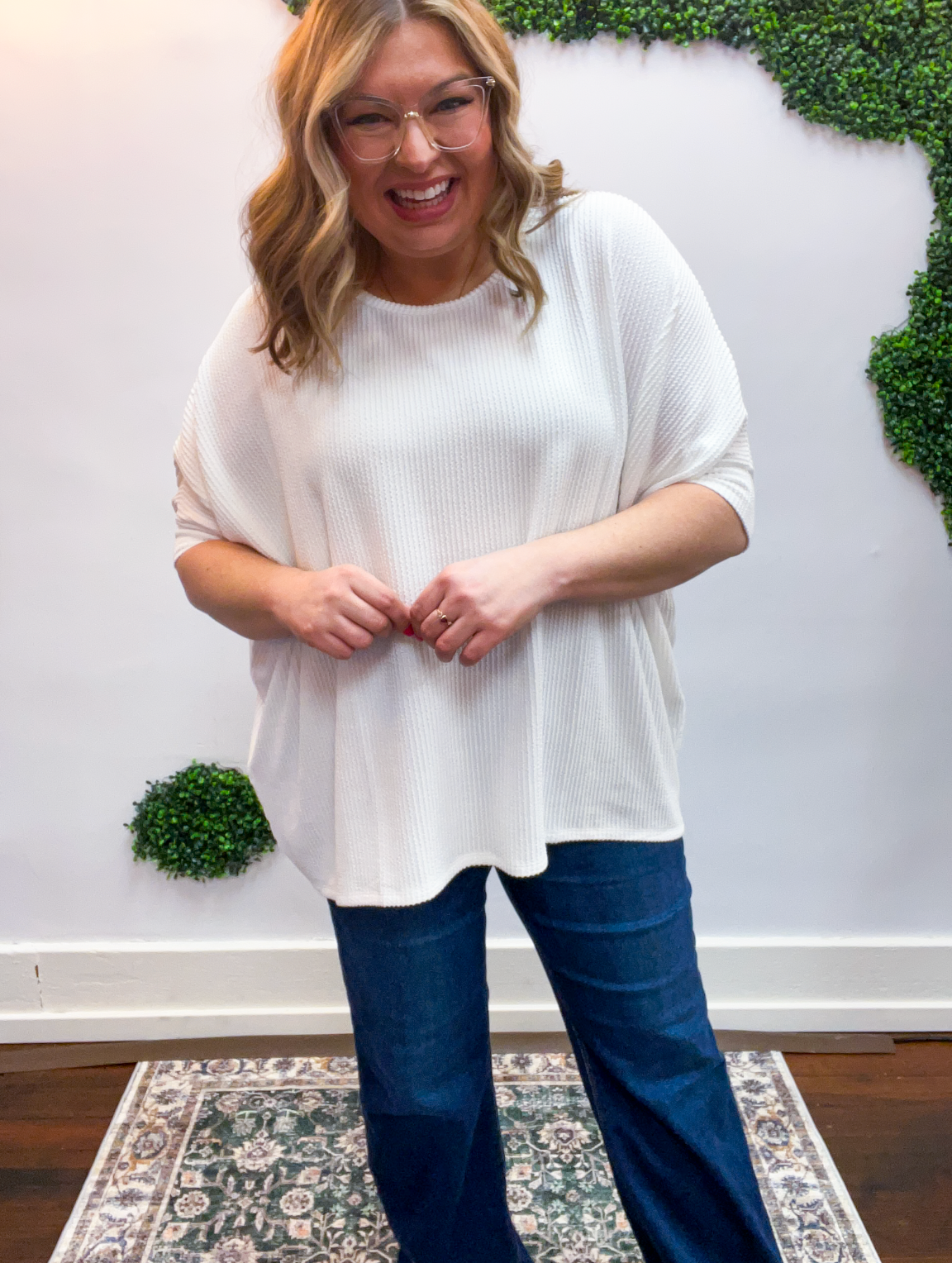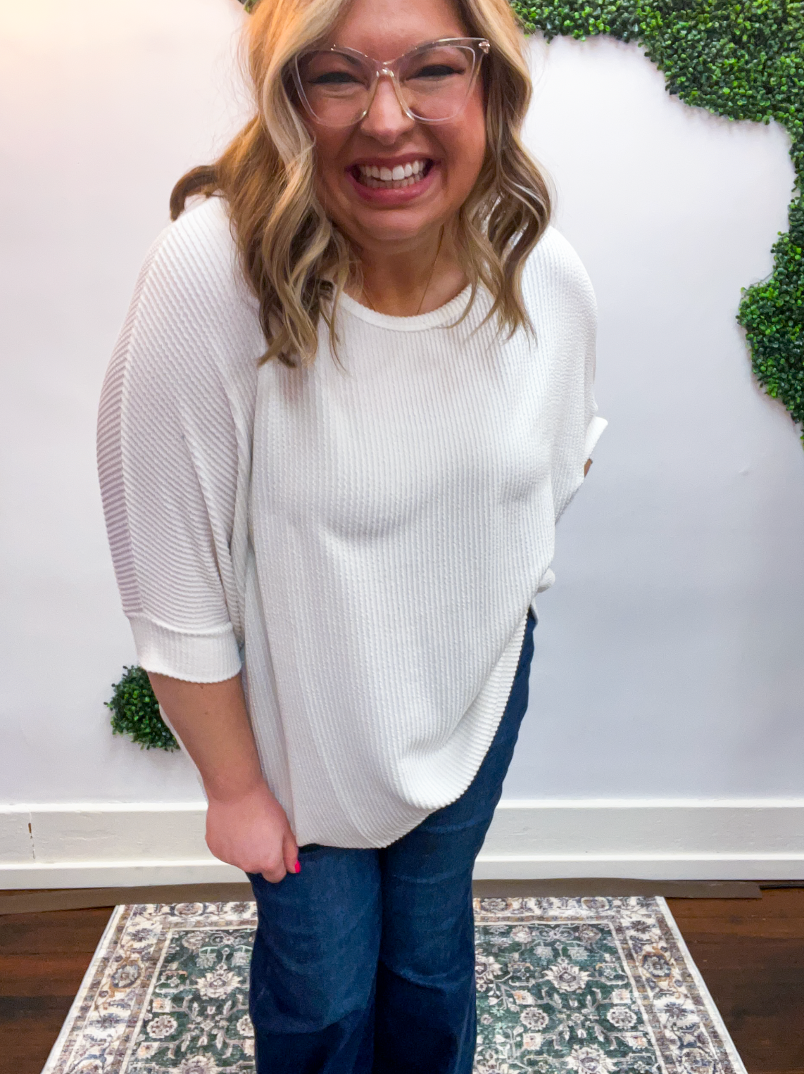 Lightweight, breathable, and just a touch elevated, this top feels comfy enough for lounging yet polished enough for heading out. The raised rib knit gives it a little extra dimension, making it one of those simple pieces that still feels special. Pair it with jeans, leggings, or even shorts when the Midwest decides to change seasons midweek — it’s cute, comfy, and ready for whatever your day brings.