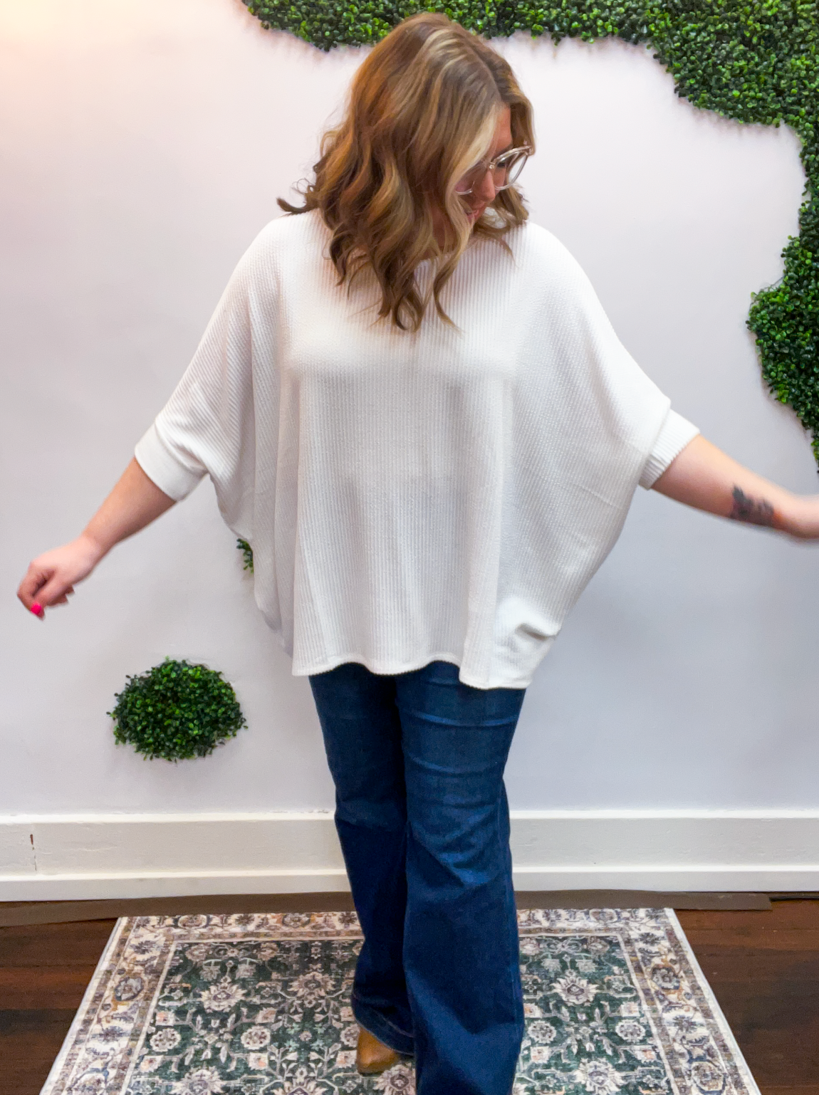 The Ribbed Breeze Batwing Top is that effortless, “throw it on and feel amazing” kind of favorite you’ll reach for time and time again. With its soft, stretchy ribbed texture and flowy batwing sleeves, it drapes beautifully for that relaxed, easygoing look we all love.