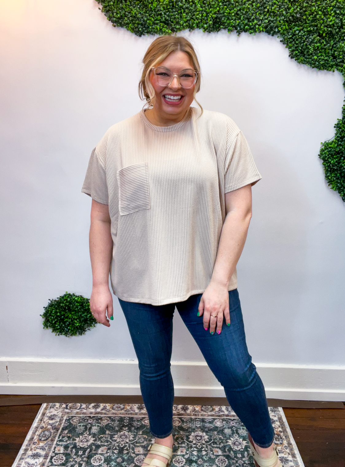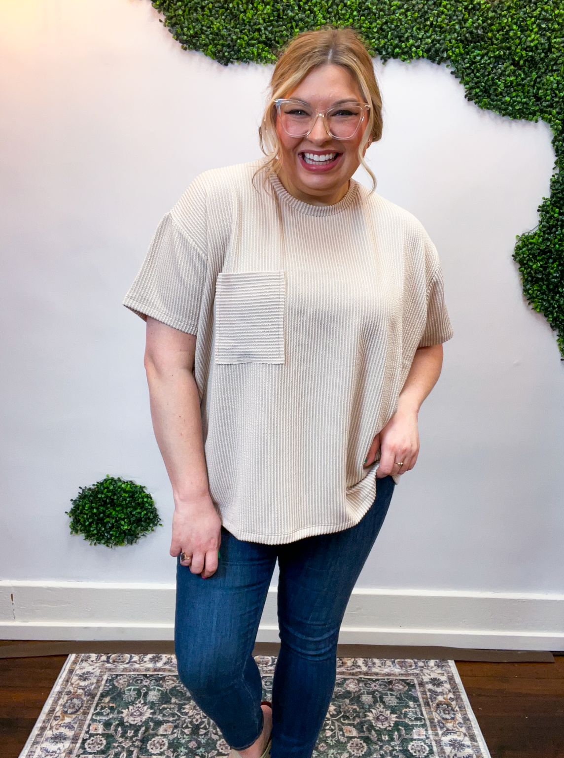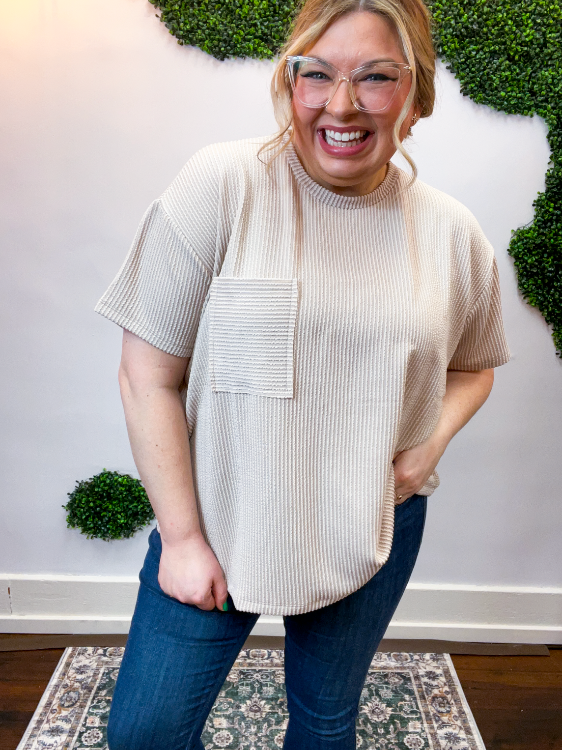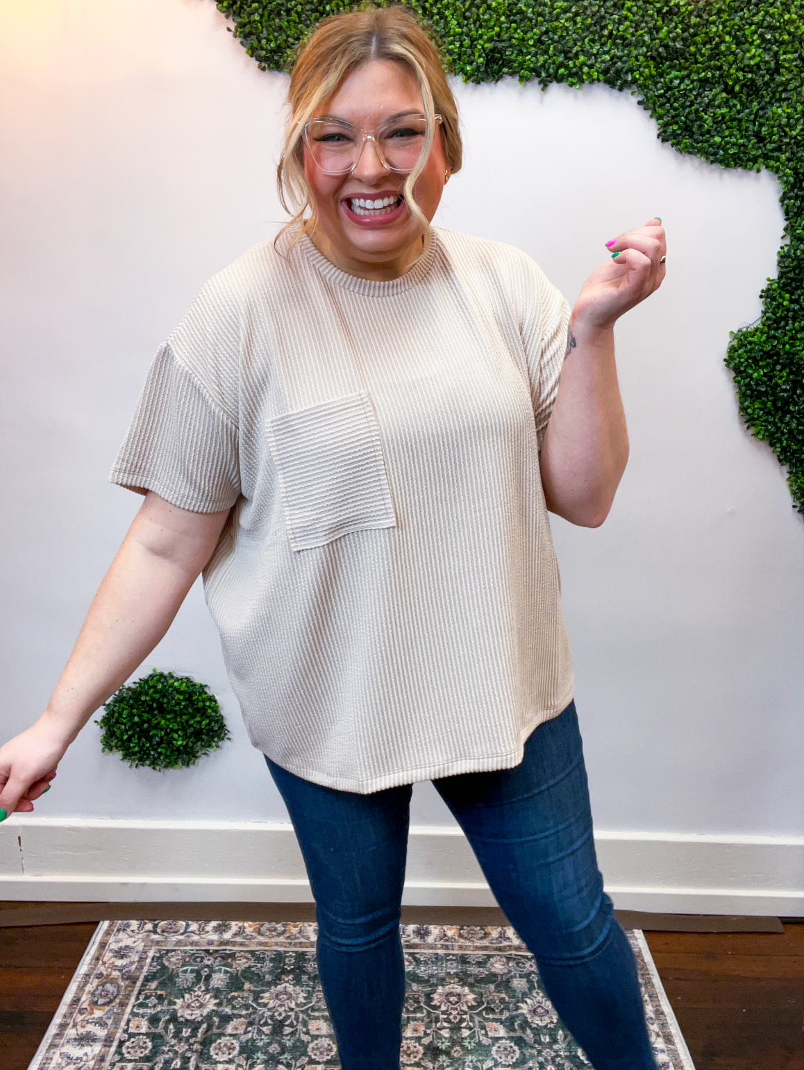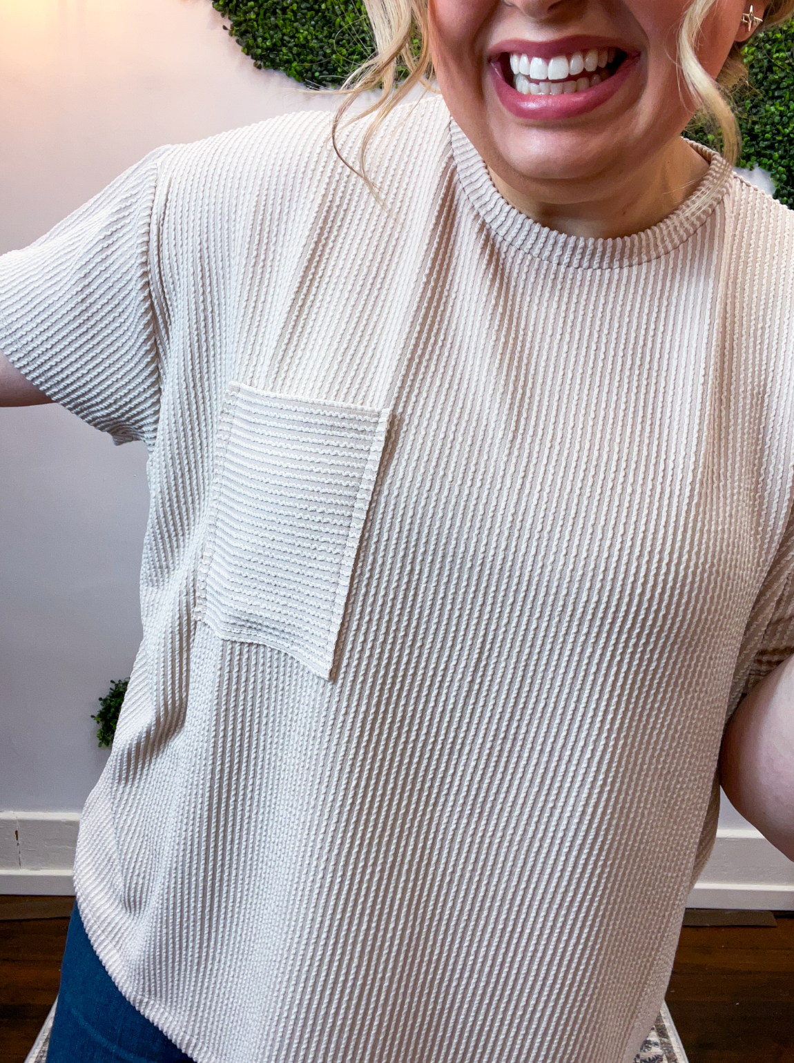 The Ripple & Relax Pocket Top is your new go-to for those “just want to feel comfy but still look cute” days. Made from a soft, wavy corded rib knit, it brings that perfect mix of texture, stretch, and easy-breezy comfort. The relaxed fit drapes beautifully for that effortless, laid-back vibe that works with anything — leggings, jeans, or even a quick front tuck with your favorite shorts.