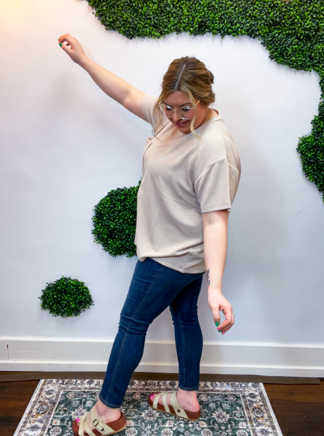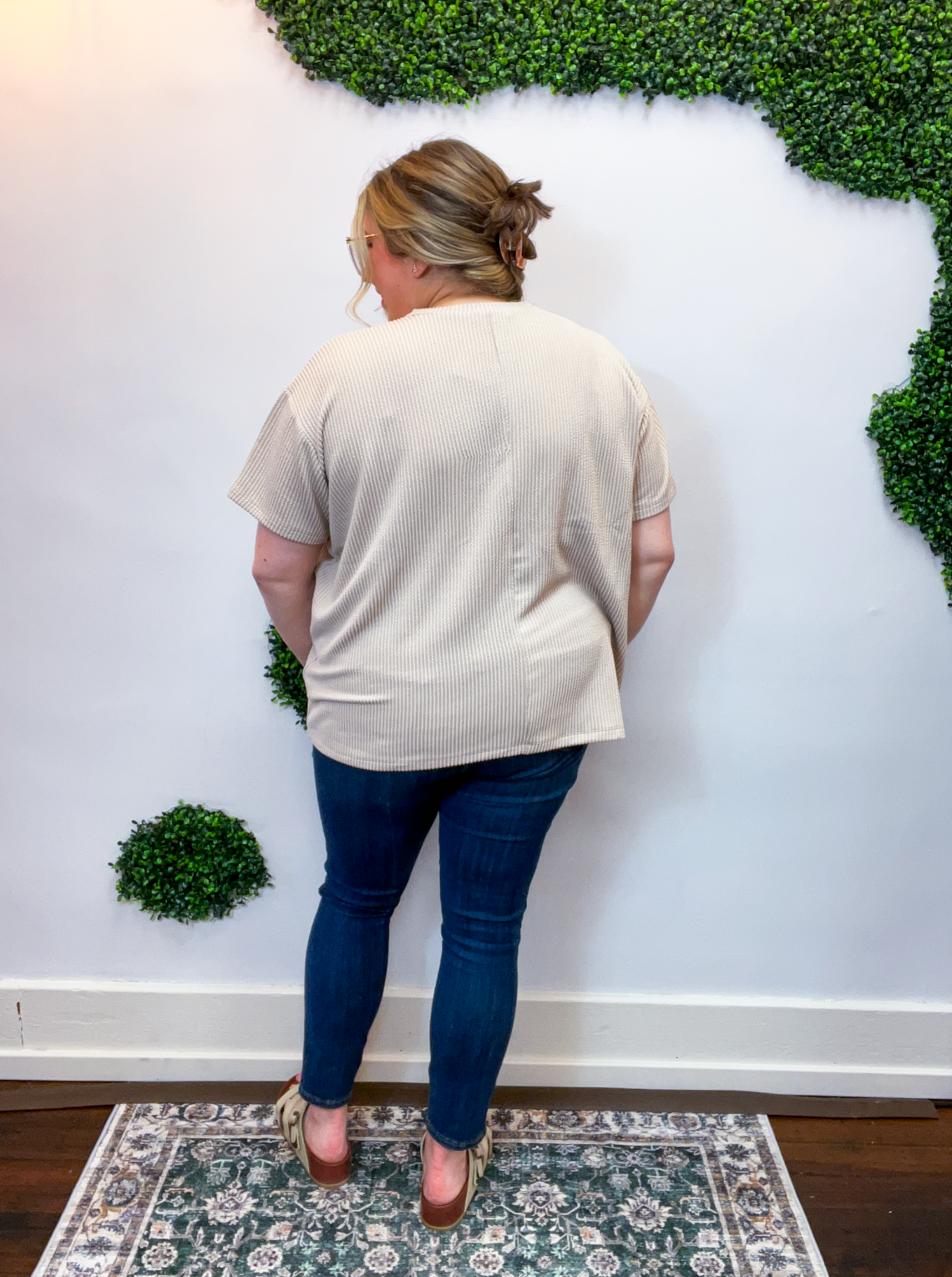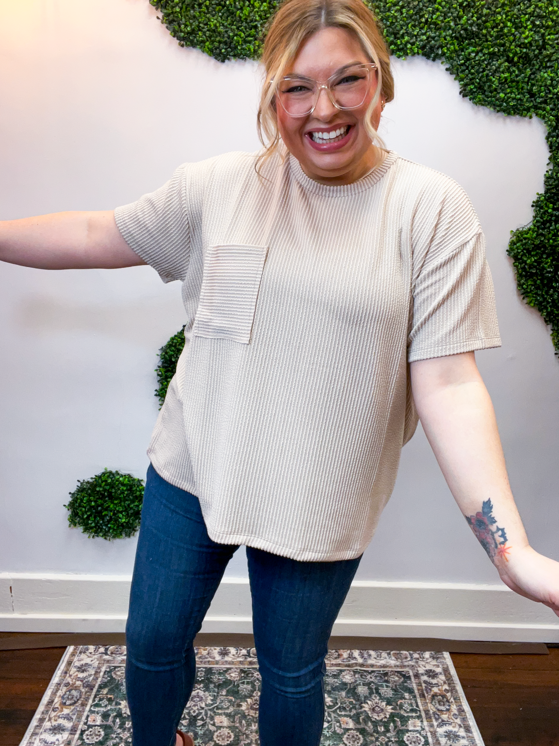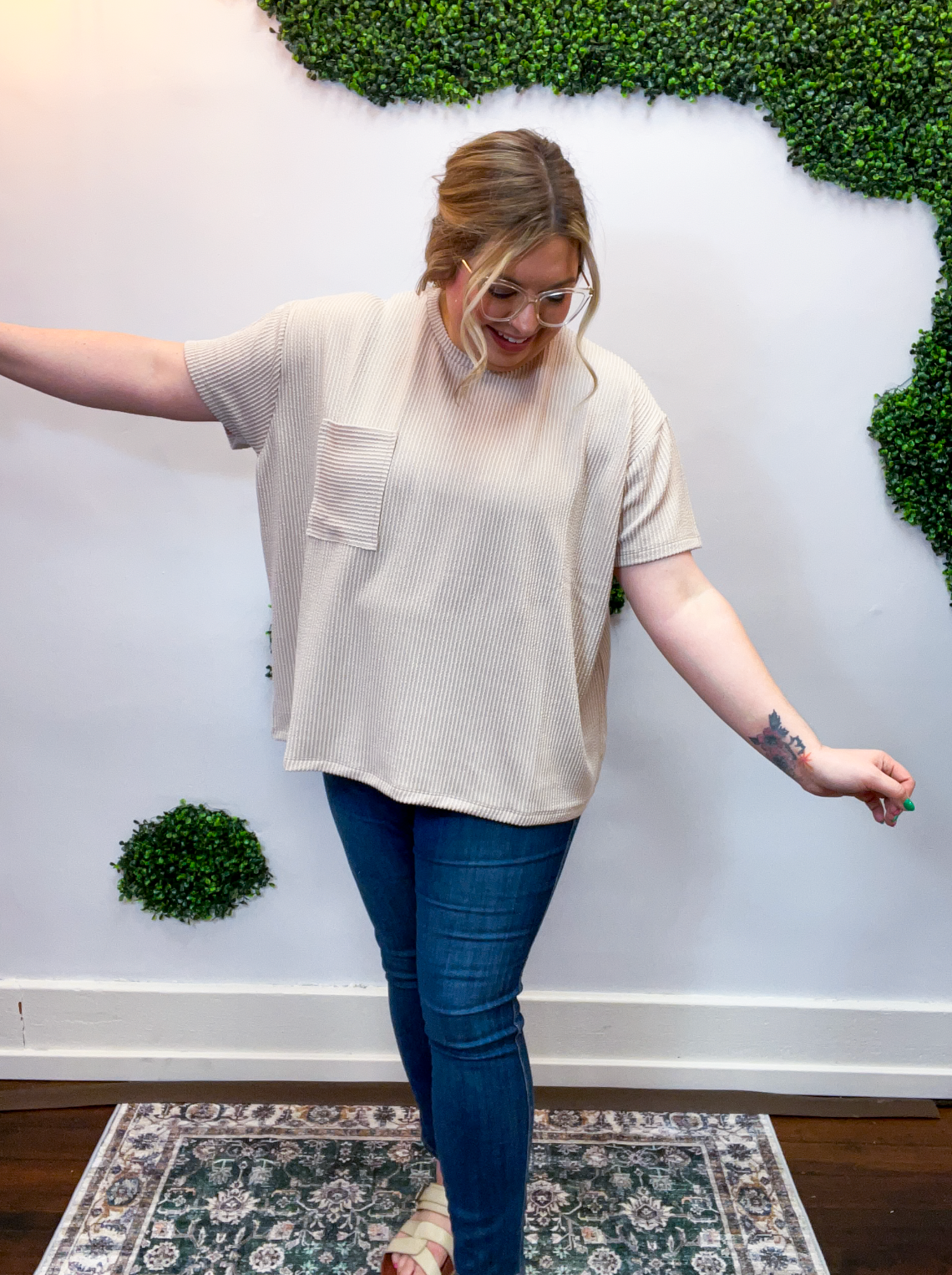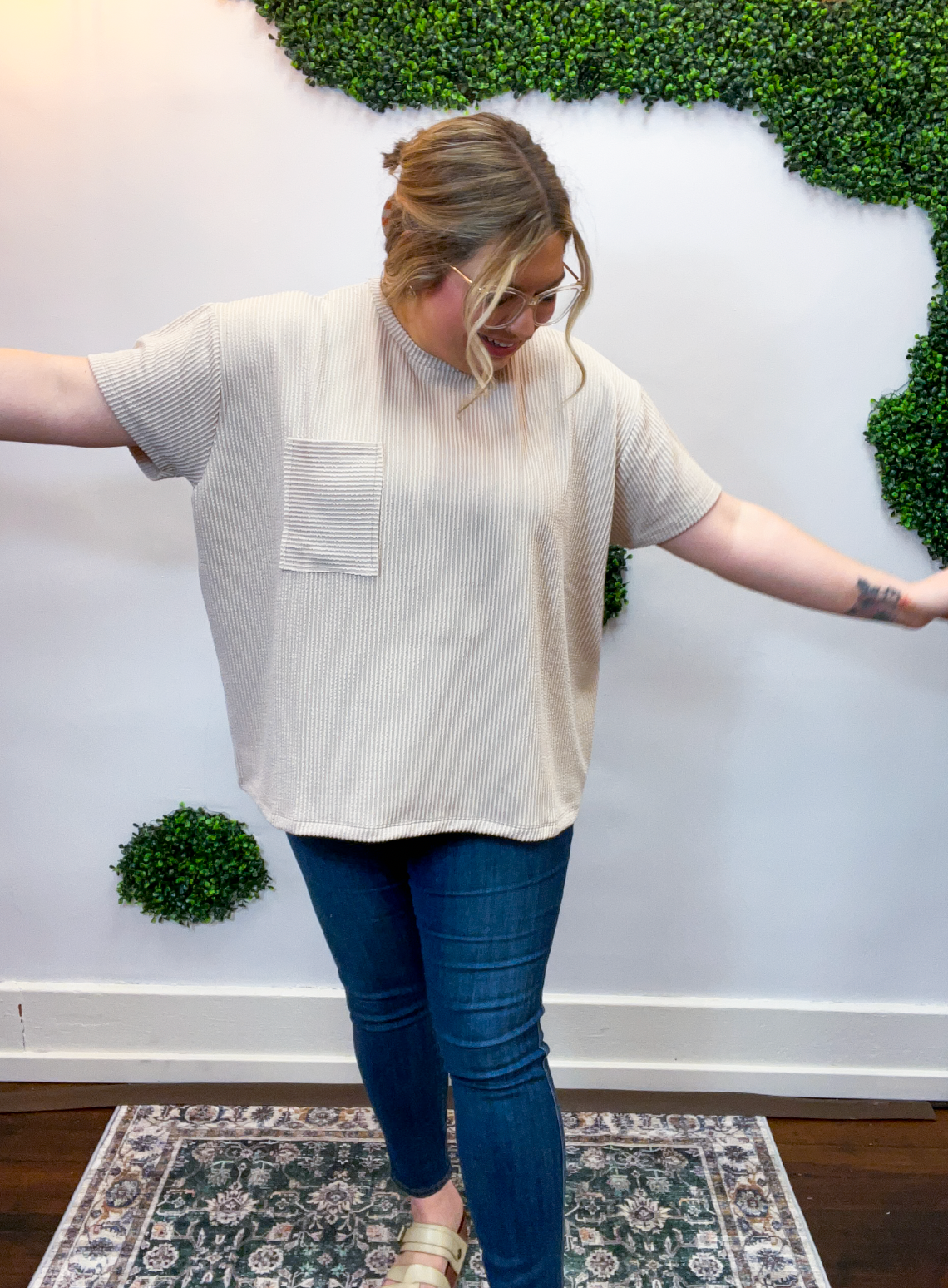 The Ripple & Relax Pocket Top is your new go-to for those “just want to feel comfy but still look cute” days. Made from a soft, wavy corded rib knit, it brings that perfect mix of texture, stretch, and easy-breezy comfort. The relaxed fit drapes beautifully for that effortless, laid-back vibe that works with anything — leggings, jeans, or even a quick front tuck with your favorite shorts.