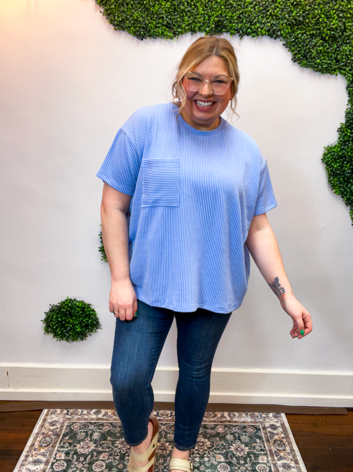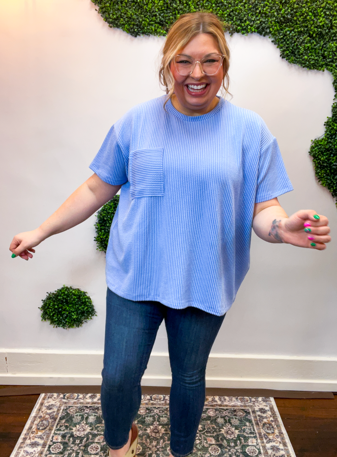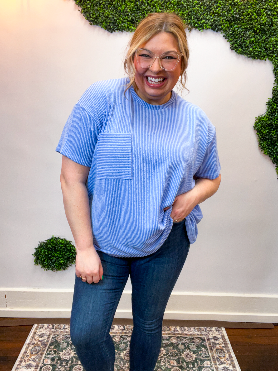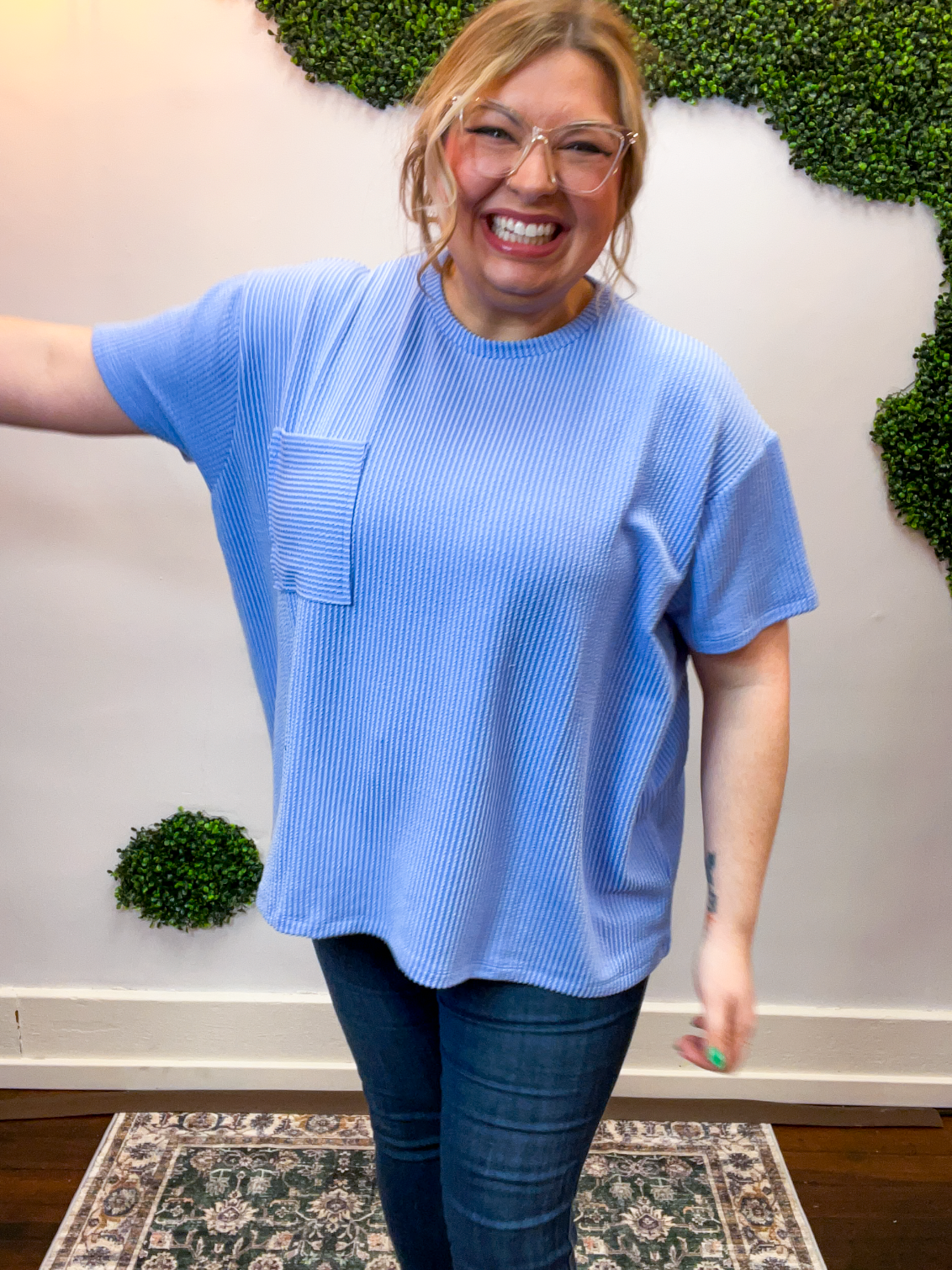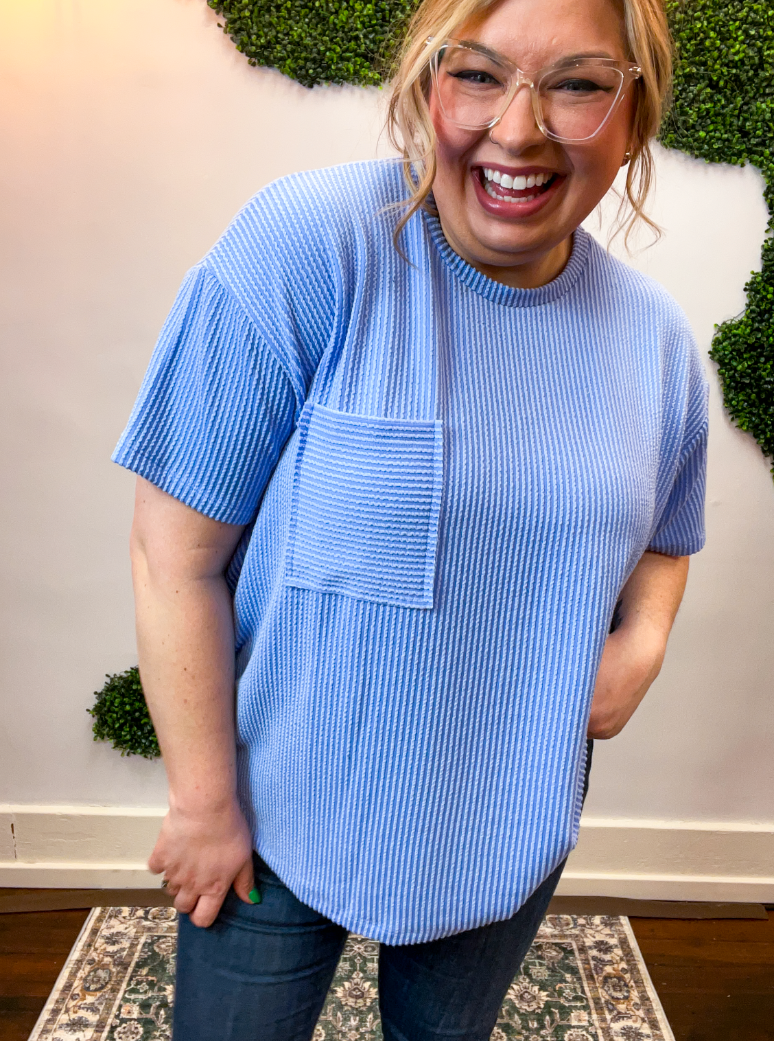 The Ripple & Relax Pocket Top is your new go-to for those “just want to feel comfy but still look cute” days. Made from a soft, wavy corded rib knit, it brings that perfect mix of texture, stretch, and easy-breezy comfort. The relaxed fit drapes beautifully for that effortless, laid-back vibe that works with anything — leggings, jeans, or even a quick front tuck with your favorite shorts.