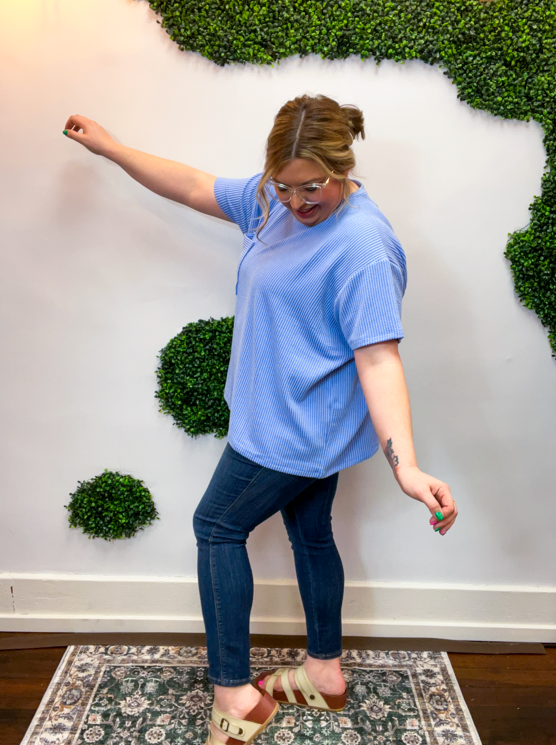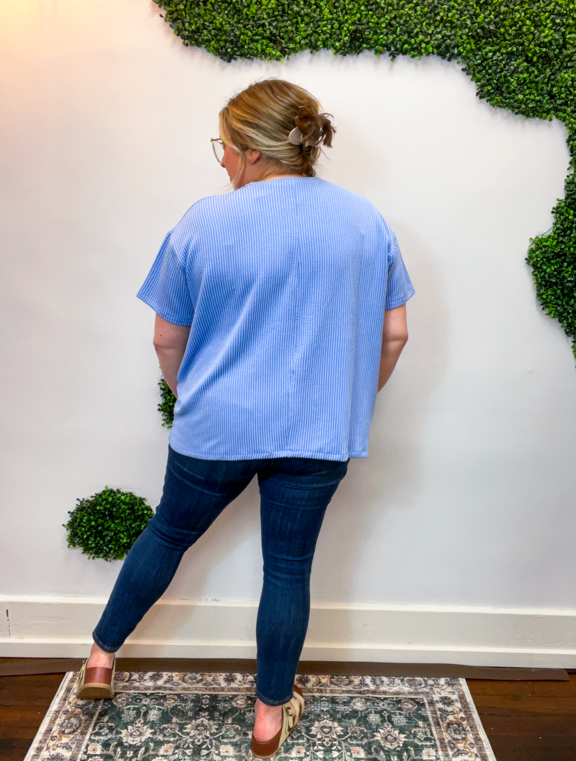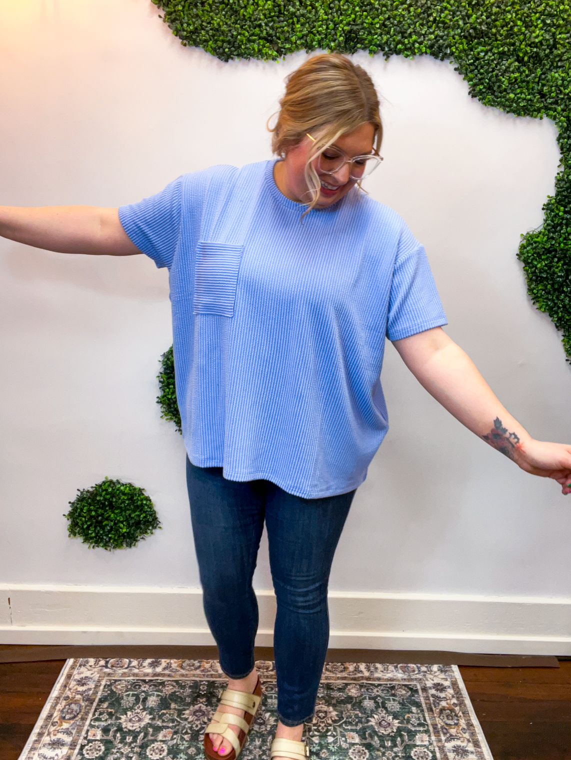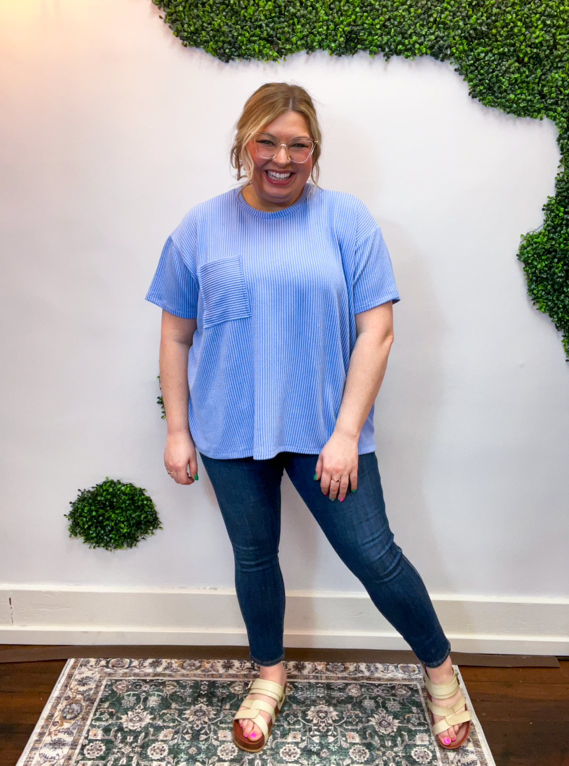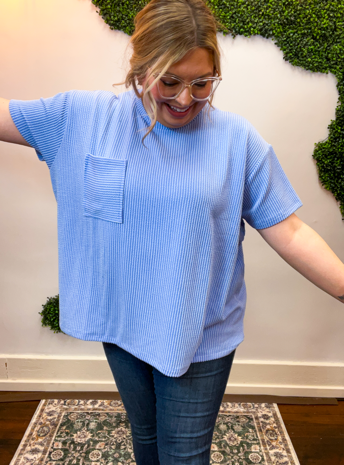 The Ripple & Relax Pocket Top is your new go-to for those “just want to feel comfy but still look cute” days. Made from a soft, wavy corded rib knit, it brings that perfect mix of texture, stretch, and easy-breezy comfort. The relaxed fit drapes beautifully for that effortless, laid-back vibe that works with anything — leggings, jeans, or even a quick front tuck with your favorite shorts.