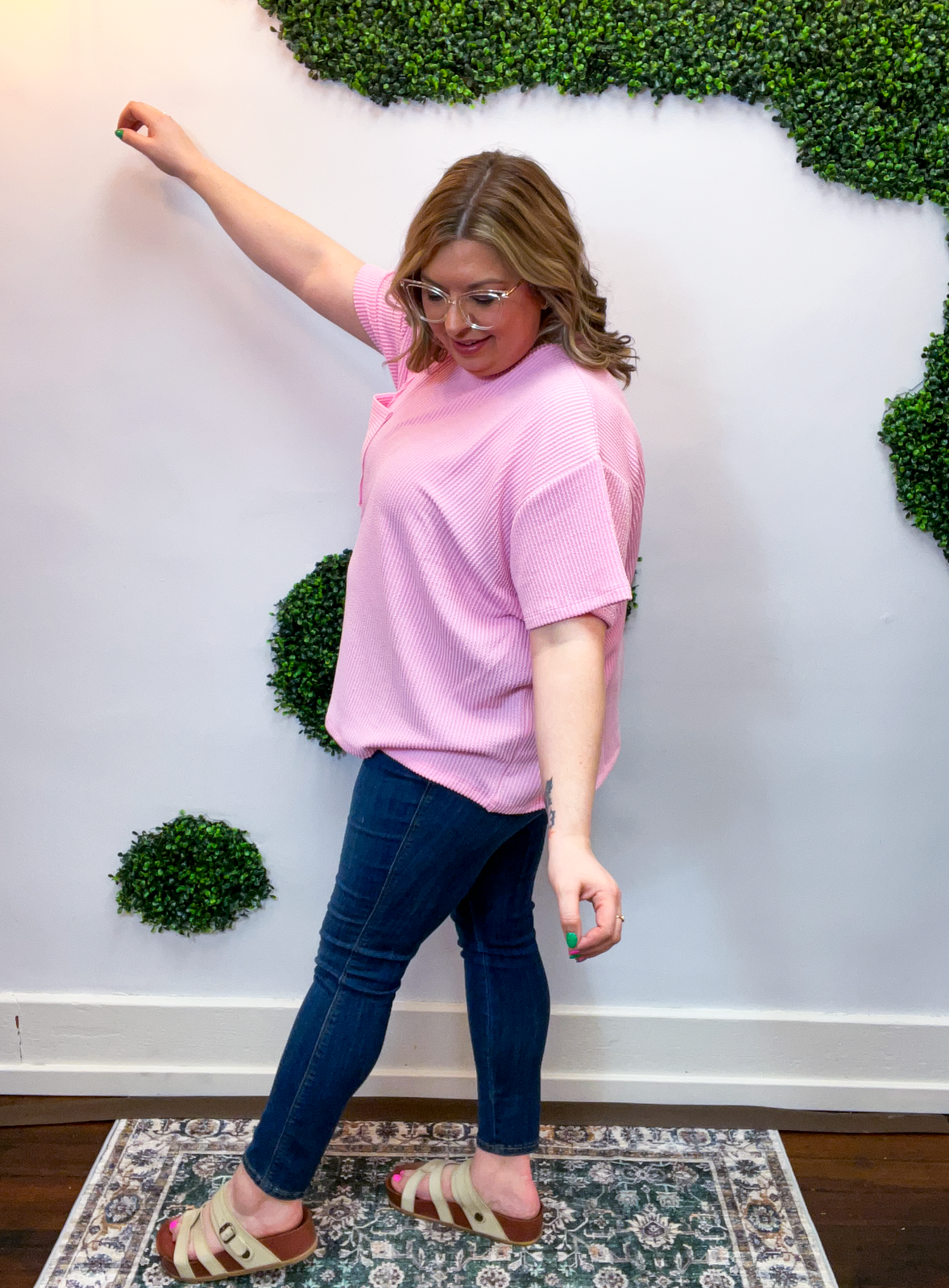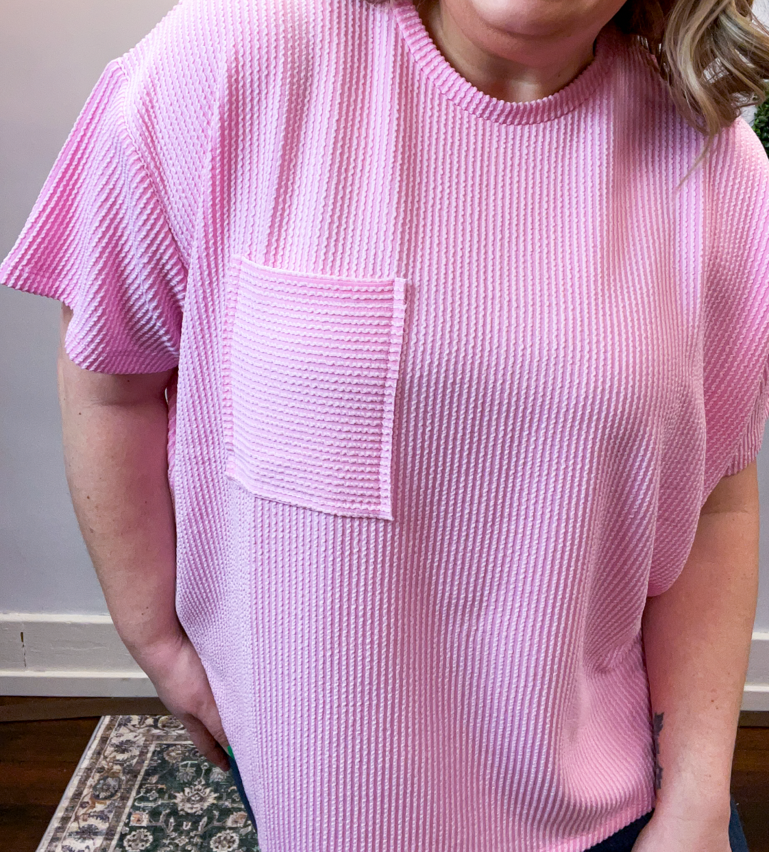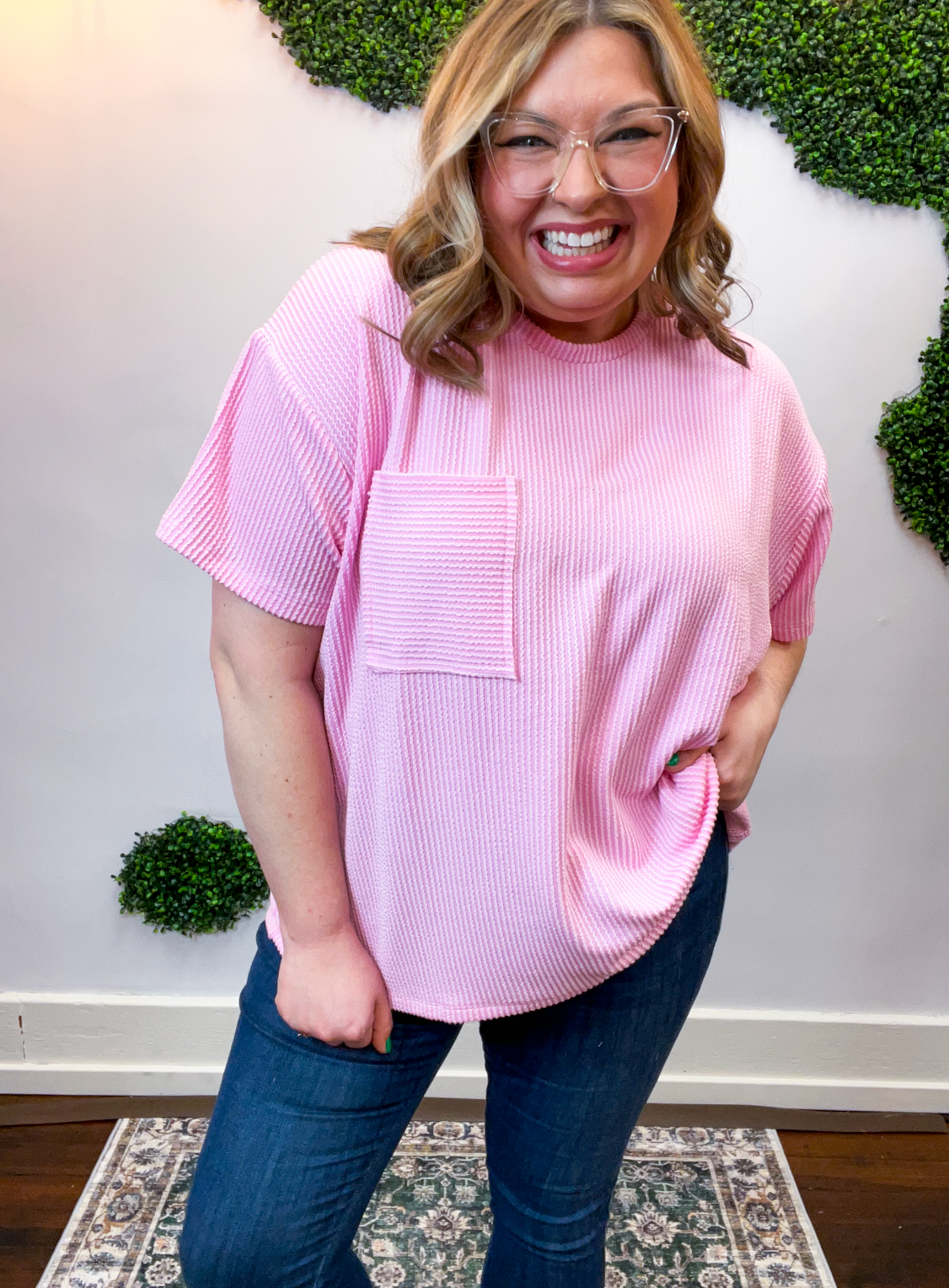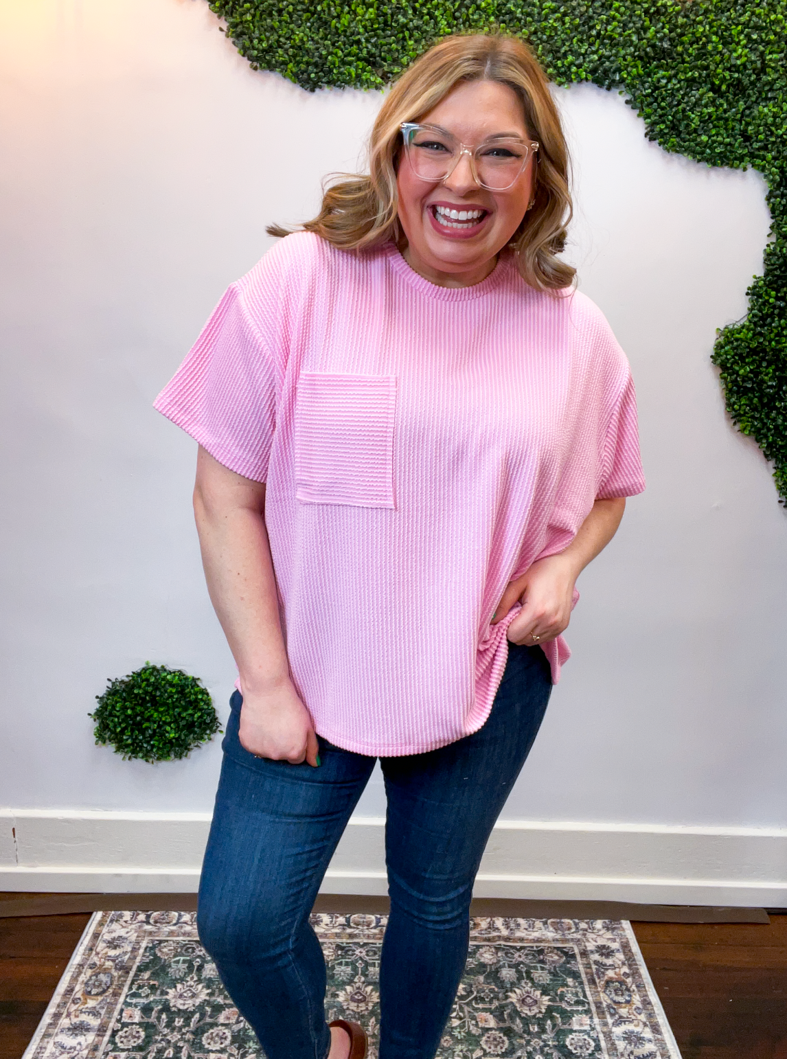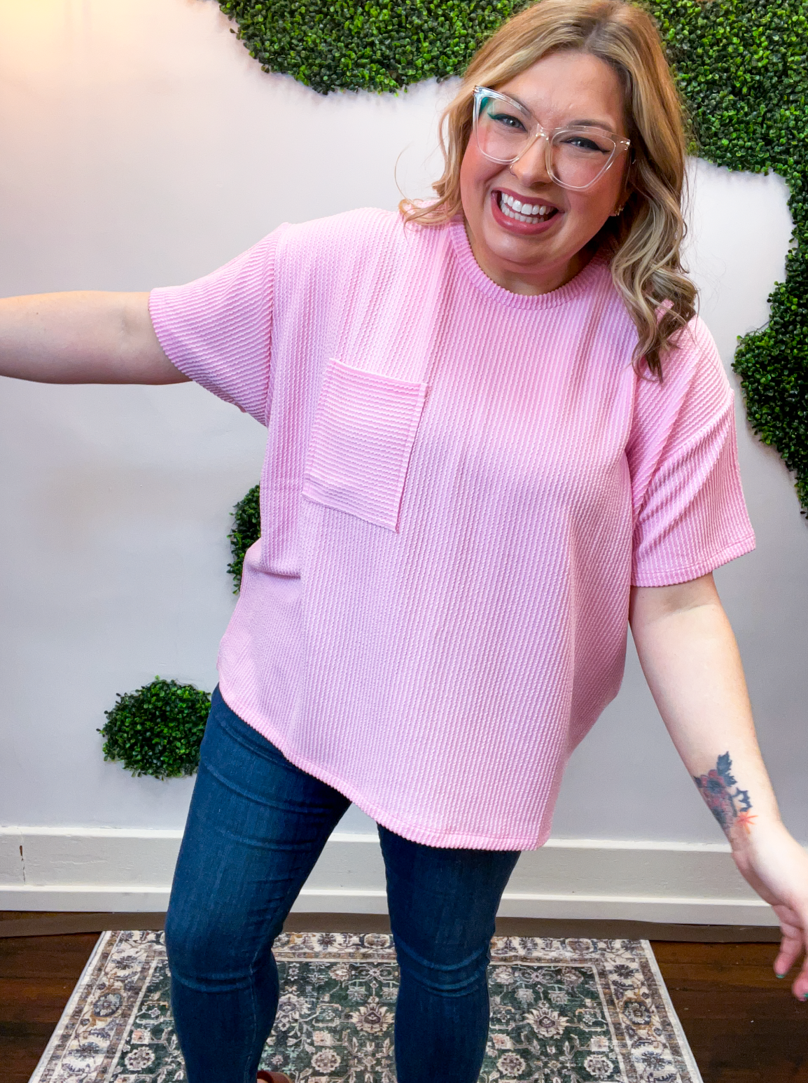 The Ripple & Relax Pocket Top is your new go-to for those “just want to feel comfy but still look cute” days. Made from a soft, wavy corded rib knit, it brings that perfect mix of texture, stretch, and easy-breezy comfort. The relaxed fit drapes beautifully for that effortless, laid-back vibe that works with anything — leggings, jeans, or even a quick front tuck with your favorite shorts.