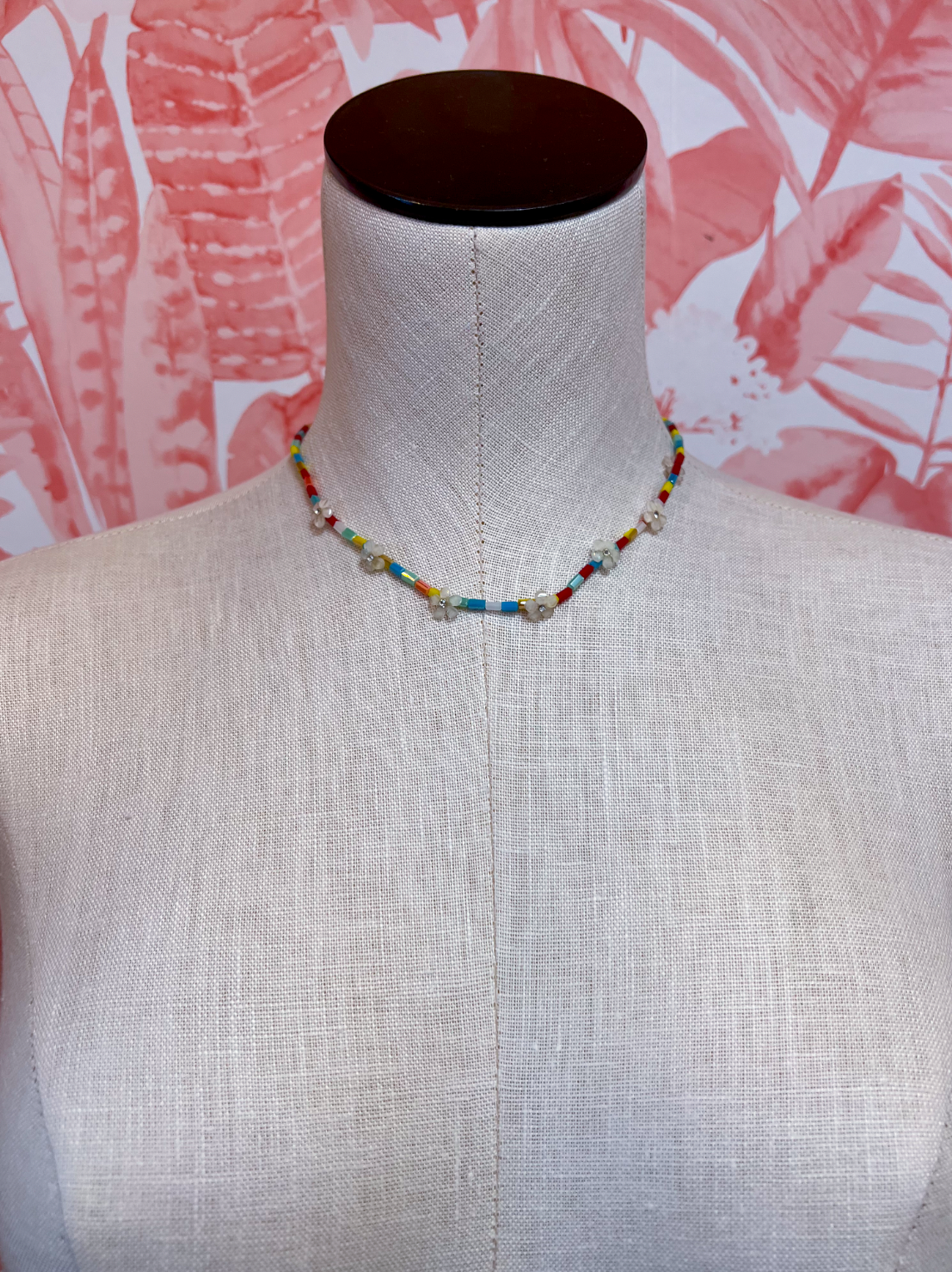 This is the necklace that makes people smile before they even say a word. The Sunshine & Daisies Necklace is pure happy energy on a strand — colorful tube beads in red, blue, yellow, and teal with the most adorable little white flower accents scattered throughout like tiny daisies in a summer field.