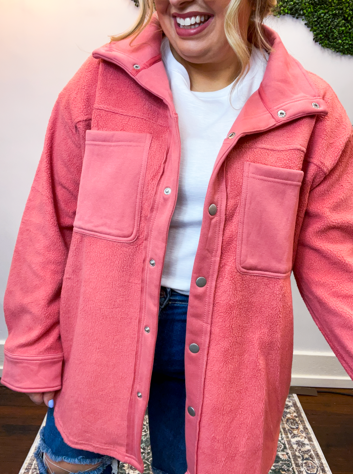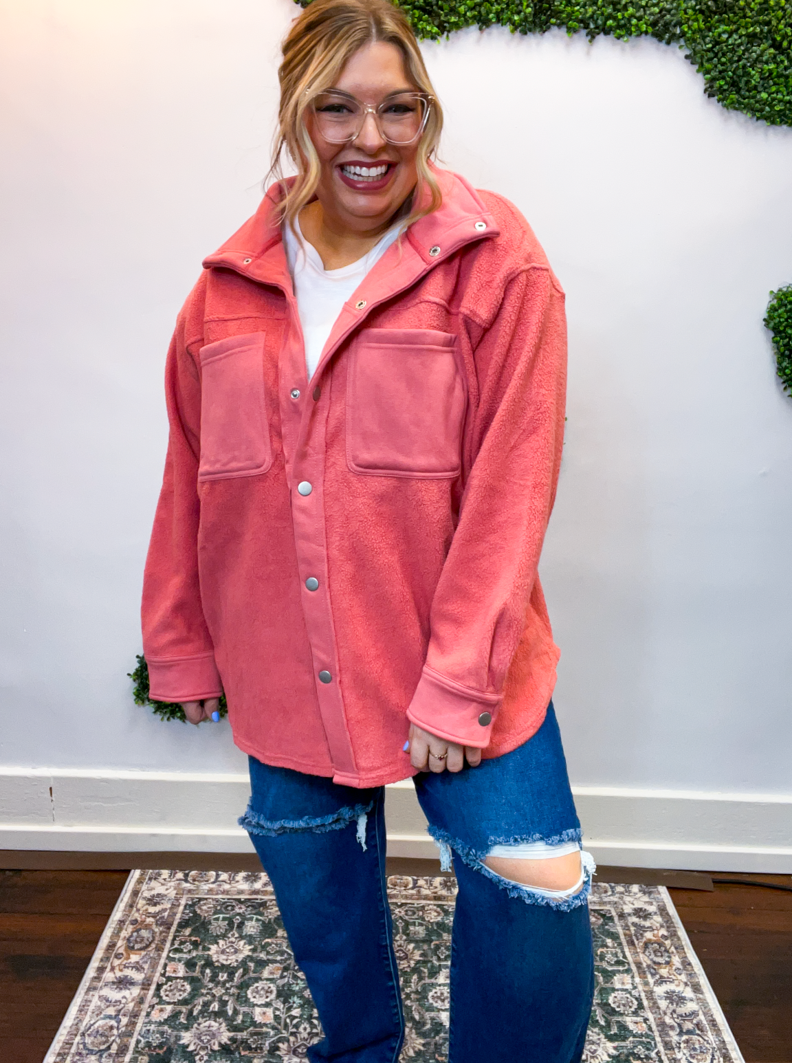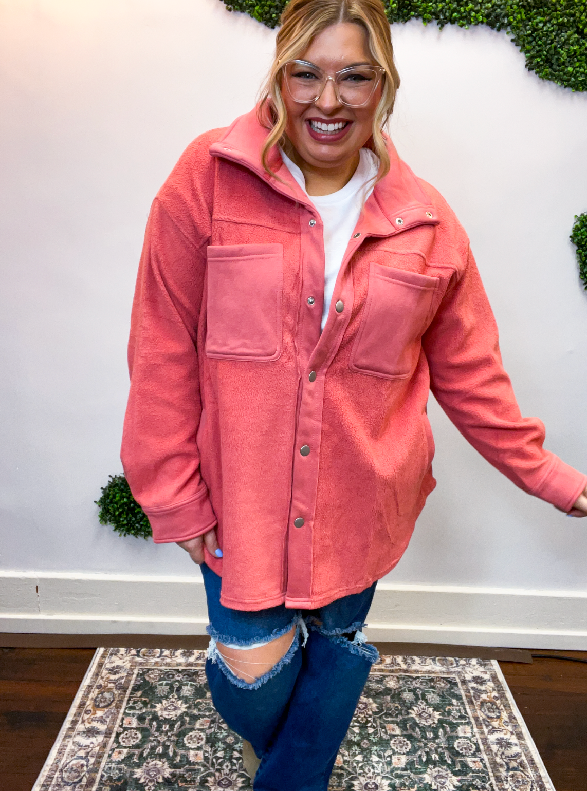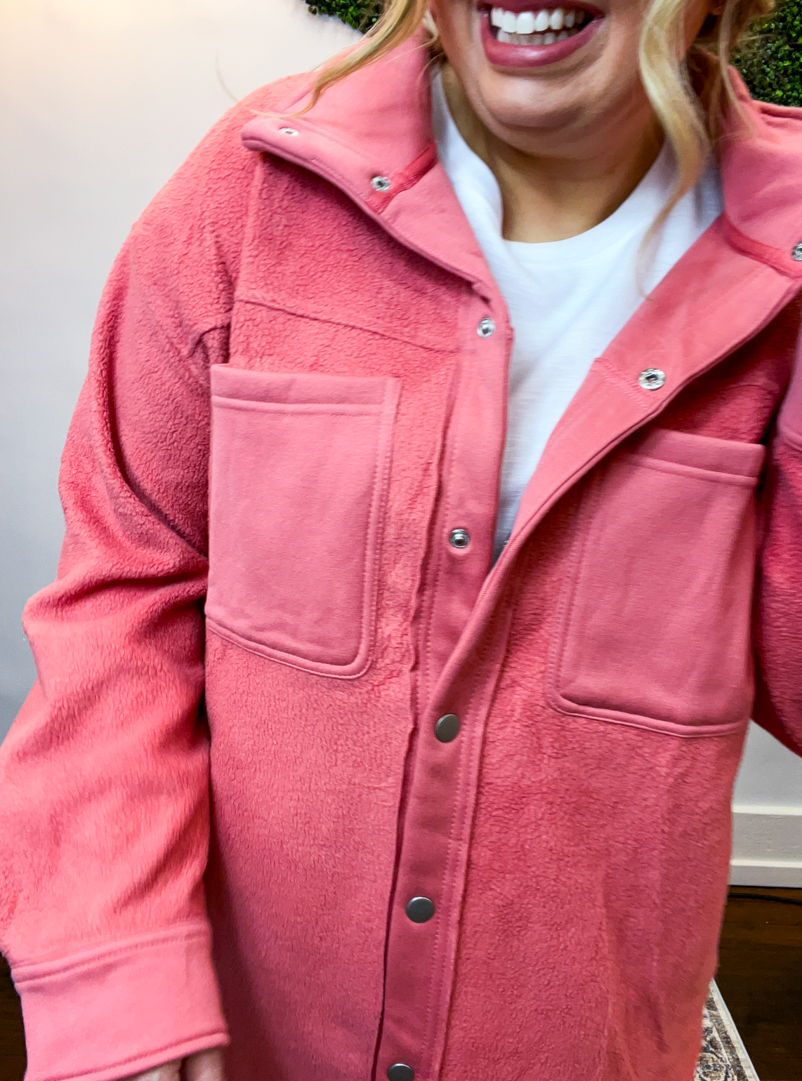 The high neck gives you that extra snuggle factor, while the snap-front buttons make it a true throw-on-and-go favorite. Add in two roomy front pockets, a curved hem, and a relaxed fit… and you’ve got the kind of jacket you’ll keep reaching for all season long.