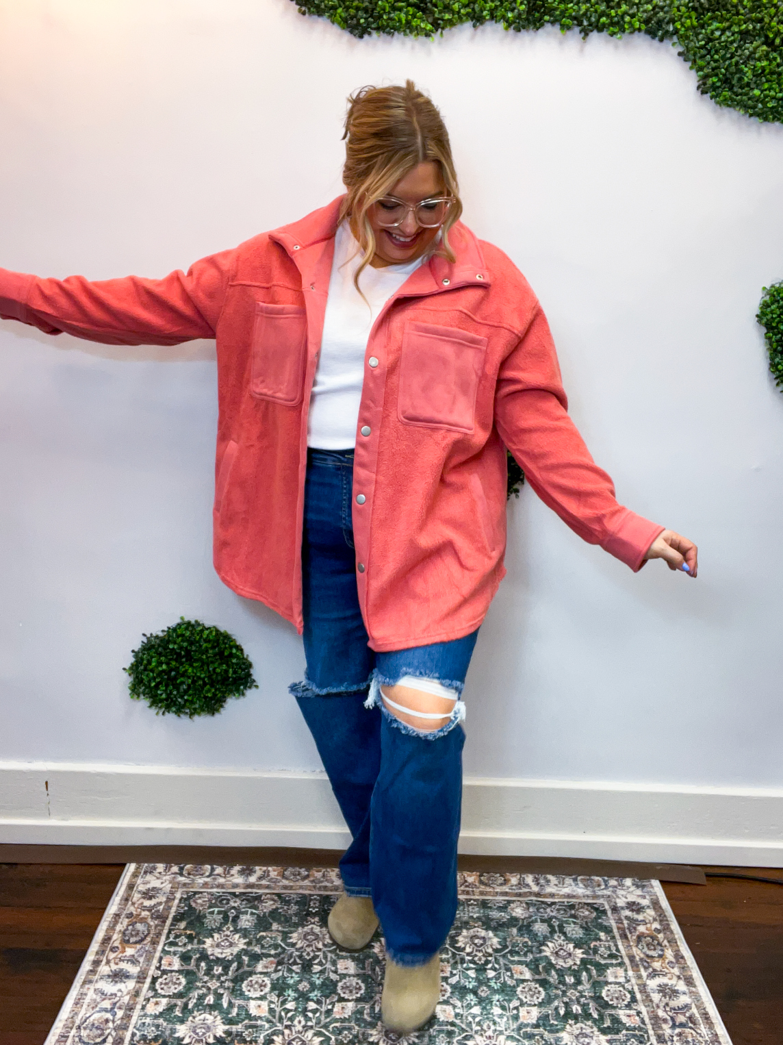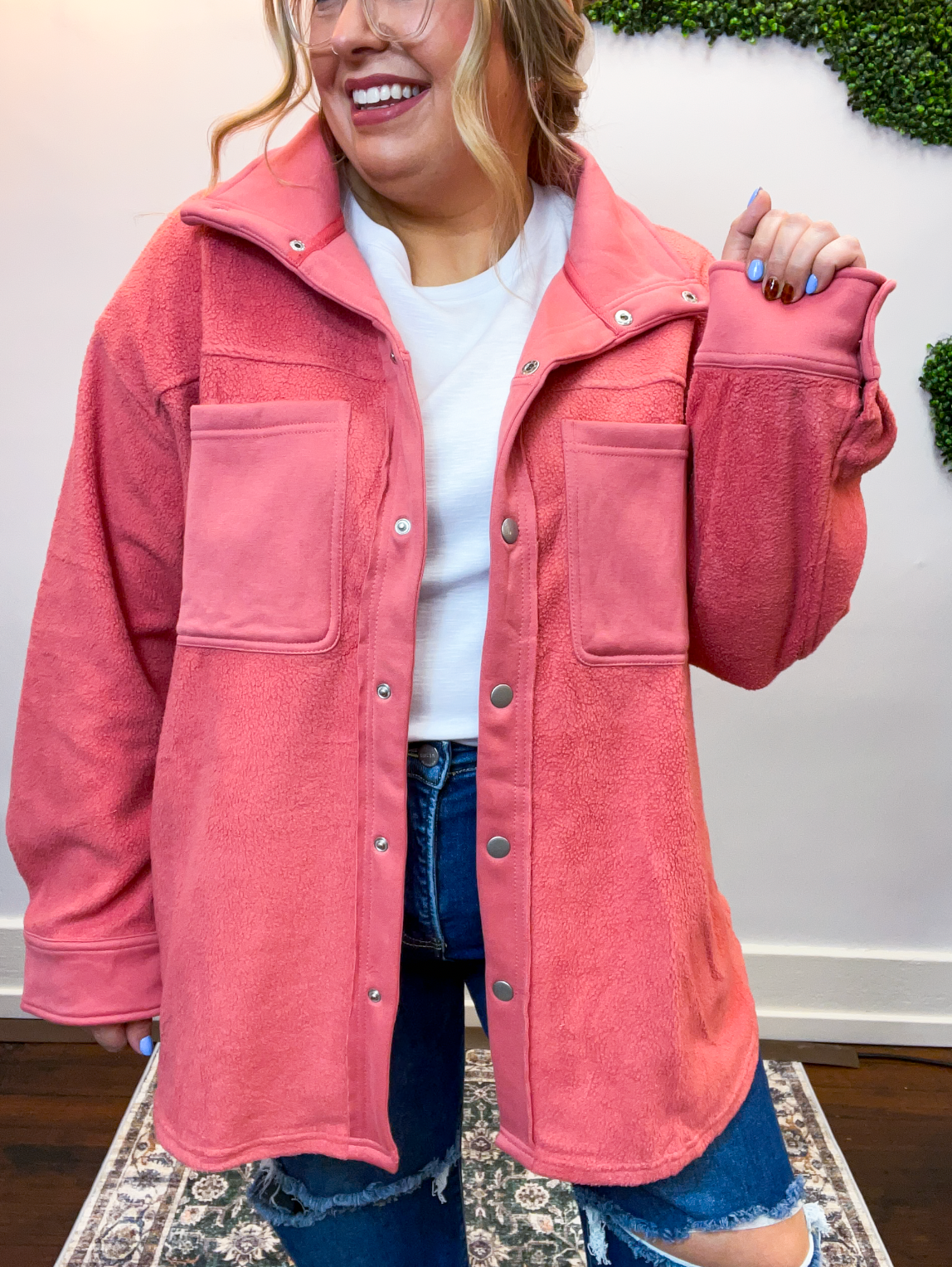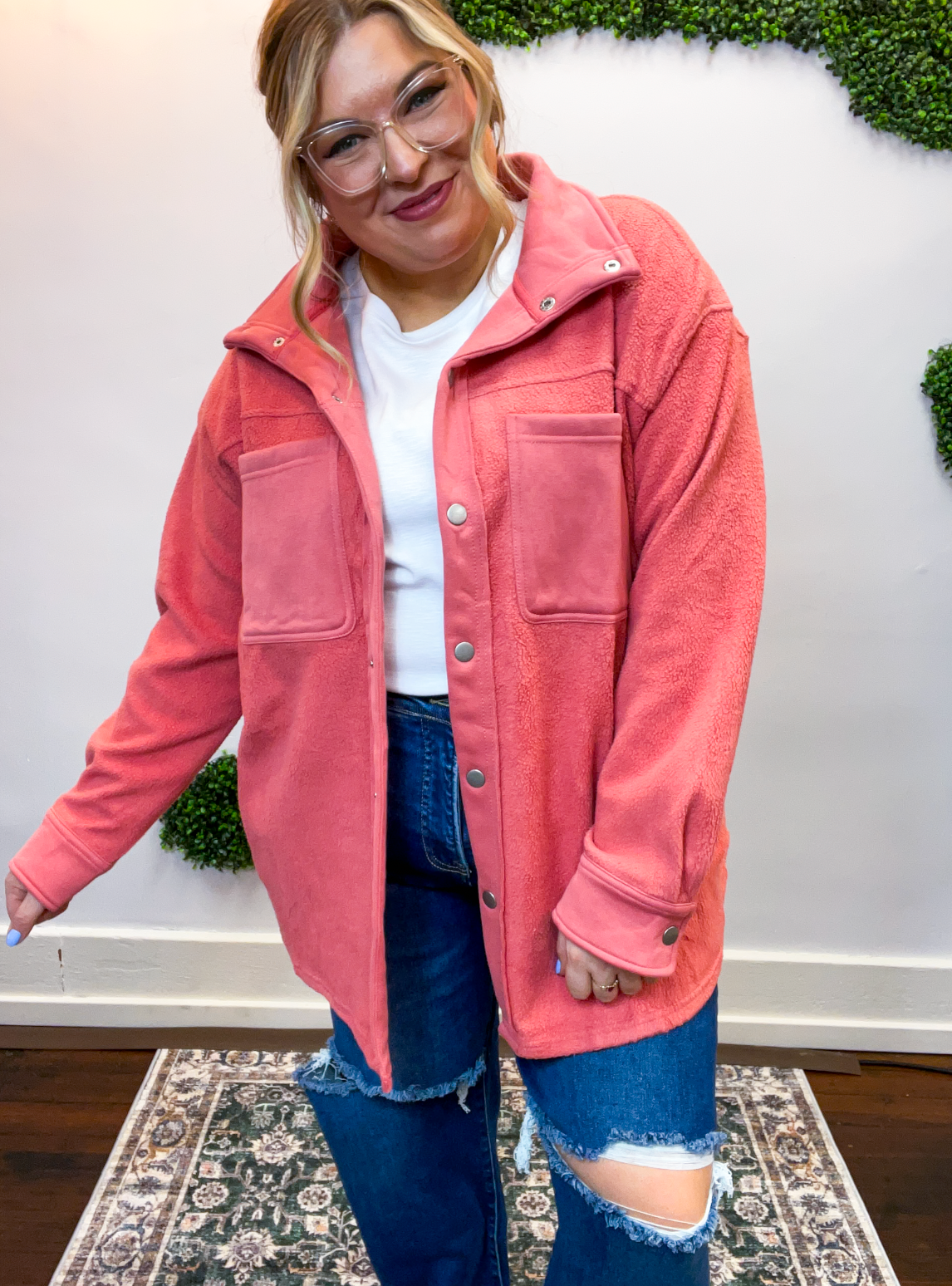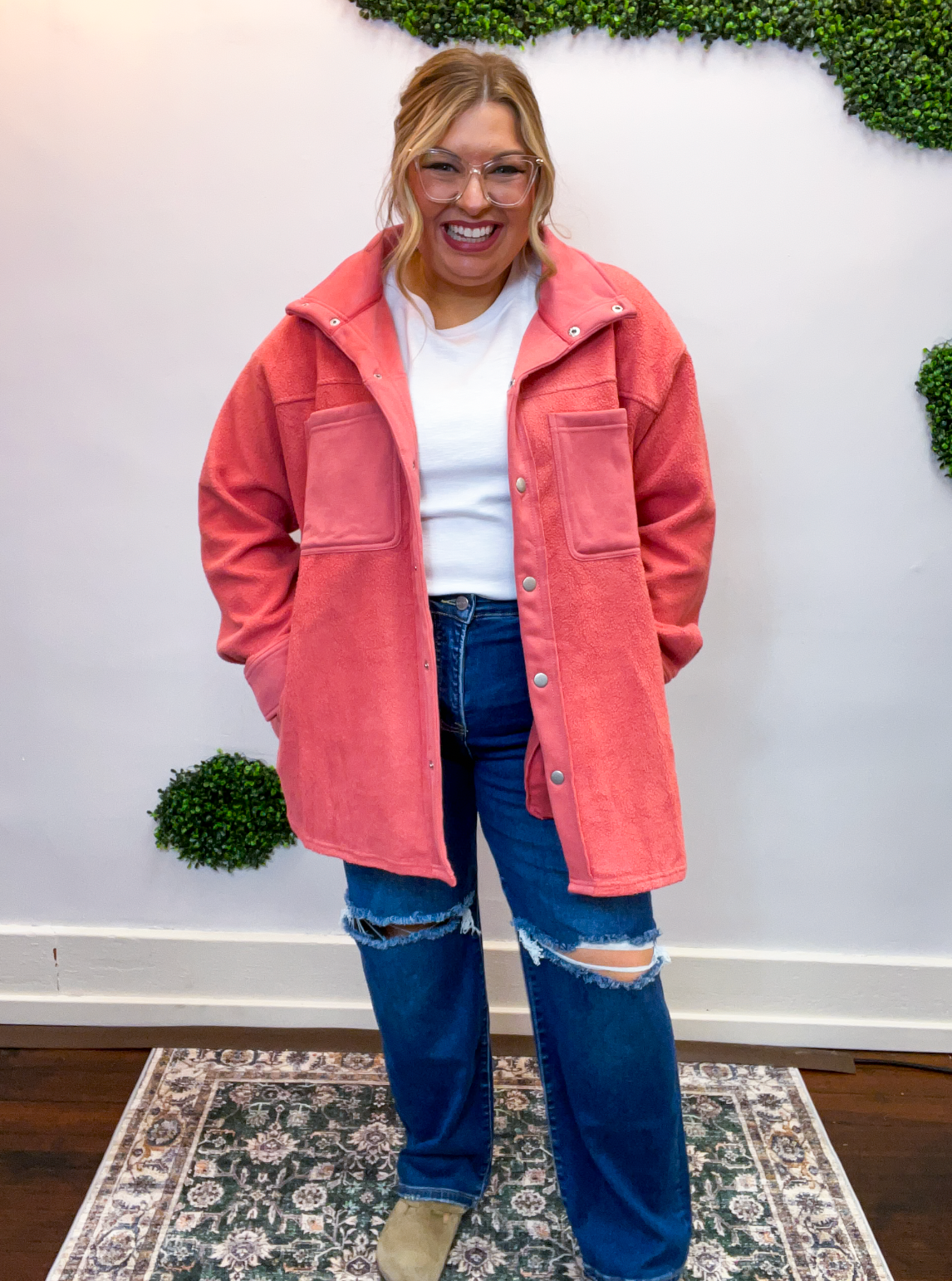 The high neck gives you that extra snuggle factor, while the snap-front buttons make it a true throw-on-and-go favorite. Add in two roomy front pockets, a curved hem, and a relaxed fit… and you’ve got the kind of jacket you’ll keep reaching for all season long.