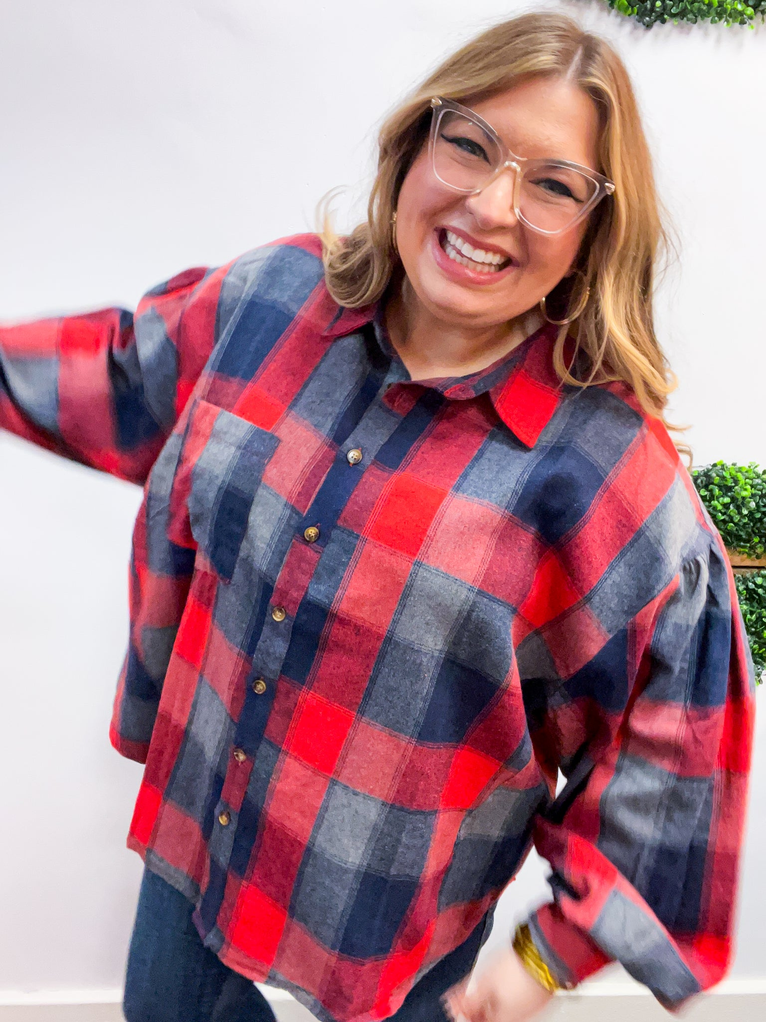 The Checkmate Bubble Sleeve Flannel Top is your new fall favorite for cozy, playful style. With its relaxed oversized fit and statement bubble sleeves, it’s a fresh twist on classic plaid. Crafted from a soft woven cotton-blend fabric, it’s comfy enough for all-day wear but cute enough to style up for a night out.