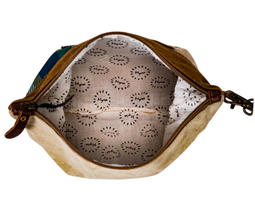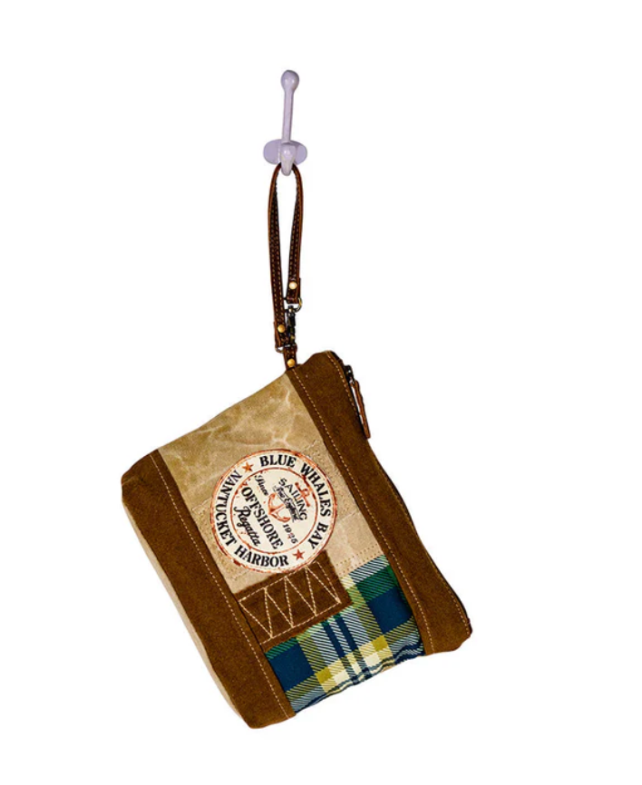 This charming clutch bag offers up a wonderful coastal feel, with charming design elements. Woven upcycled canvas in hues of deep caramel, warm parchment and special plaid give this bag a wonderfully unique look. A front round patch lends a great seafaring vibe. Zipper-close top with wristlet carrying handle in stitched matching leather. A darling addition to your accessory collection!.