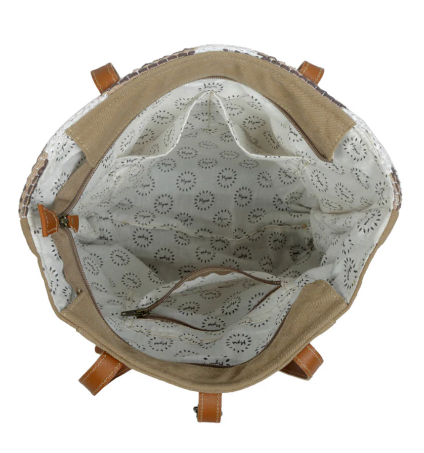 Attention - Only for nature friendly travelers! Presenting a bag with a forward facing dual tone hair-on leather pocket on a classic cream and brown rug that goes well with all your outfits.