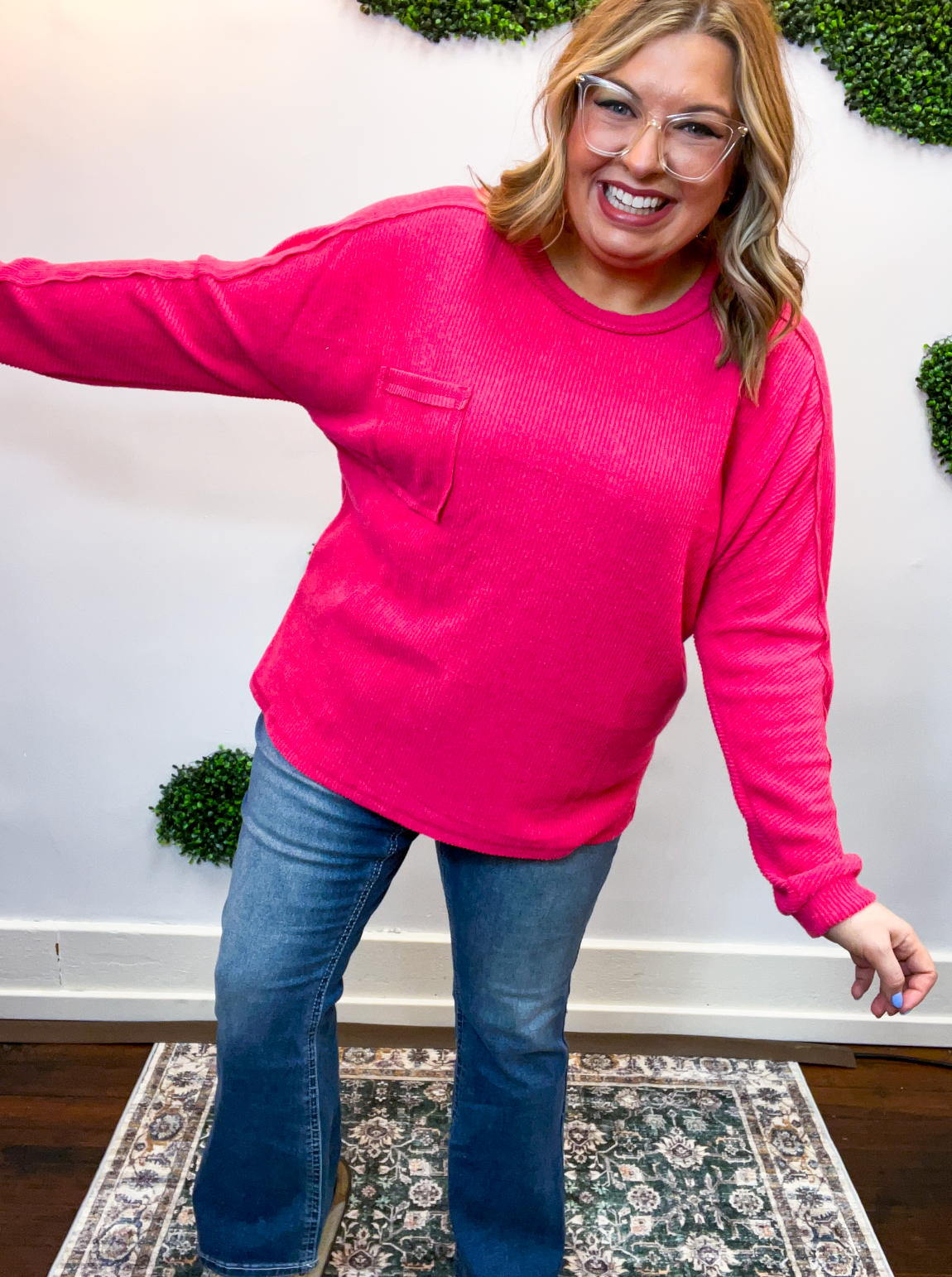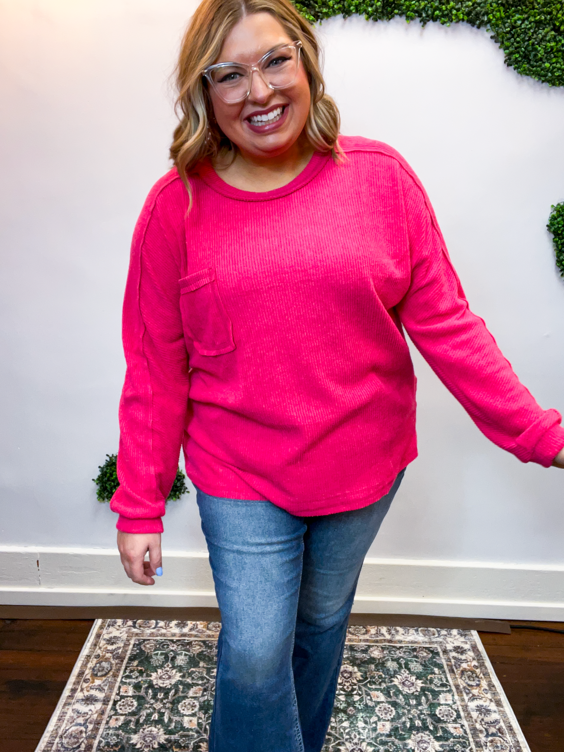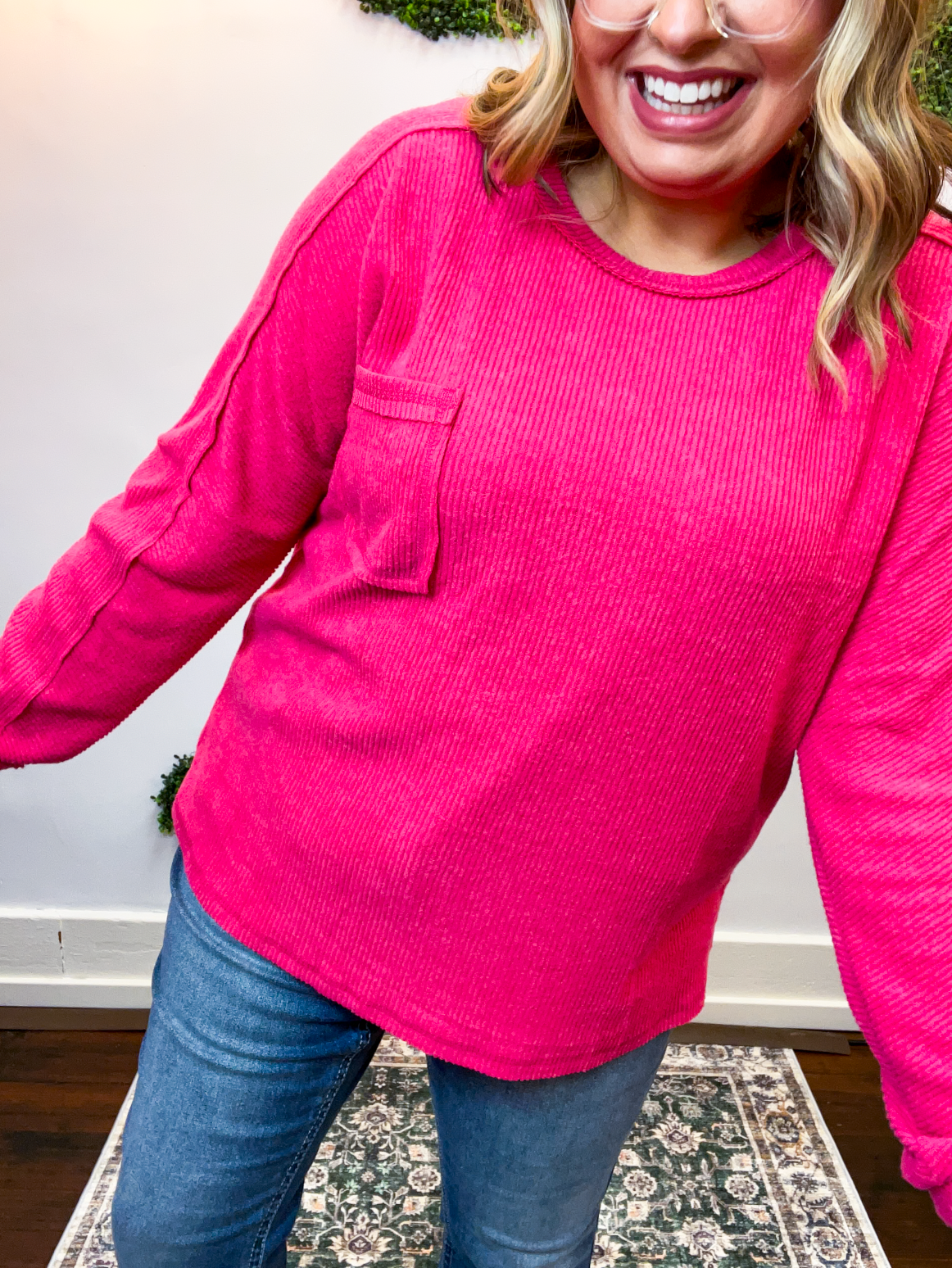 The Cozy Ridge Ribbed Pullover is that easy, “throw it on and feel good” kind of top we all need in our closet. With its soft, brushed ribbed fabric and relaxed silhouette, it’s comfy, cozy, and just the right mix of casual and cute. The exposed seams add that perfectly lived-in touch, while the front pocket brings a little extra charm (and practicality, because who doesn’t love a pocket?).