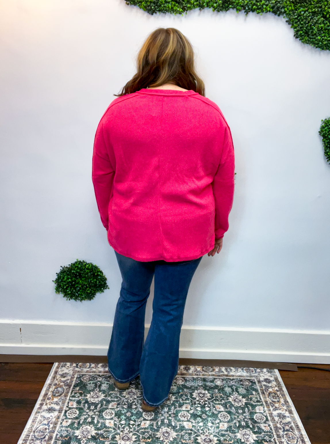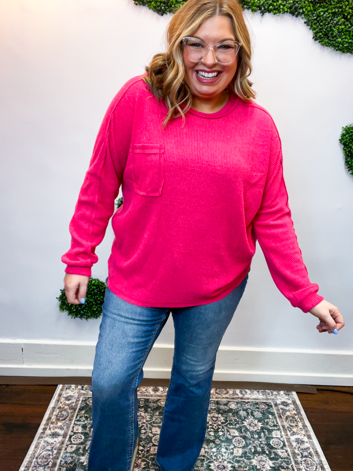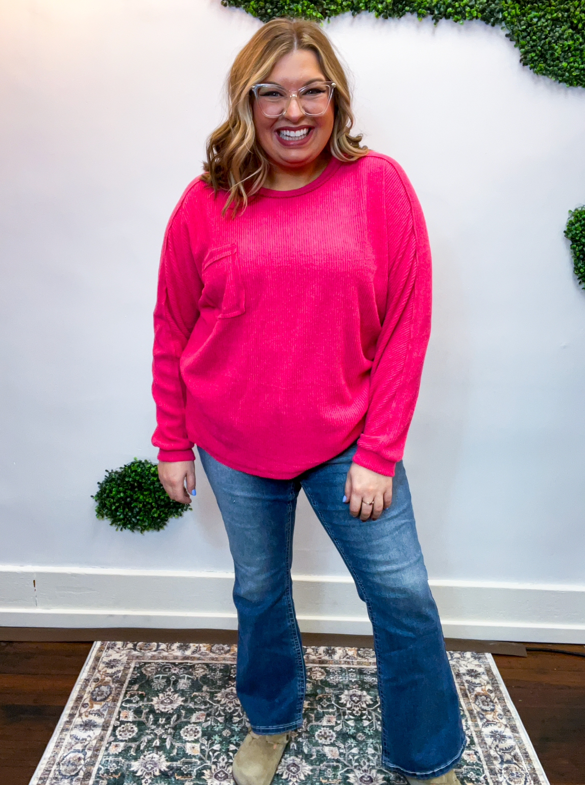 The Cozy Ridge Ribbed Pullover is that easy, “throw it on and feel good” kind of top we all need in our closet. With its soft, brushed ribbed fabric and relaxed silhouette, it’s comfy, cozy, and just the right mix of casual and cute. The exposed seams add that perfectly lived-in touch, while the front pocket brings a little extra charm (and practicality, because who doesn’t love a pocket?).