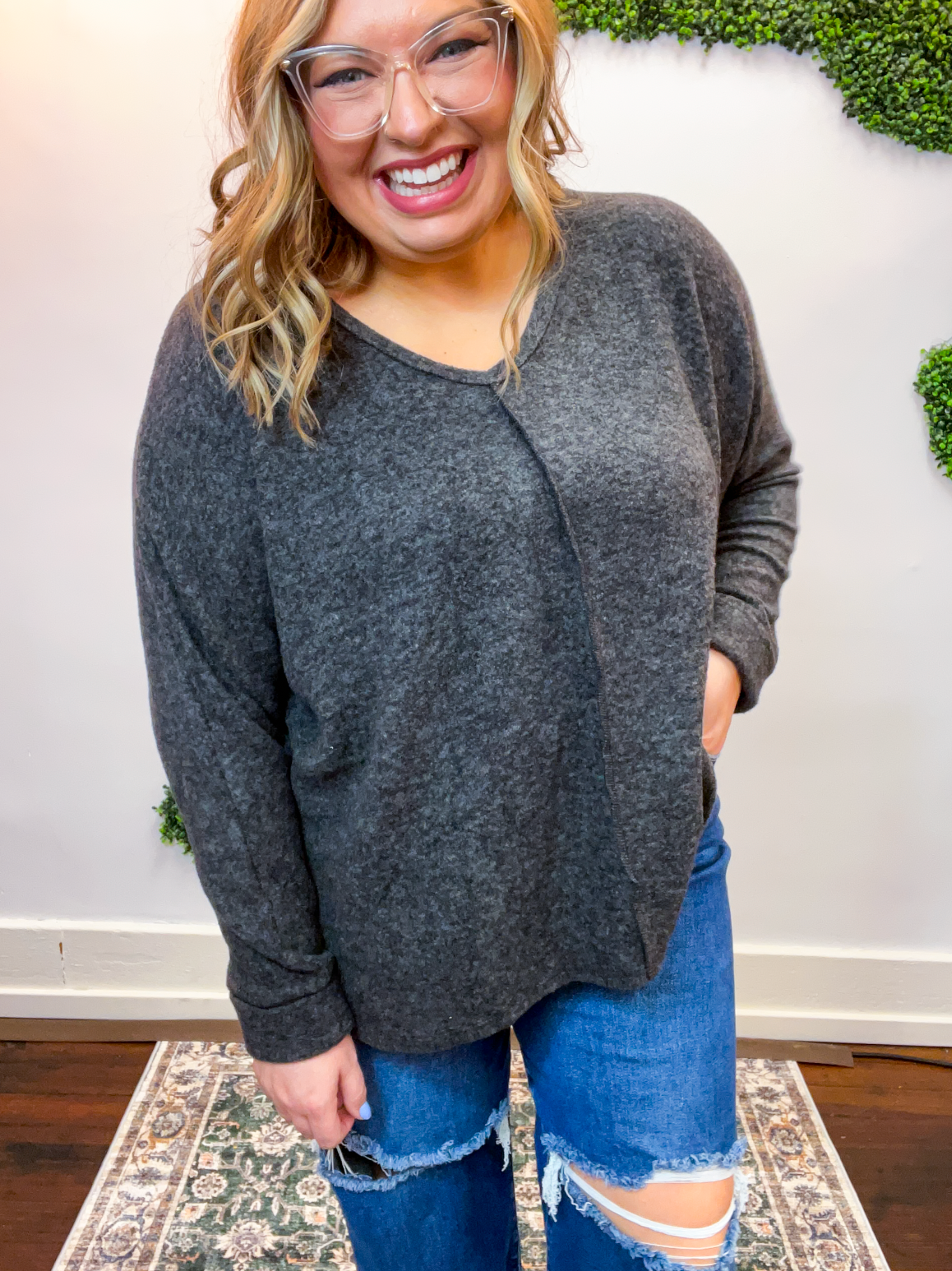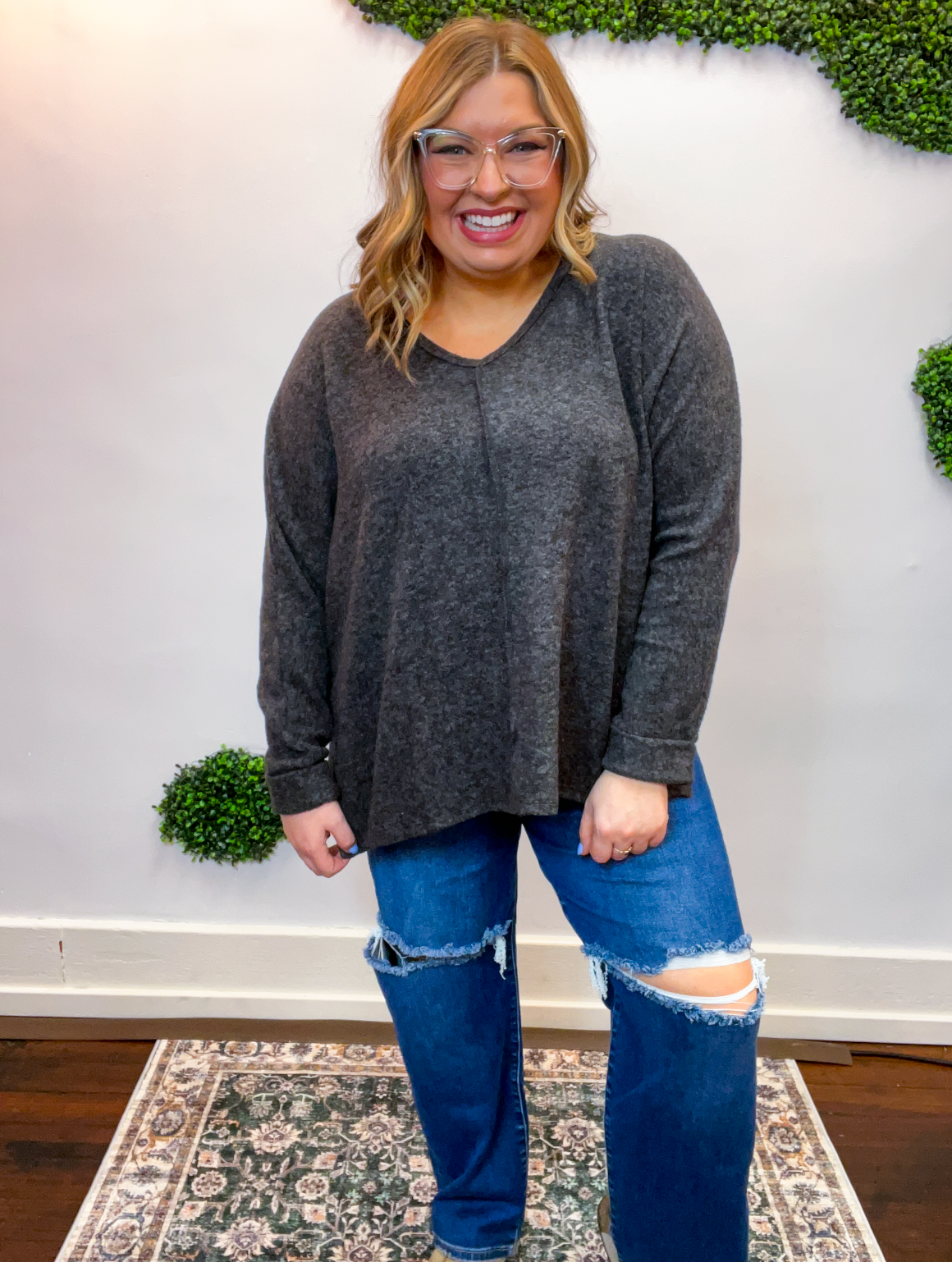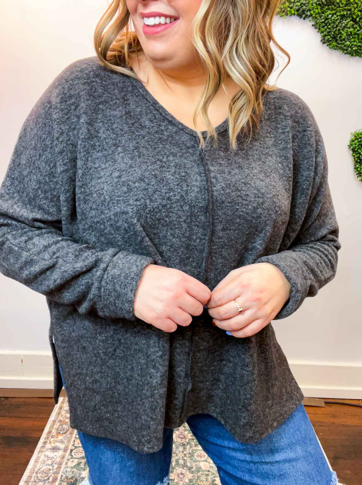 The Creamy Comfort V-Neck Sweater is all about that cloud-level coziness you’ll never want to take off. Made from soft brushed hacci knit, it feels lightweight yet luxuriously soft—perfect for lounging at home or layering up for a casual coffee run.