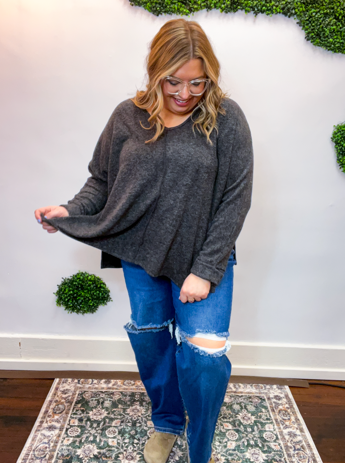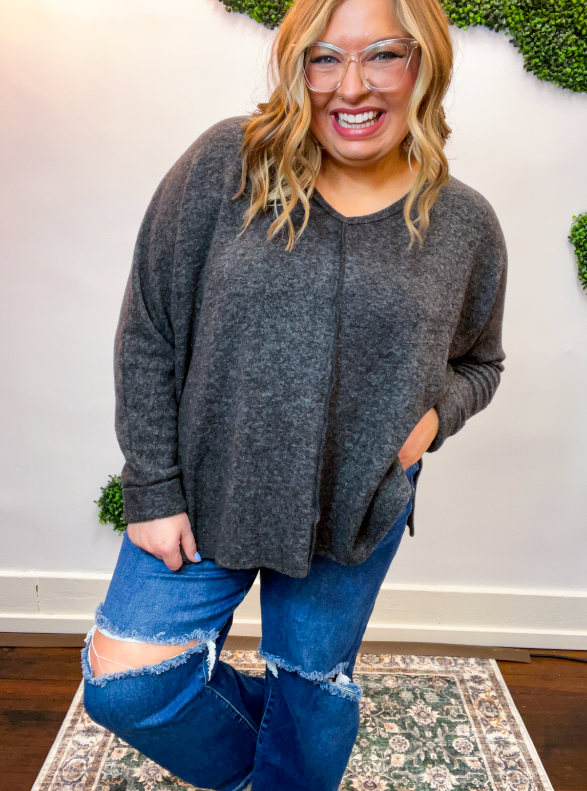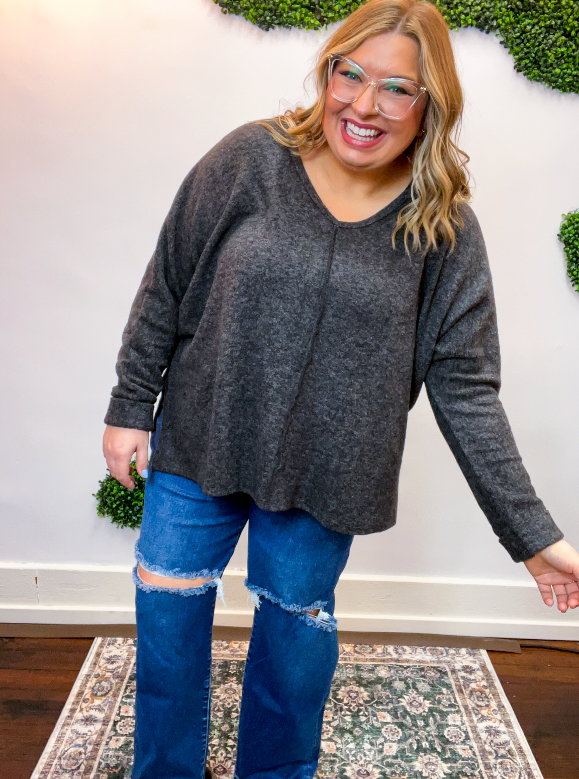 The Creamy Comfort V-Neck Sweater is all about that cloud-level coziness you’ll never want to take off. Made from soft brushed hacci knit, it feels lightweight yet luxuriously soft—perfect for lounging at home or layering up for a casual coffee run.