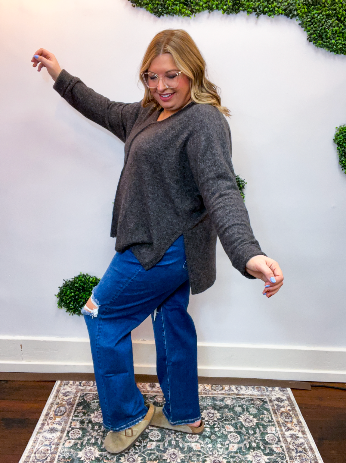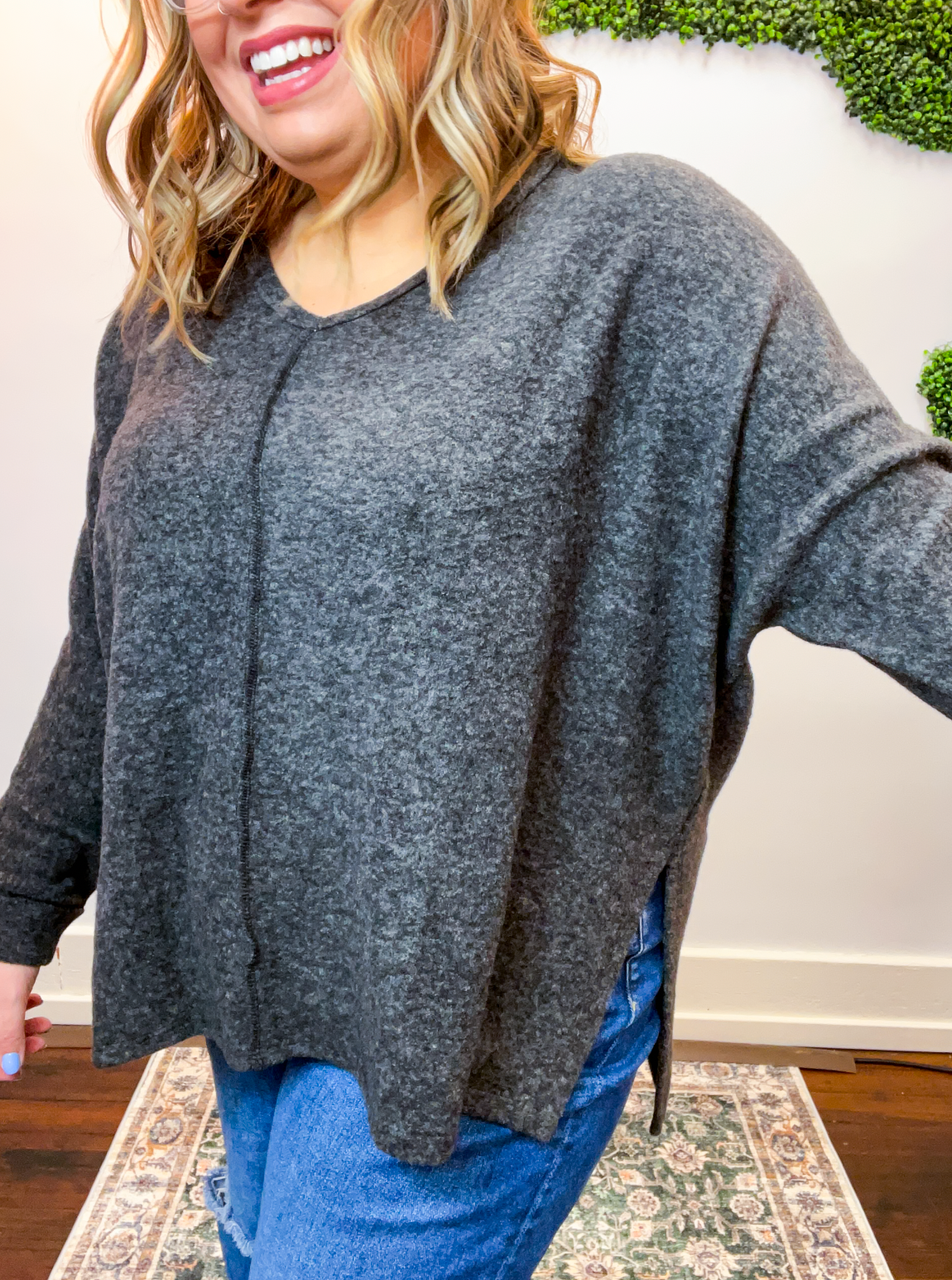 The flattering V-neckline and center seam detail give it that effortlessly put-together touch, while the dolman sleeves and hi-low hem with side slits make it easy to style with a front tuck or leave loose for a flowy, relaxed look. Available in dreamy neutral hues that go with everything, this sweater is comfort made cute.