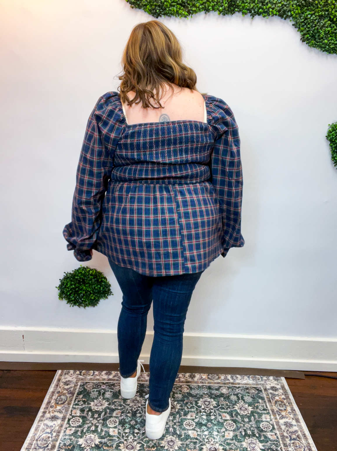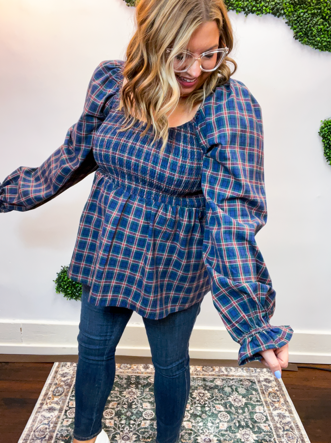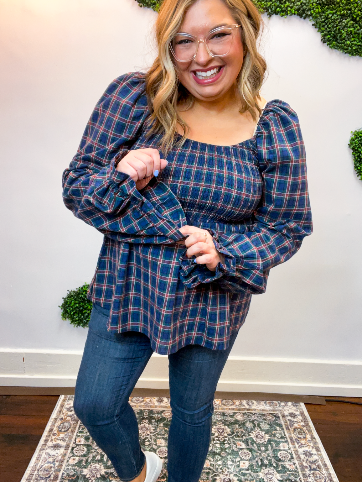 • Puff sleeves + plaid pattern for a cozy fall feel