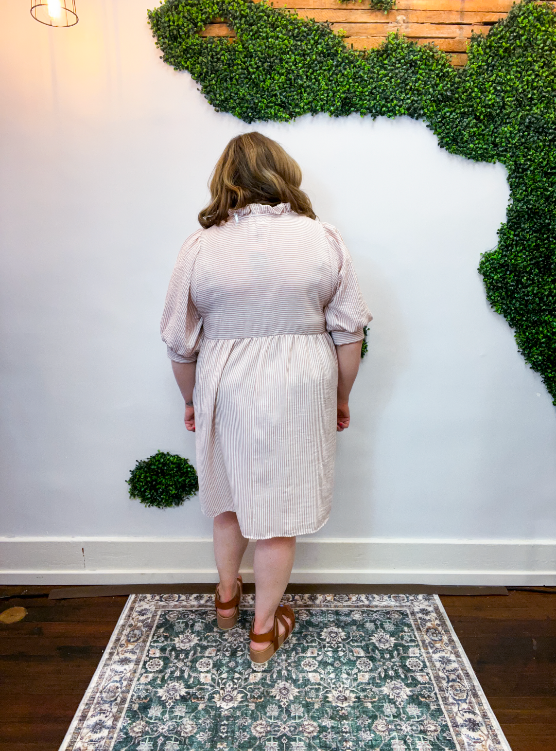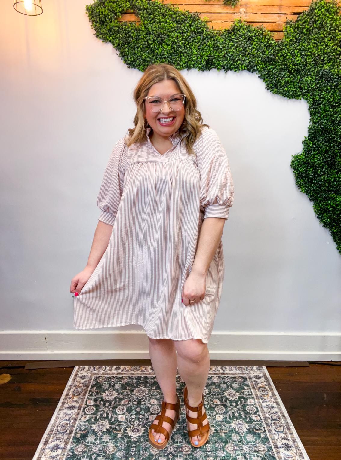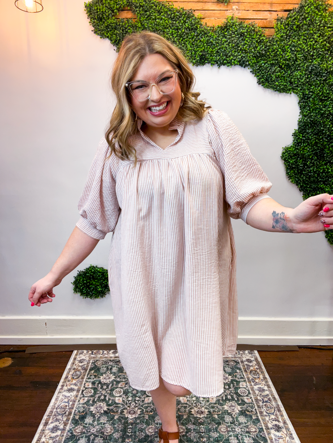 The Pretty Please Pinstripe Dress is one of those easy yes kind of styles — comfy, cute, and ready for whatever your day brings. With its relaxed shift silhouette and soft pinstripe fabric, it gives you that effortlessly put-together look without trying too hard. The frilled notch neckline adds a feminine touch, while the bubble short sleeves bring just the right amount of charm.