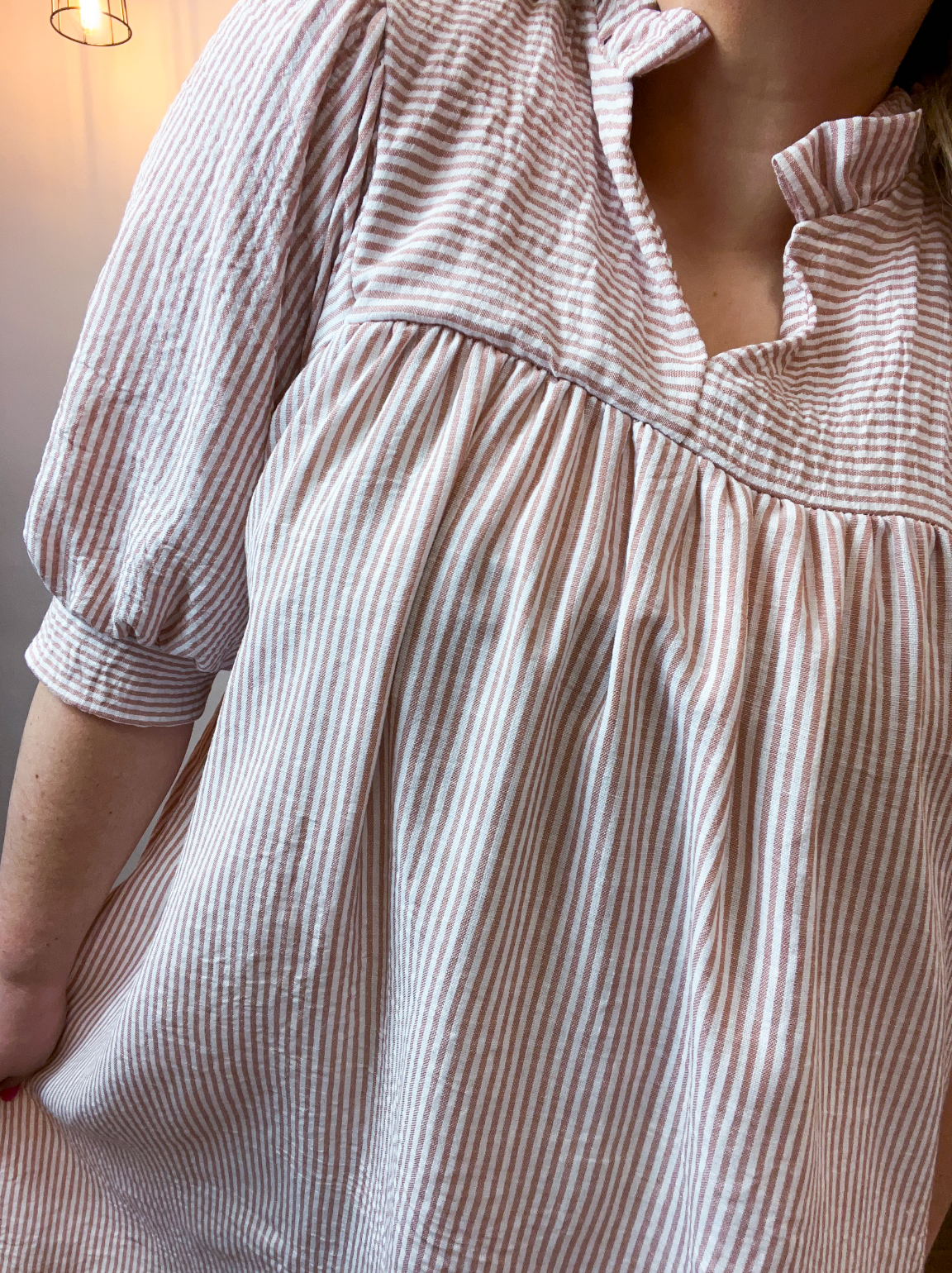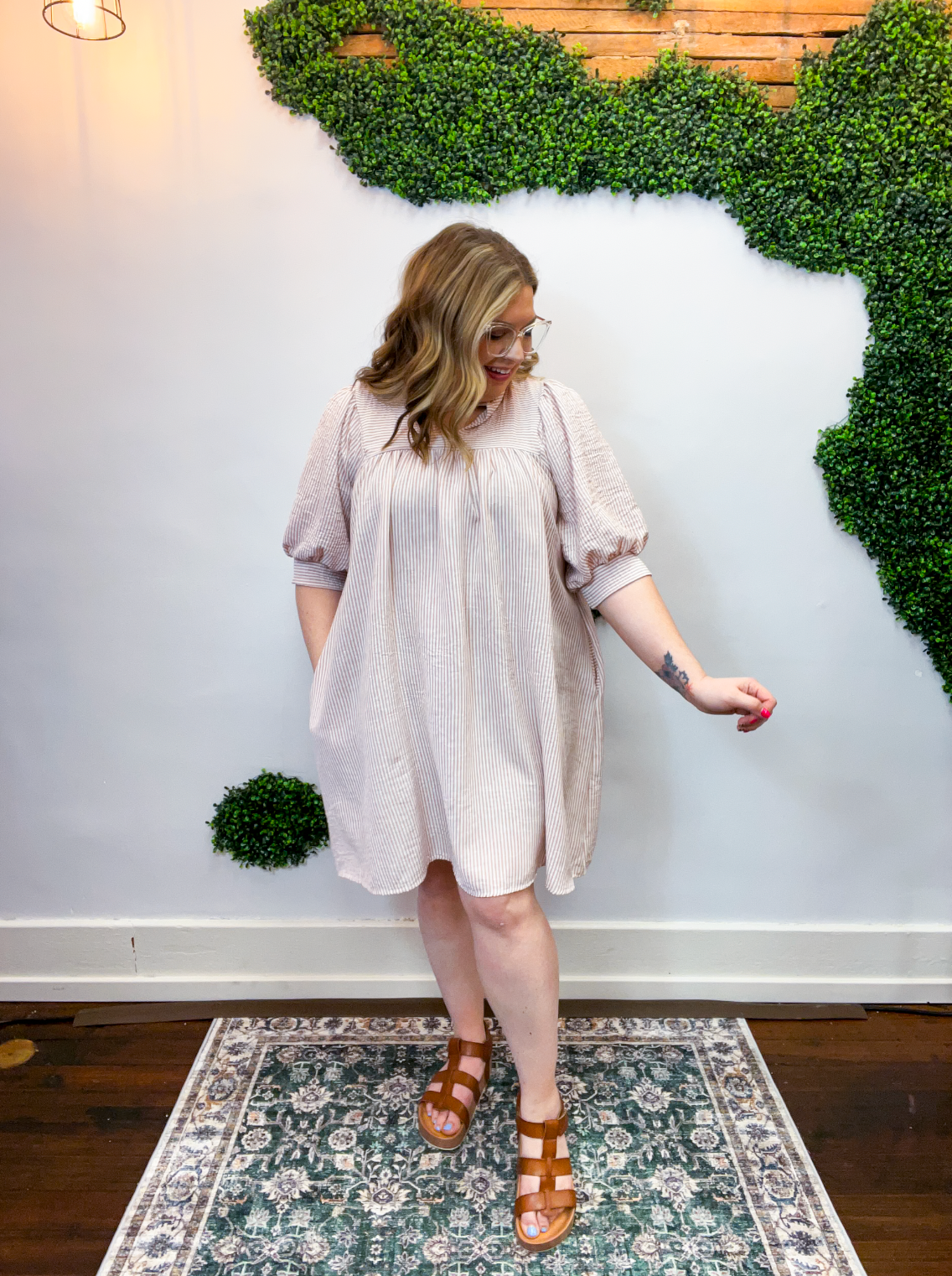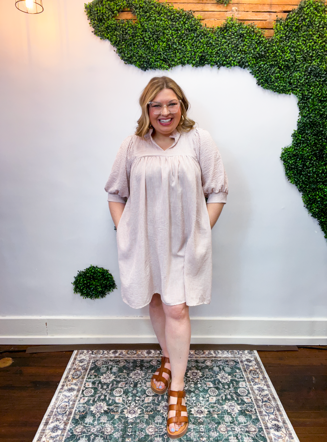The Pretty Please Pinstripe Dress is one of those easy yes kind of styles — comfy, cute, and ready for whatever your day brings. With its relaxed shift silhouette and soft pinstripe fabric, it gives you that effortlessly put-together look without trying too hard. The frilled notch neckline adds a feminine touch, while the bubble short sleeves bring just the right amount of charm.