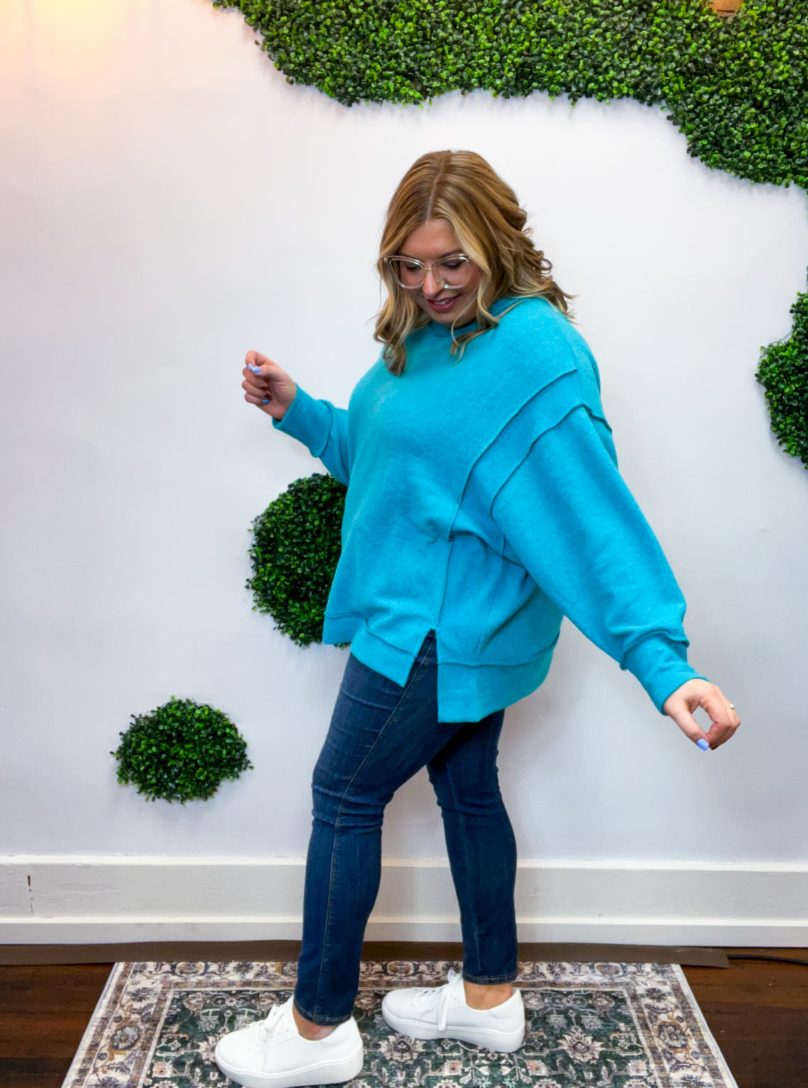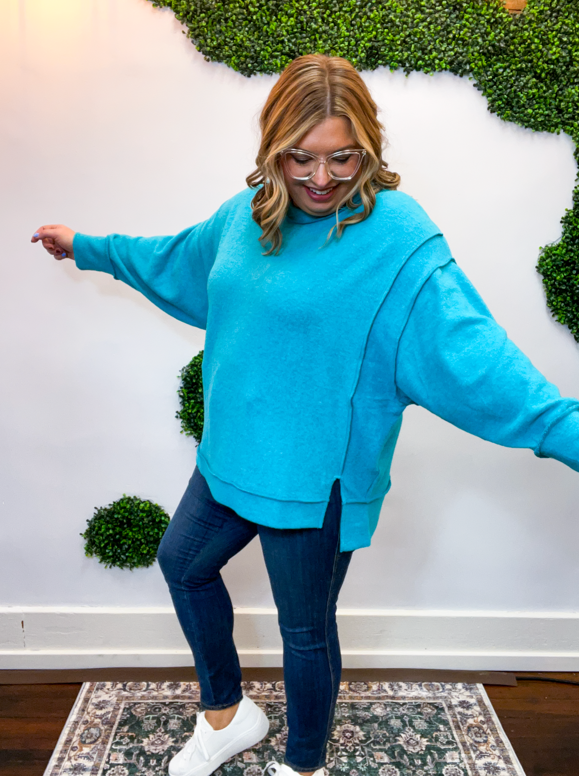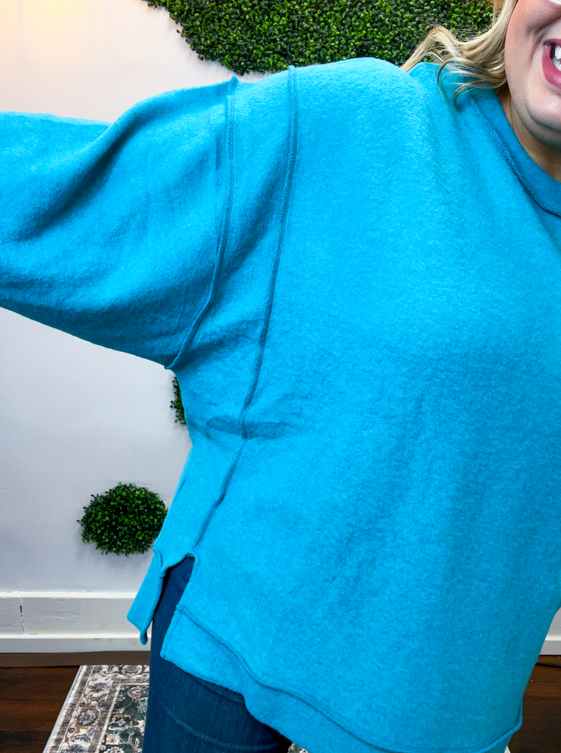 Designed with a laid-back oversized fit, easy side slits, and a hi-low hem, it moves with you while giving off that perfectly lived-in vibe. Exposed seams add a touch of casual charm, making it effortless, comfy, and just the right amount of cute.