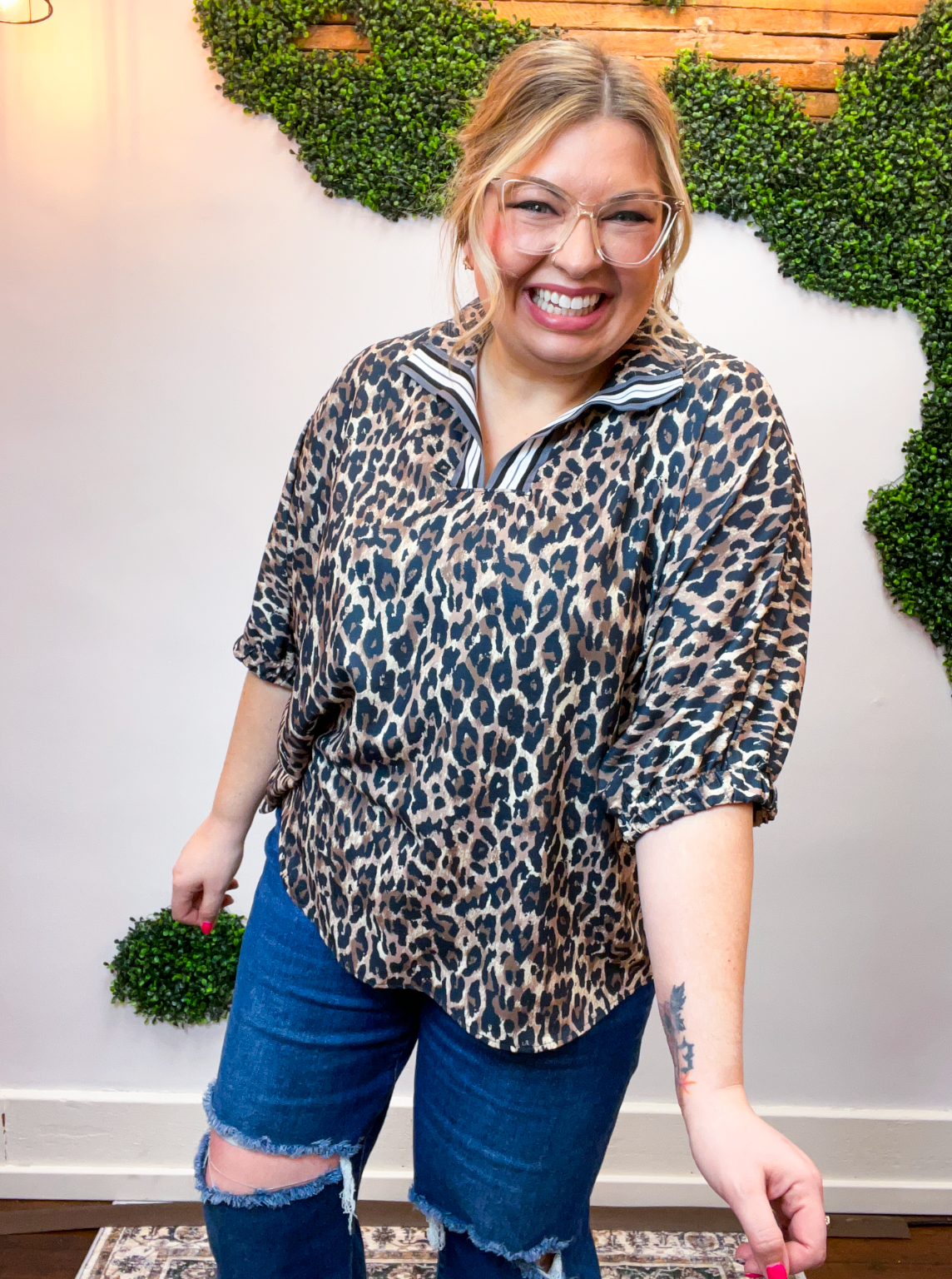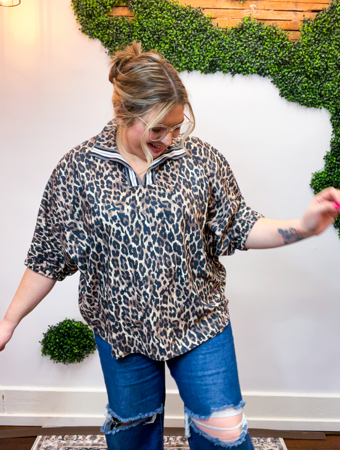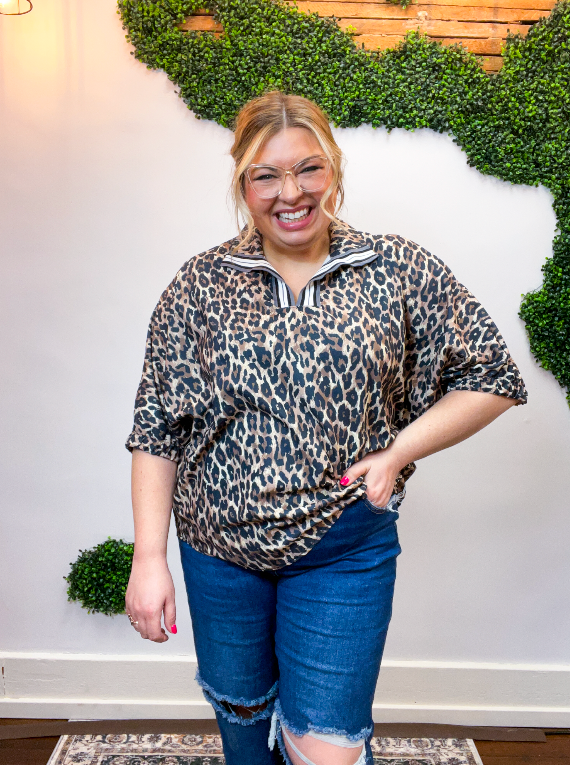 The Wild Card Stripe Collar Top is a total game changer — bold, effortless, and made for those days when you want to feel put together without overthinking it. The playful leopard print brings all the fun, while the striped taped collar and notch neckline steal the spotlight and give this top its standout style.