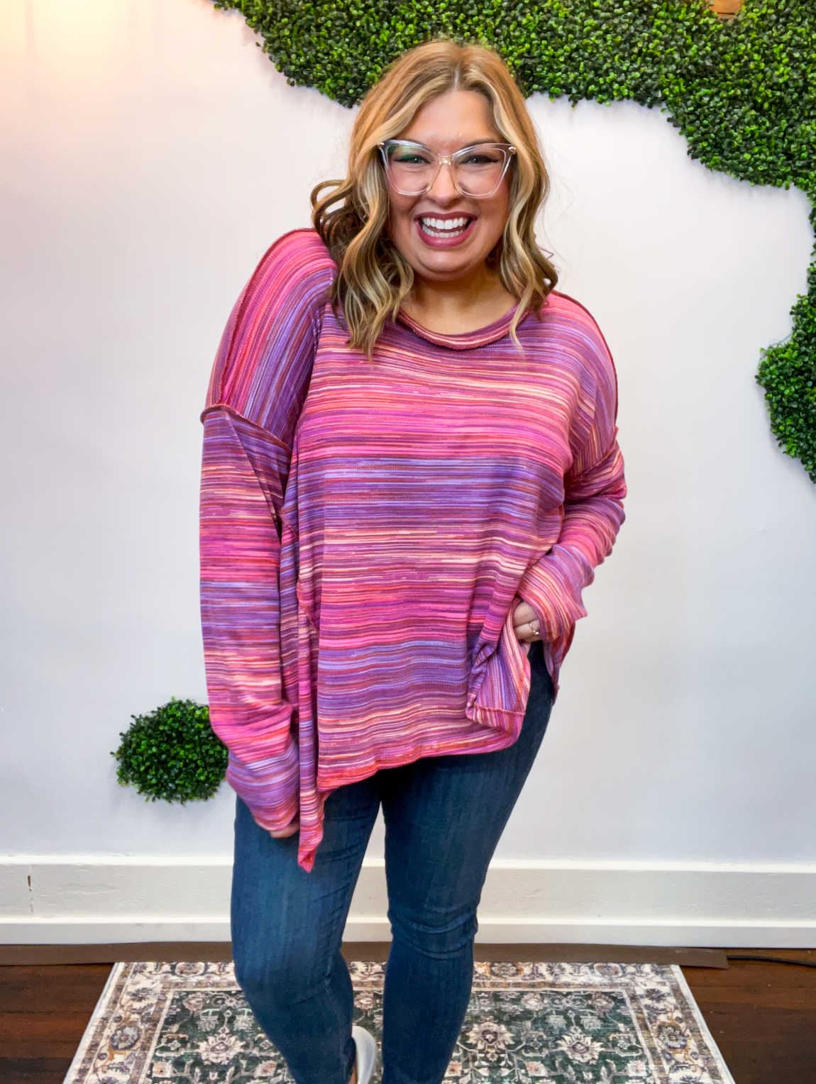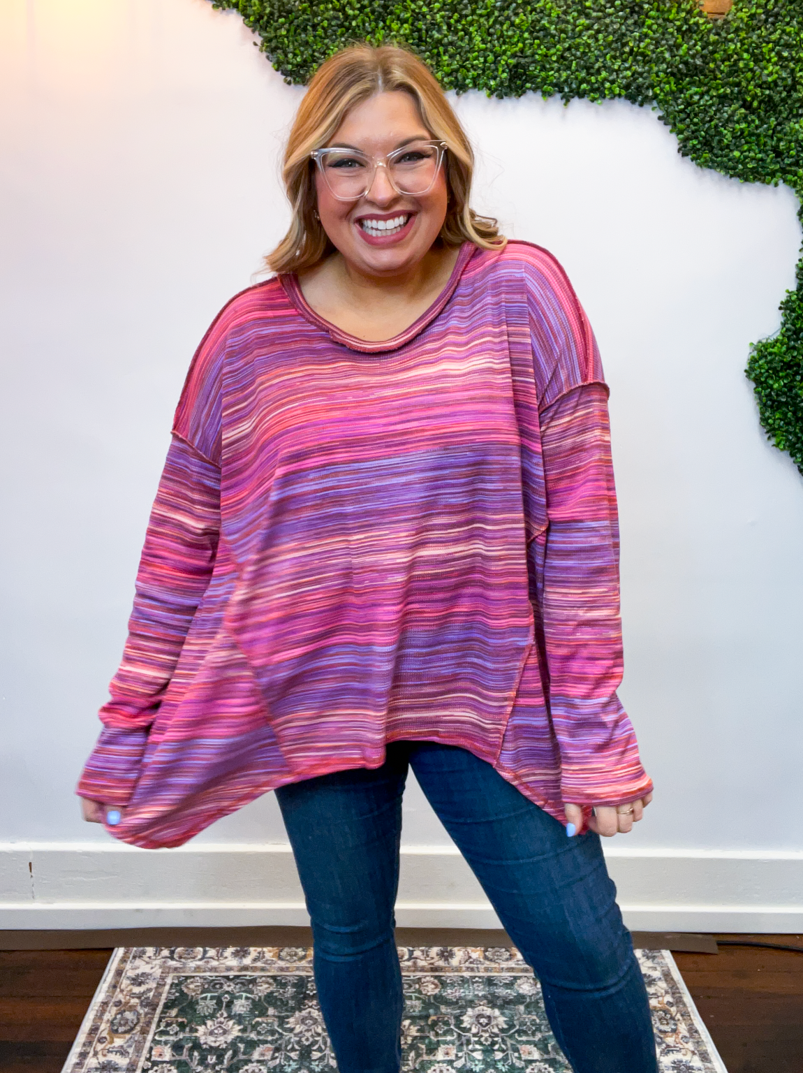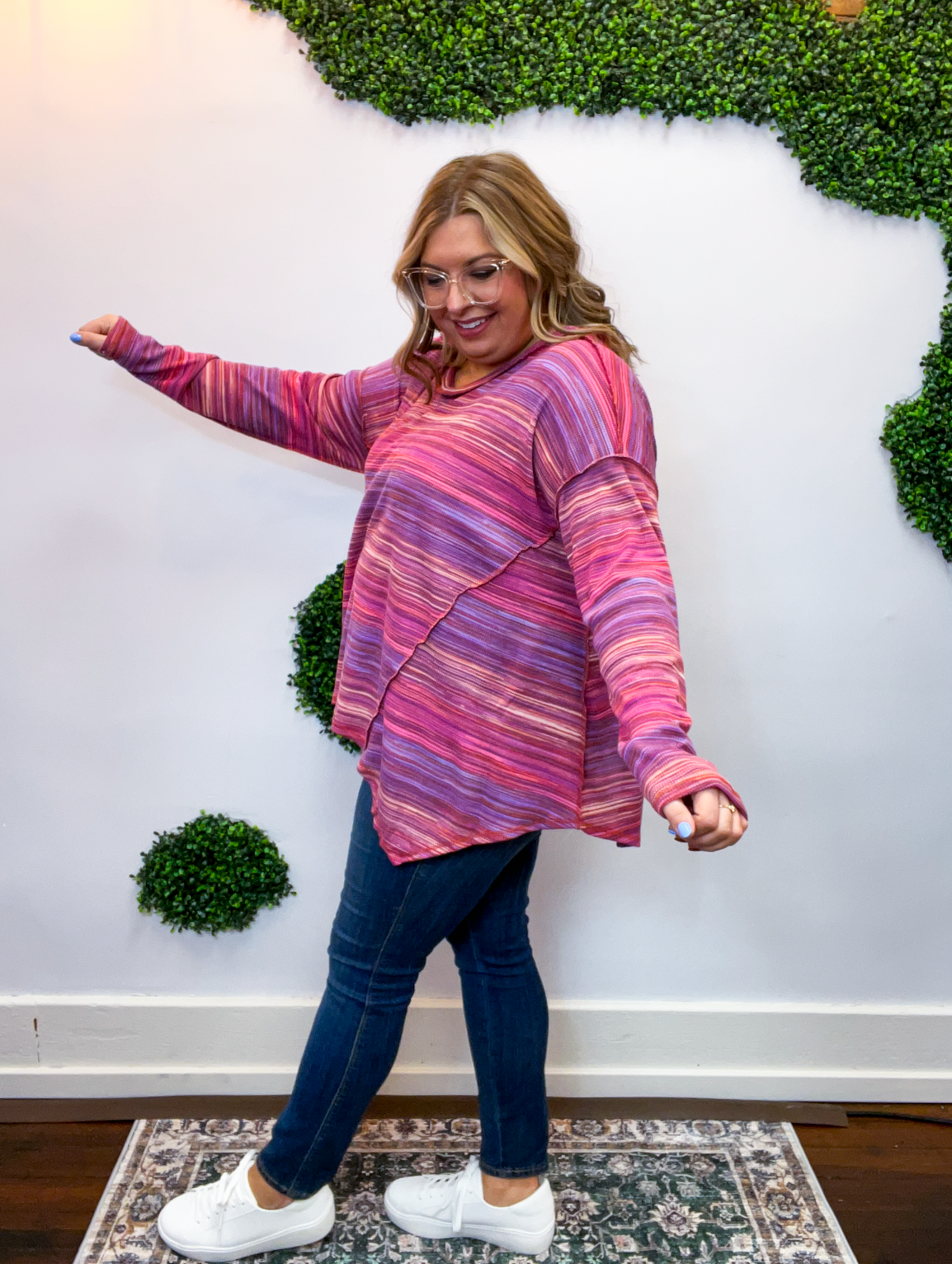 The Free Flow Stripe Sharkbite Top is all about effortless comfort with just the right amount of movement. Designed with a soft striped knit and a flowy sharkbite hem, it creates an easy, flattering shape that drapes beautifully without clinging. The outseam details add that subtle, lived-in touch we love — casual, comfy, and still pulled together.