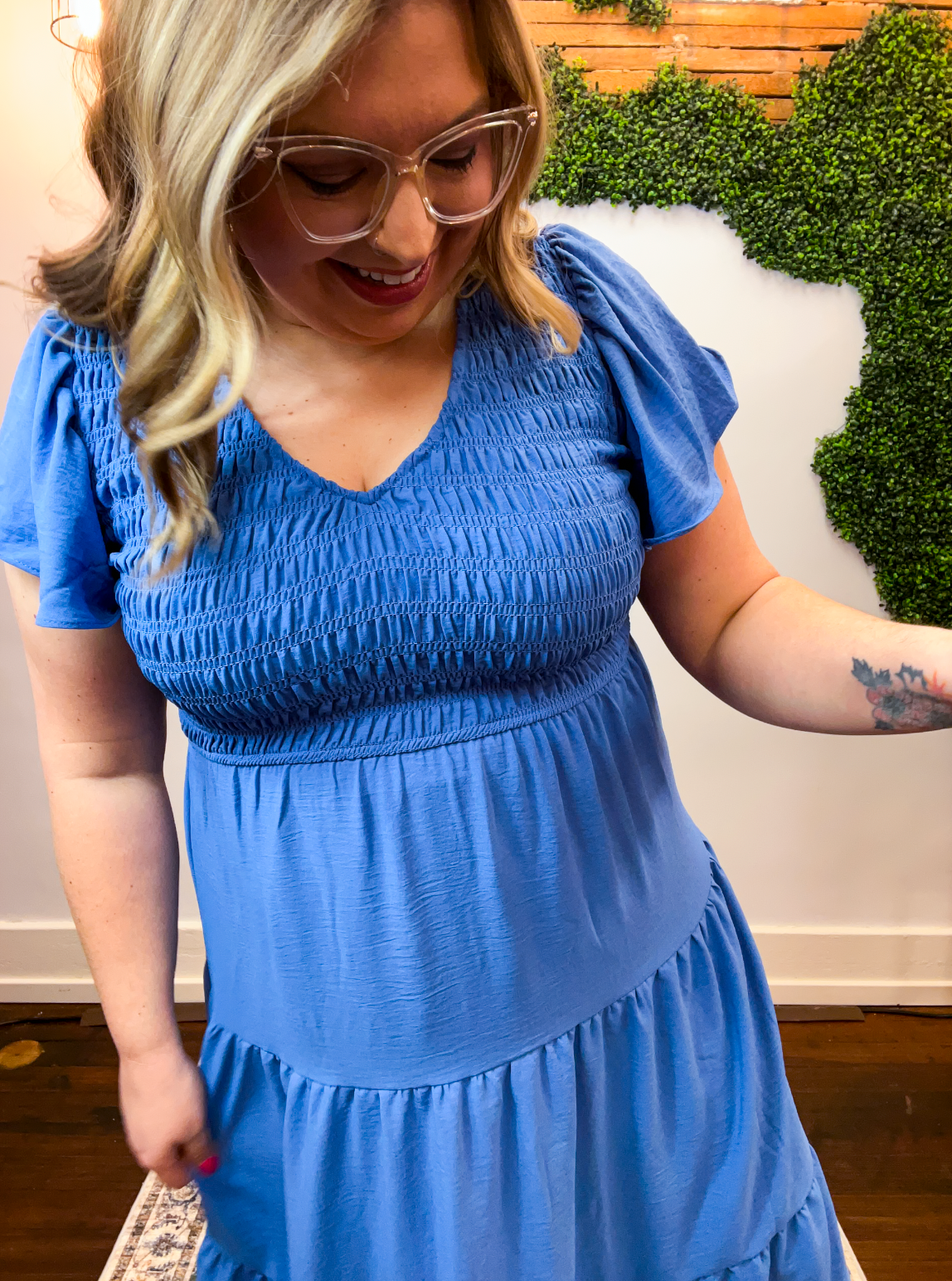 Main Street Moment Smocked Tiered Dress in Dusty Blue