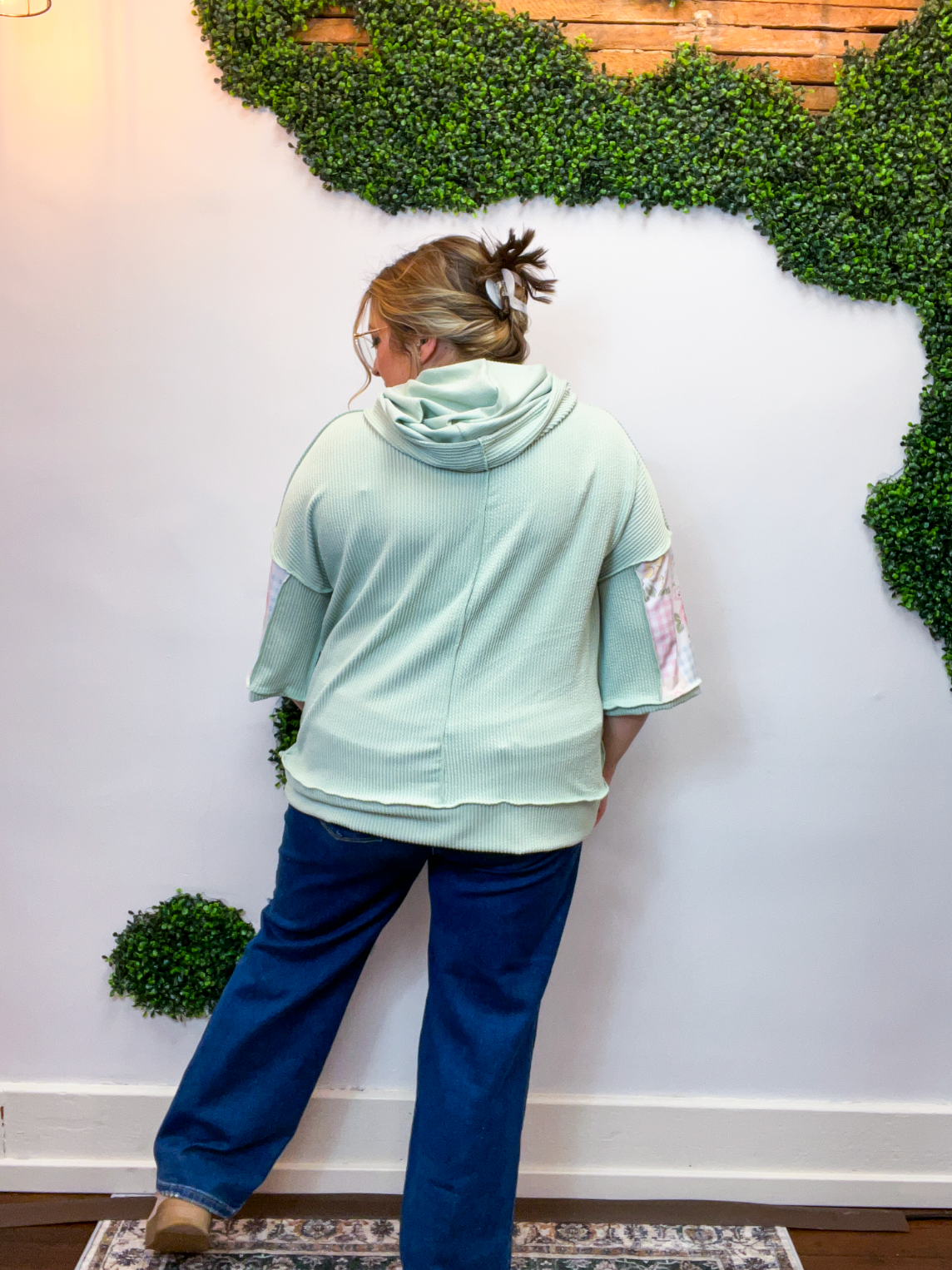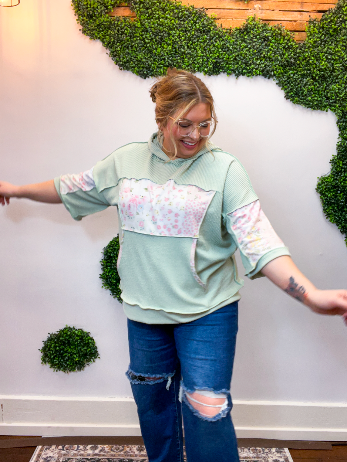 The Meadow Morning Patchwork Hoodie is soft, cozy, and made for those true throw-on-and-go days — the kind where comfort is non-negotiable, but you still want to feel cute. The sage waffle knit gives it that relaxed, lived-in feel, while the pastel floral patchwork details add a sweet, subtle pop that keeps things feeling fresh and fun.