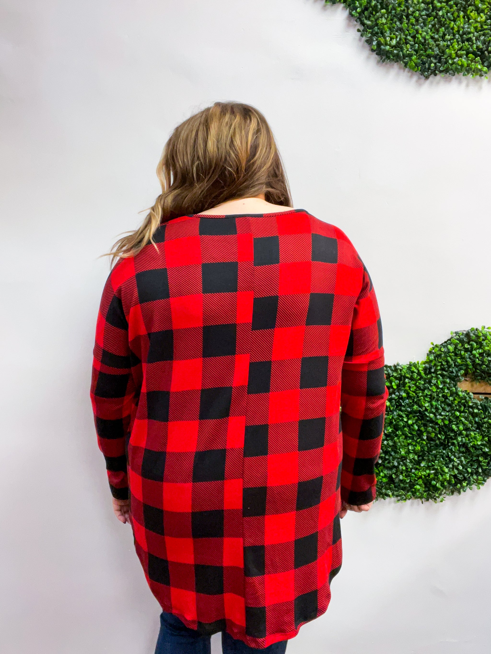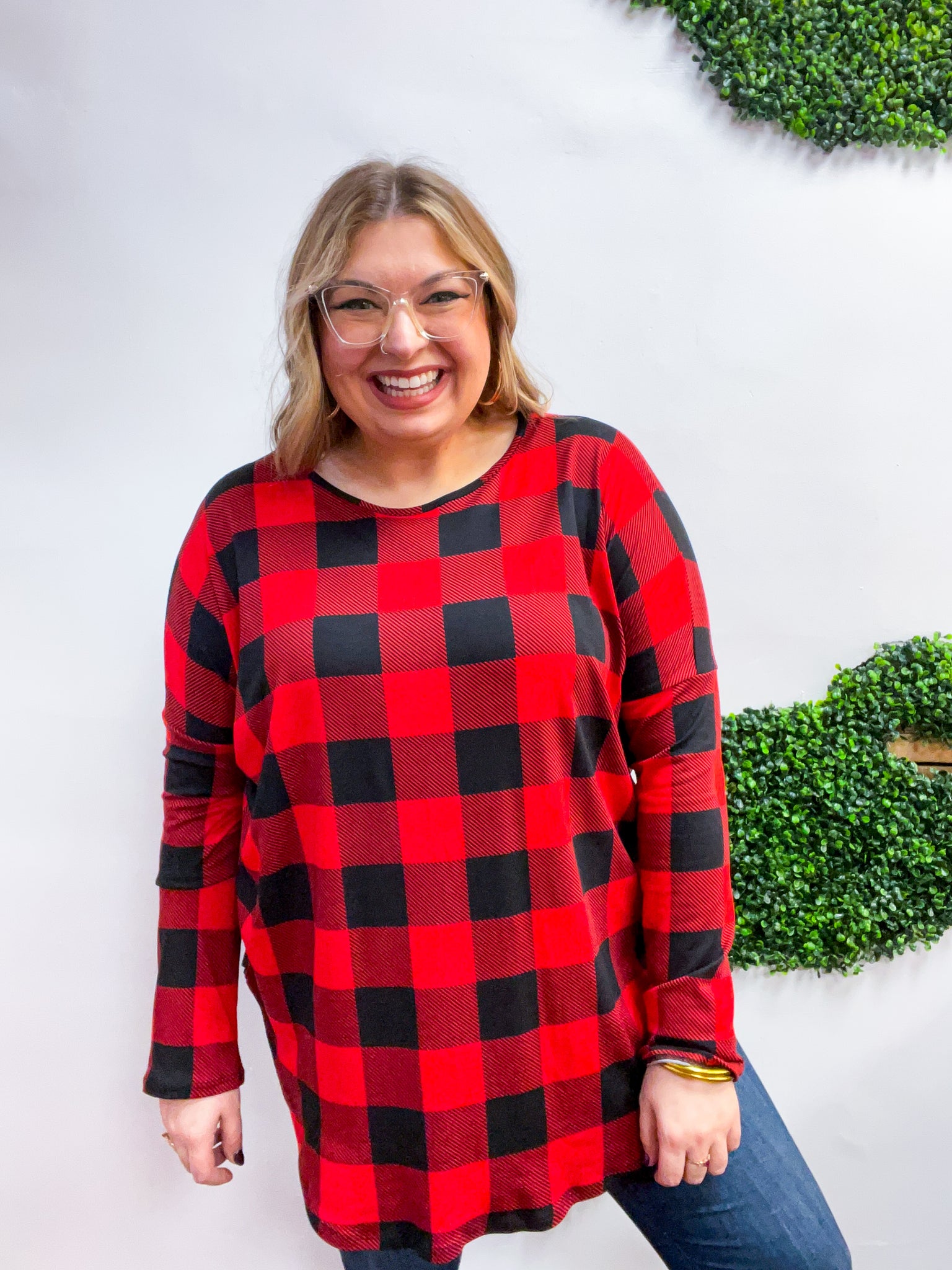 The Merry Moments Plaid Tunic brings cozy charm and classic holiday vibes all in one. With its timeless red and black plaid pattern, this tunic is made for those easygoing days that still call for a little style. Crafted from soft, lightweight French terry, it drapes beautifully with a loose, flowy fit and a flattering rounded hem—perfect for pairing with leggings, denim, or even a little festive sparkle.