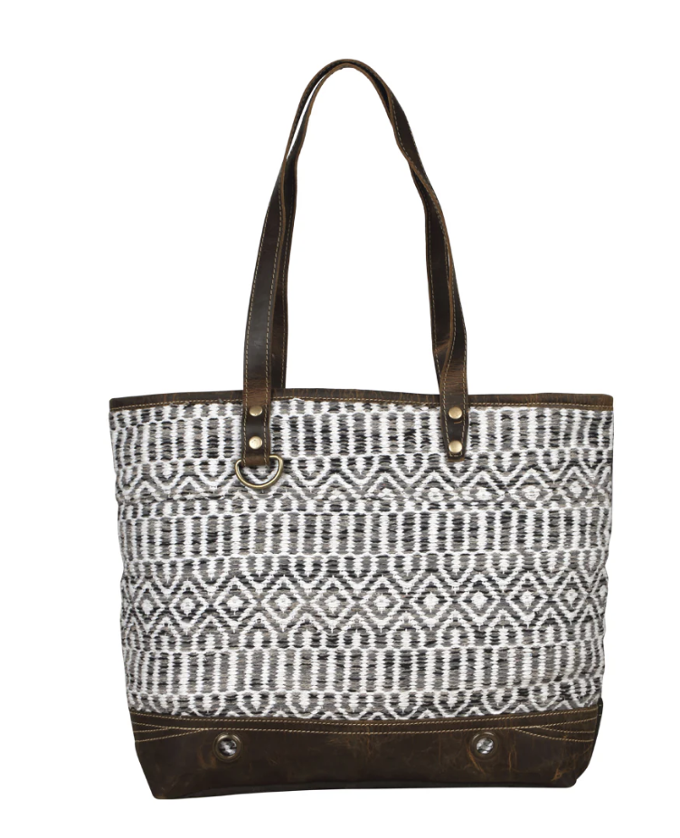 Designed with a spacious main compartment and reinforced leather accents, it offers a stylish balance of function and sustainability. Each tote is uniquely made from up-cycled materials—meaning no two bags are exactly alike, and every piece has its own character.