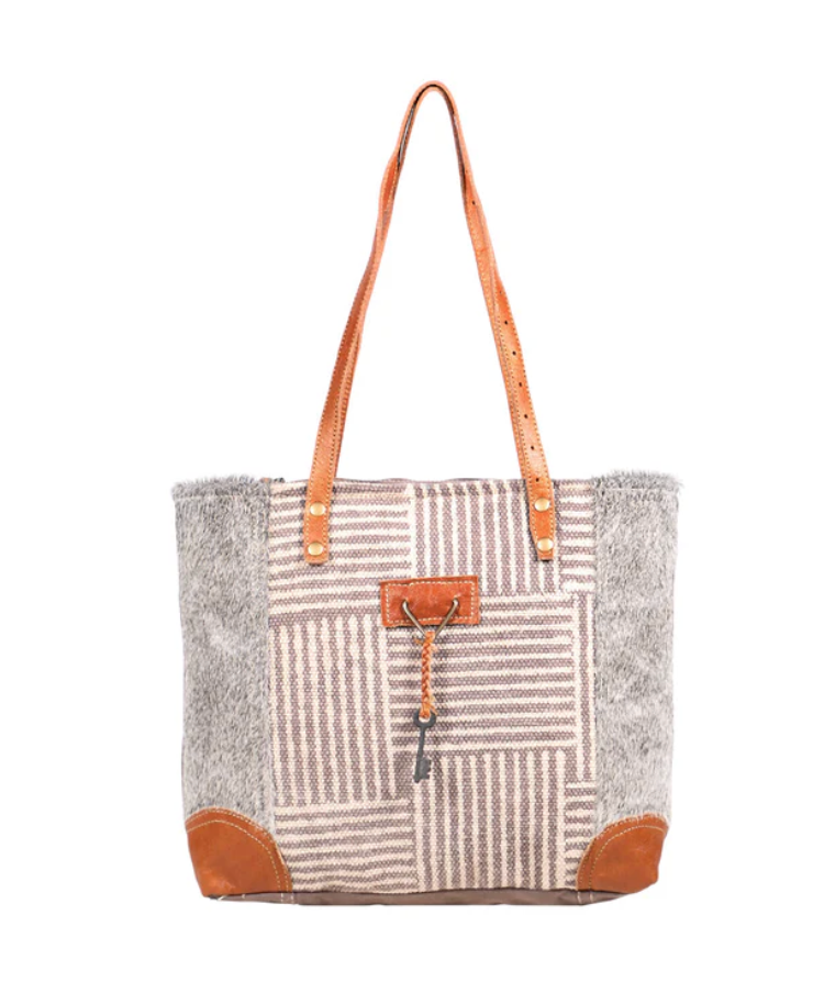 Here appears a tote wearing a sober look just to add beauty to the personality of the user. The uneven pattern used in the center with a boundary of grey hair-on leather and some leather patches makes it all the more interesting. Inside pockets add to the storage