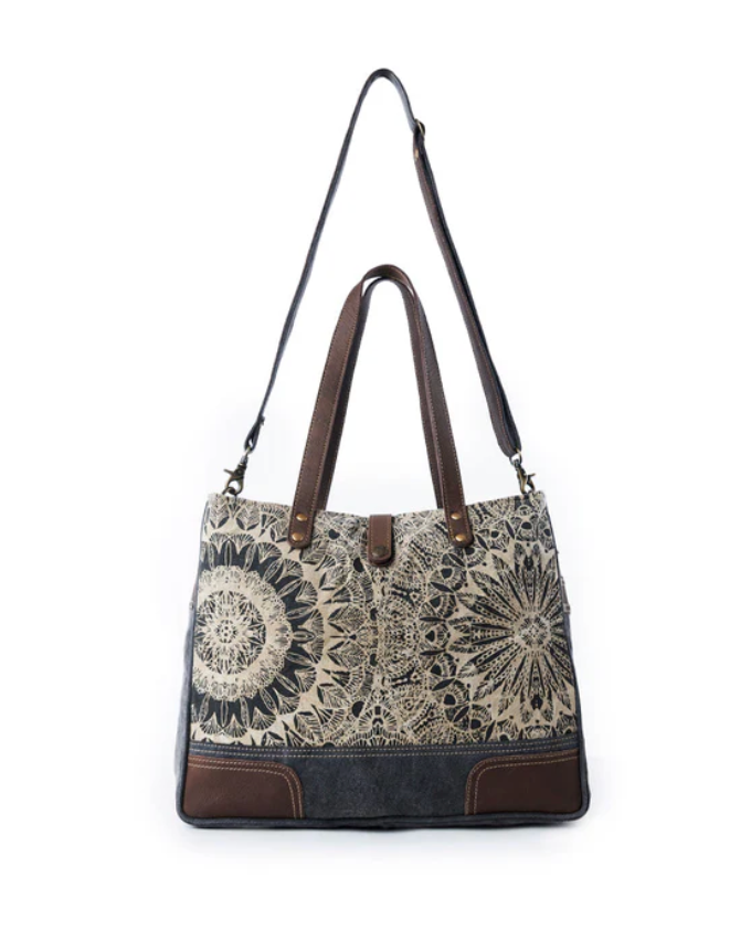 • Color: Gold/black mandala print canvas and dark olive canvas with brown leather trim