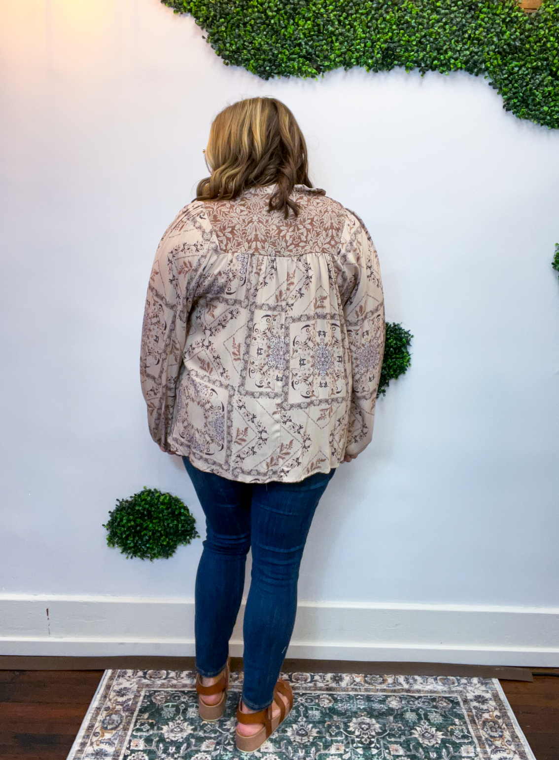 The Sunny Prairie Frill Top is easy, breezy, and full of that throw-on-and-go charm we all love. With its soft frill mock neckline, flowy peasant silhouette, and patchwork-inspired print, this top feels relaxed yet still perfectly pulled together — the kind of piece that makes getting dressed feel effortless.