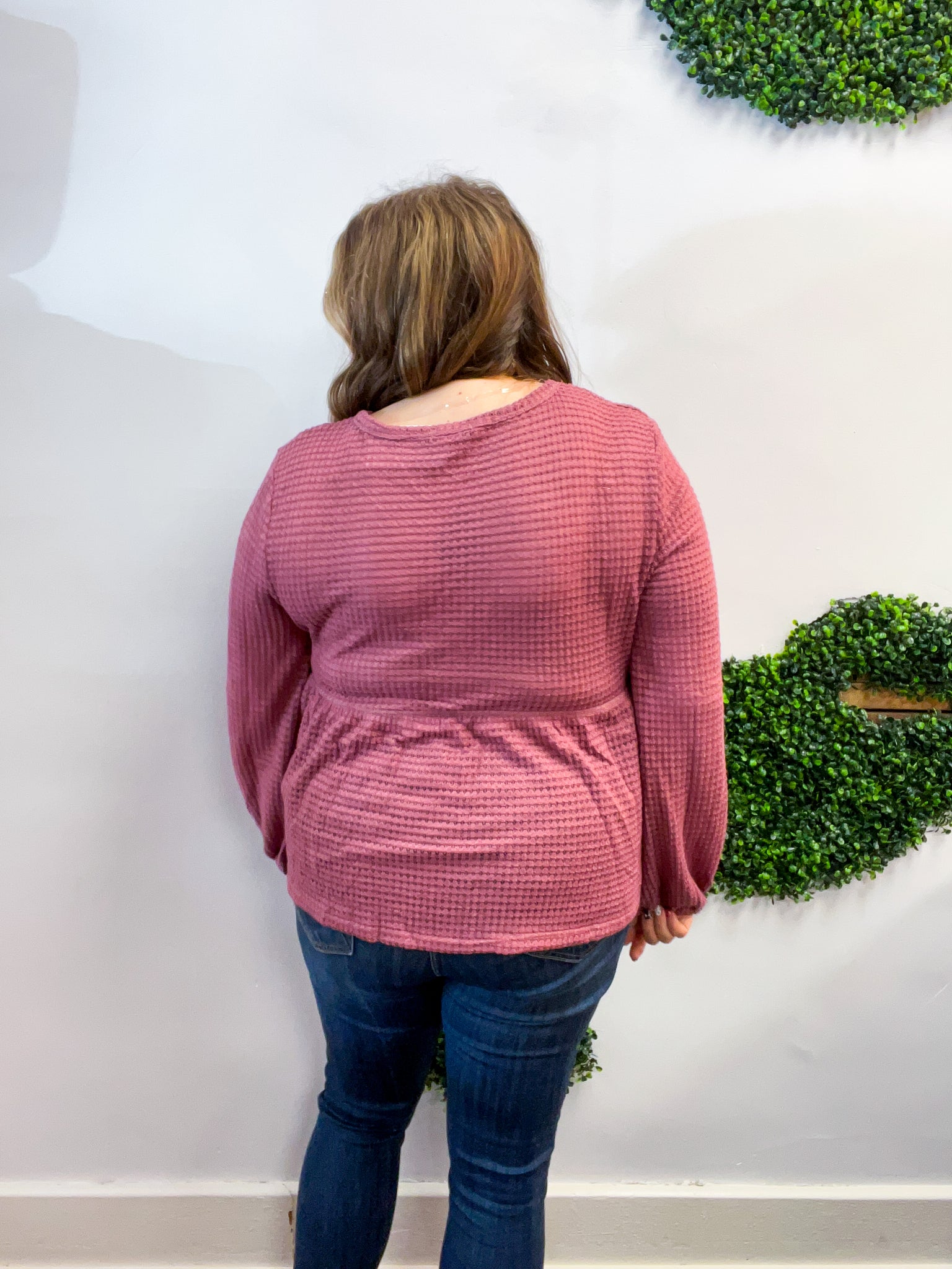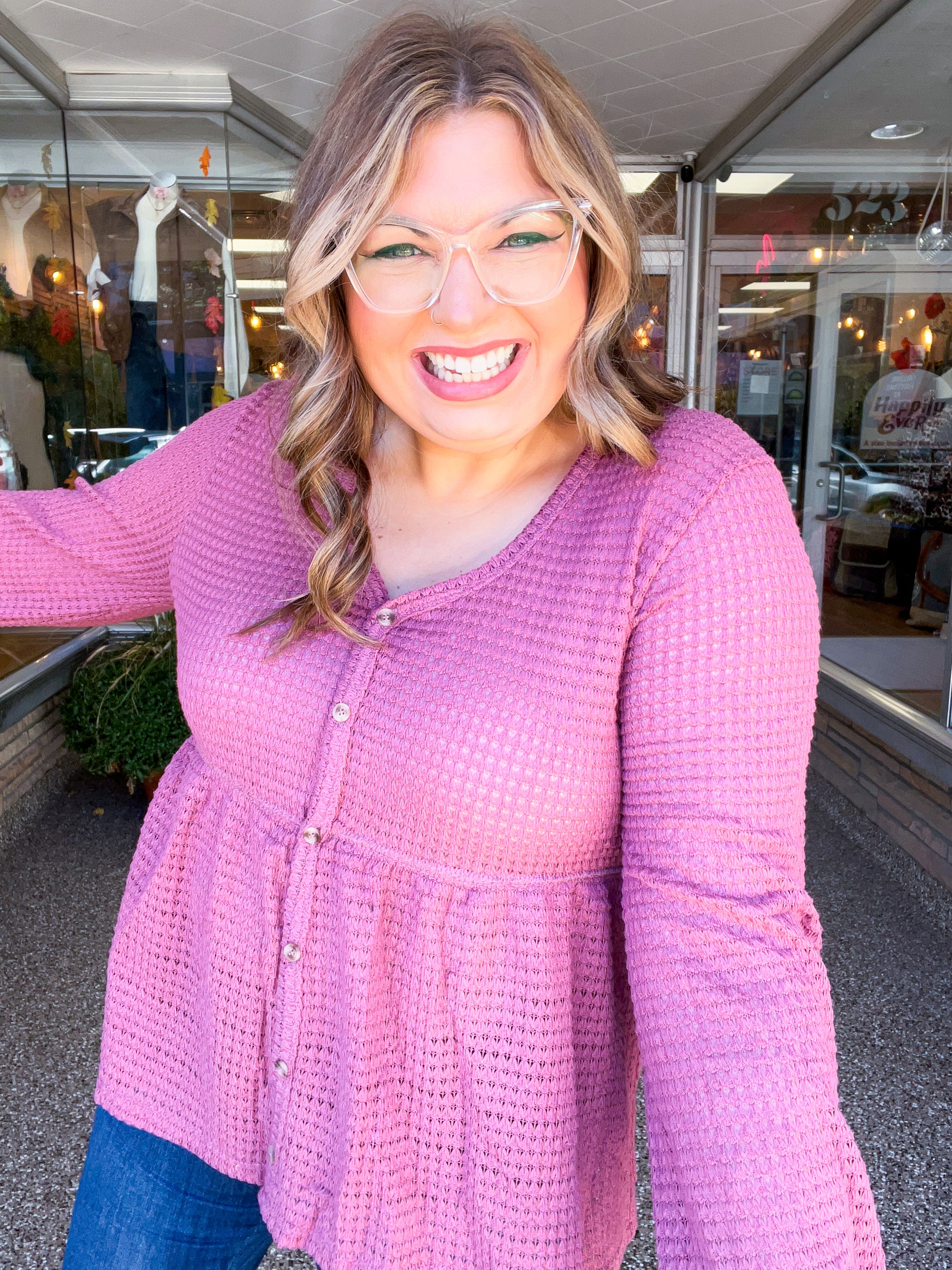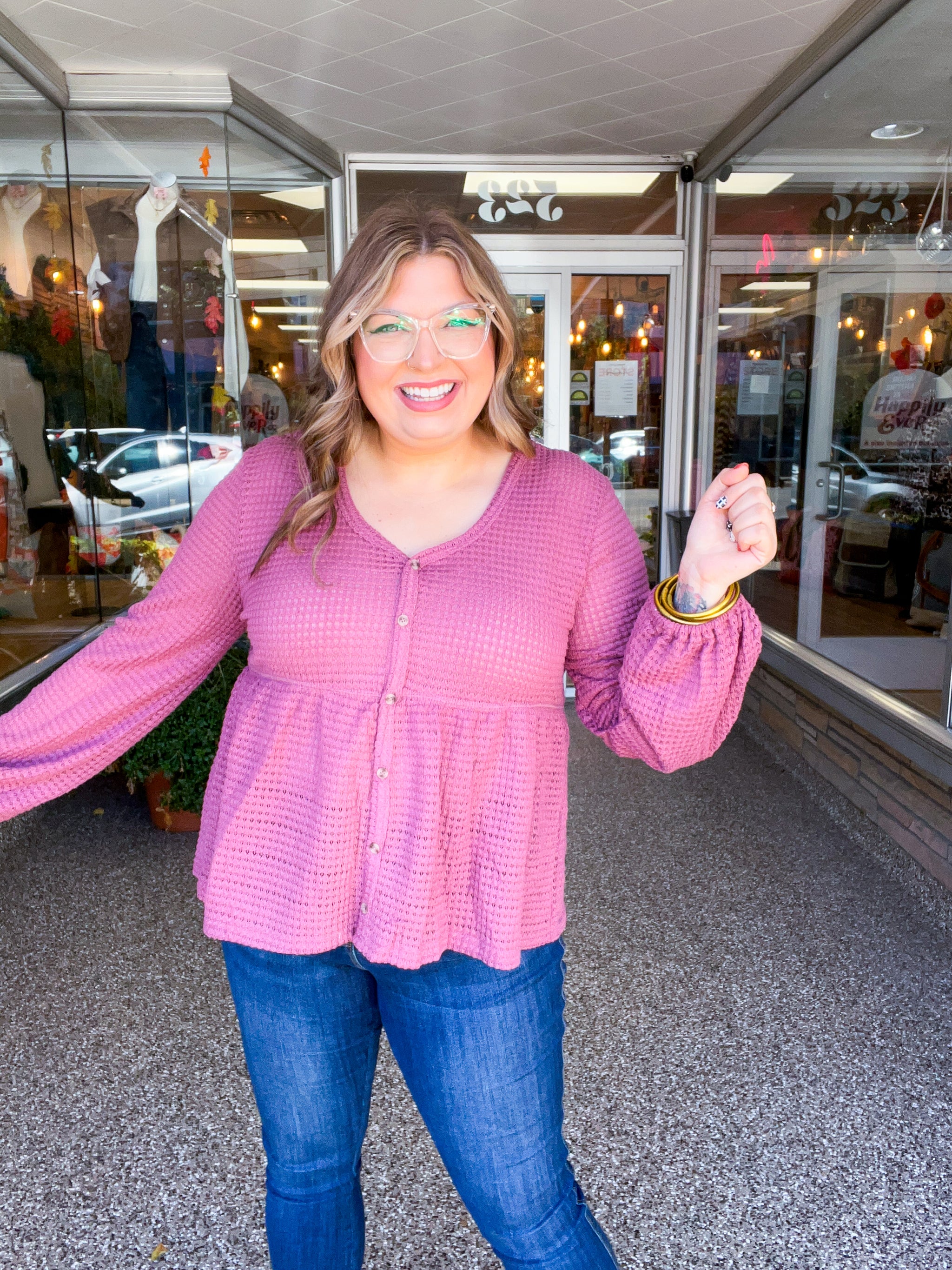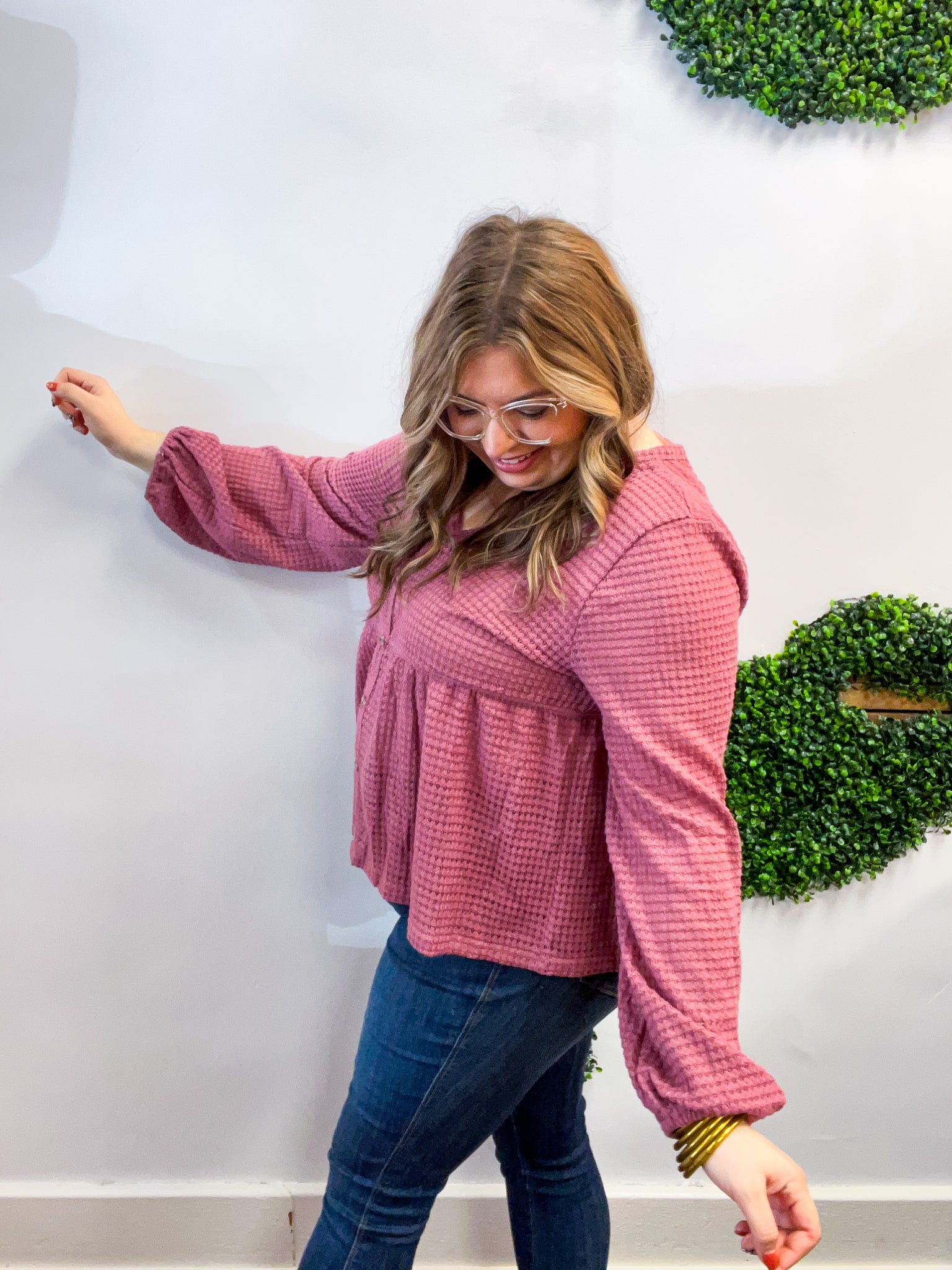 The Waffle Weather Babydoll Top is cozy-meets-cute perfection. Made from a soft oversized waffle hacci knit, it drapes effortlessly for that “comfy but put together” look we all love. The subtle ruching detail creates a sweet babydoll silhouette, giving it just the right amount of flow and charm.