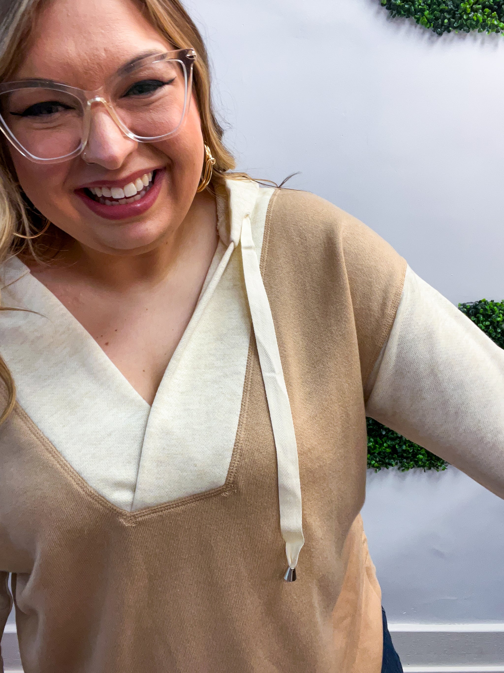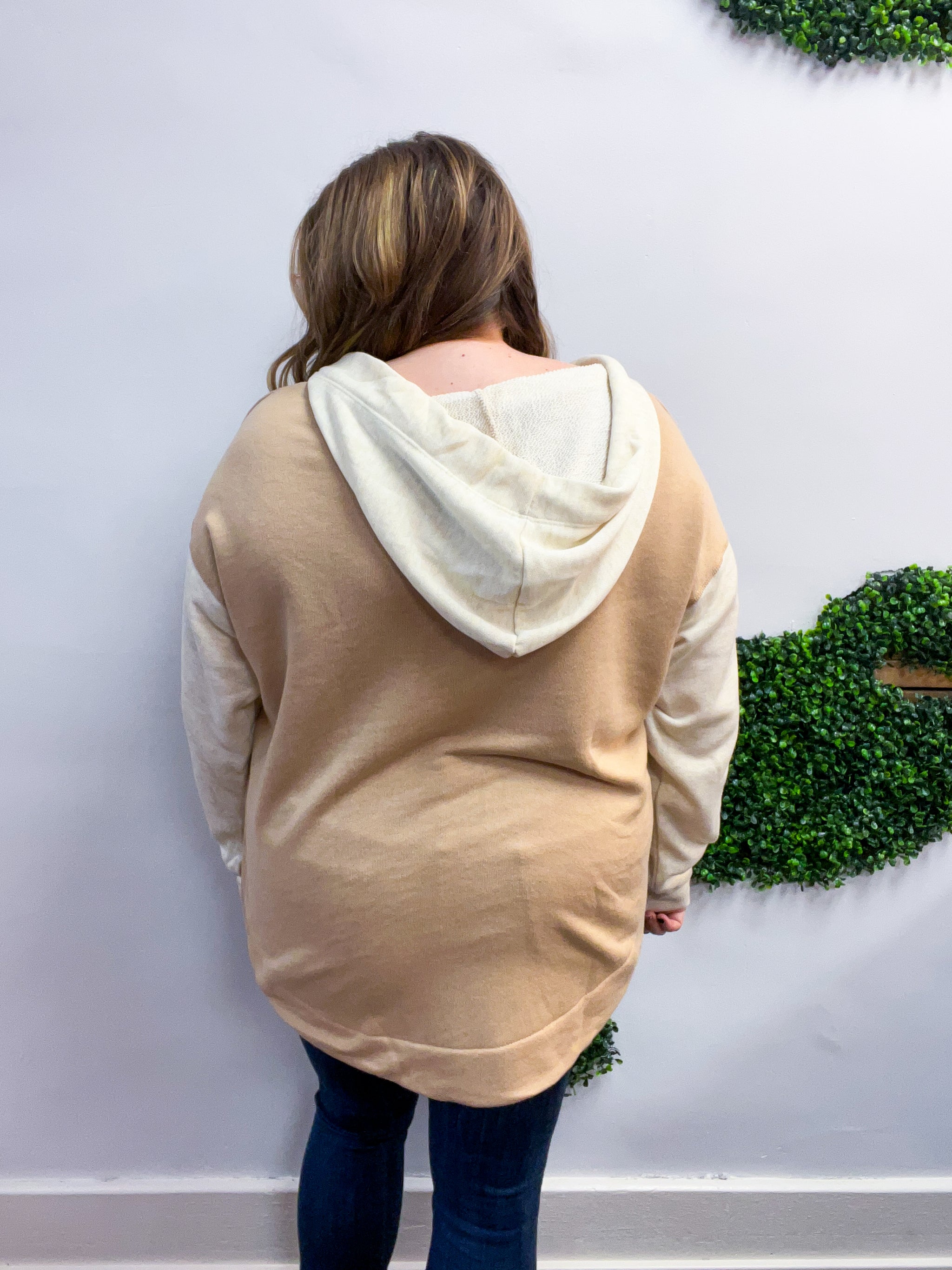 The Warm Embrace Hoodie is the definition of cozy meets cute. With its soft oatmeal and camel color block design, it’s like wrapping yourself in a wearable hug—warm, comfy, and effortlessly stylish. The notched neckline adds a relaxed touch, while the drawstring hood and oversized fit make it perfect for laid-back days that still call for a little polish.