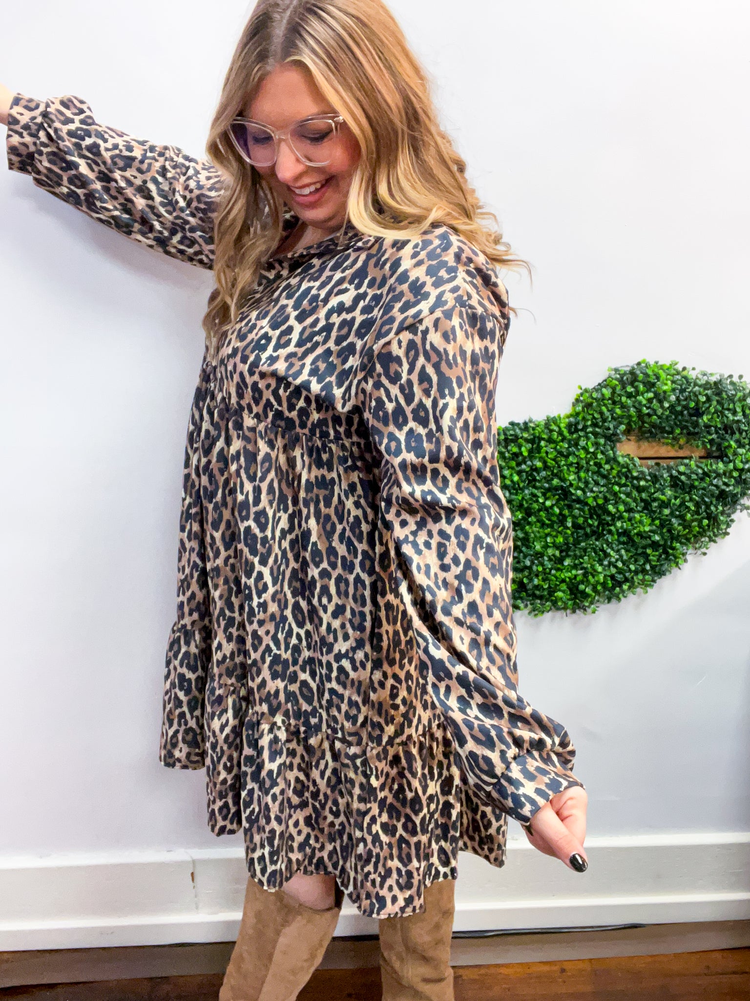 The Wild at Heart Babydoll Dress lets your playful side shine with just the right mix of flirty and fun. Featuring a bold leopard print and a flowy, swingy fit, it’s the kind of dress that makes you feel confident the moment you slip it on. The collared notch neckline and long sleeves add a touch of polish, while the easy babydoll silhouette keeps things light and effortless.